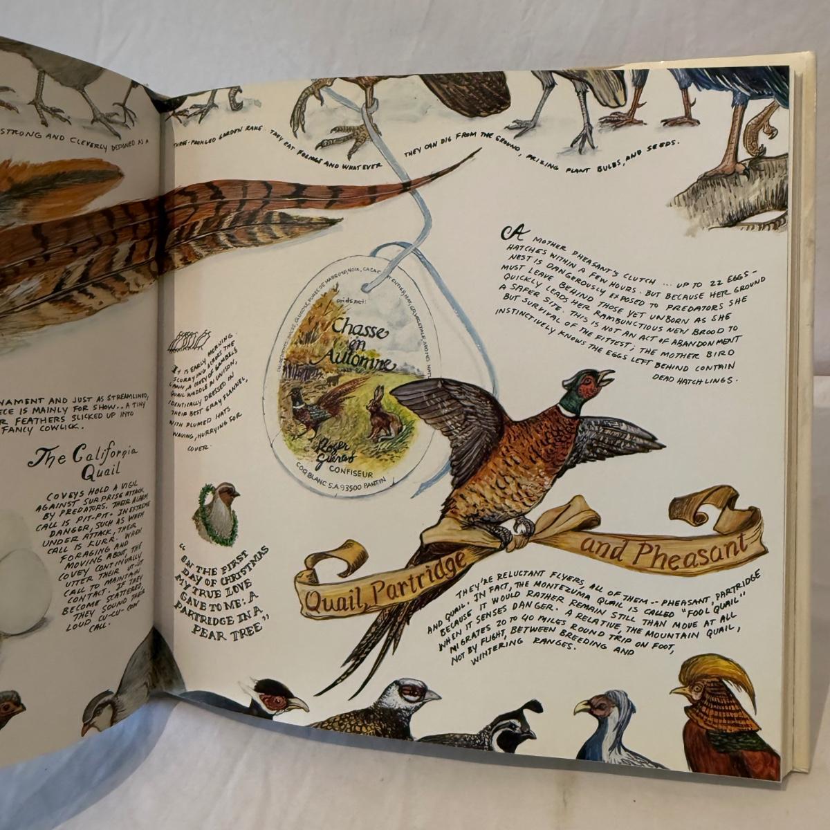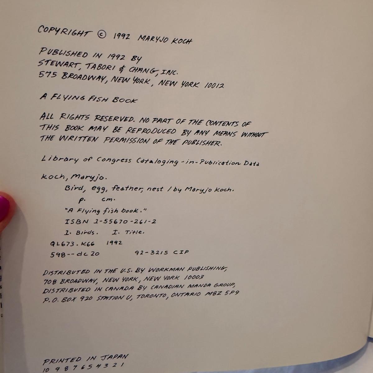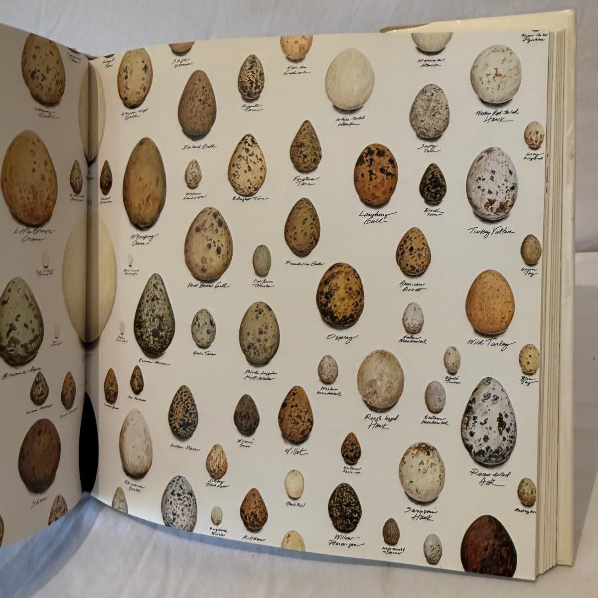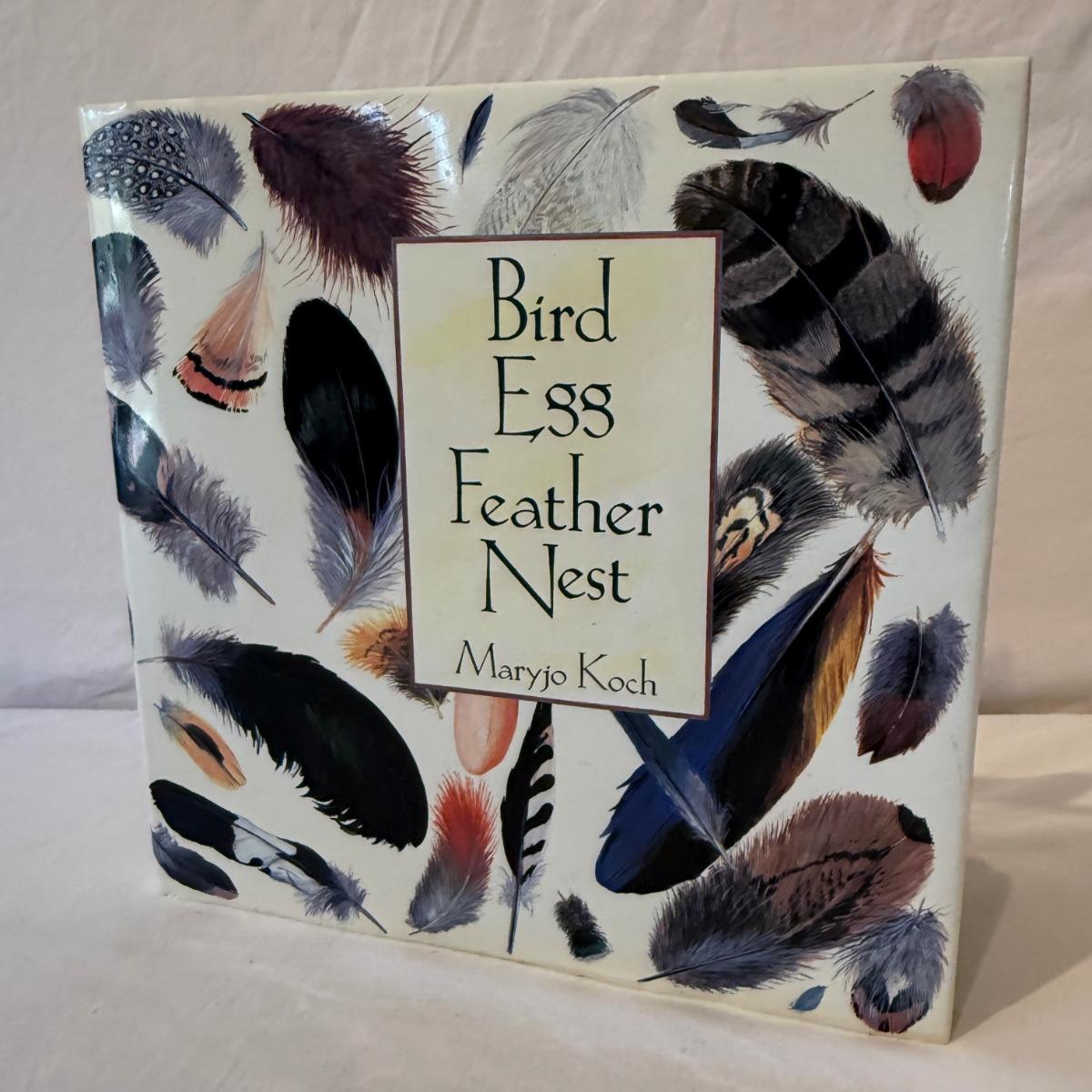 Two framed prints of artistic eggs, two tiles, and the book “Bird Egg Feather Nest”. The larger frame is ornate wood with a golden finish. It has some chips in the frame and the frame measures 14.5” x 18.5”. The smaller frame is a beautiful inlaid design in a wood border. A small chip is seen on the corner and the back is taped on. Both prints are framed behind glass. The two tiles have hardware attached to hang.