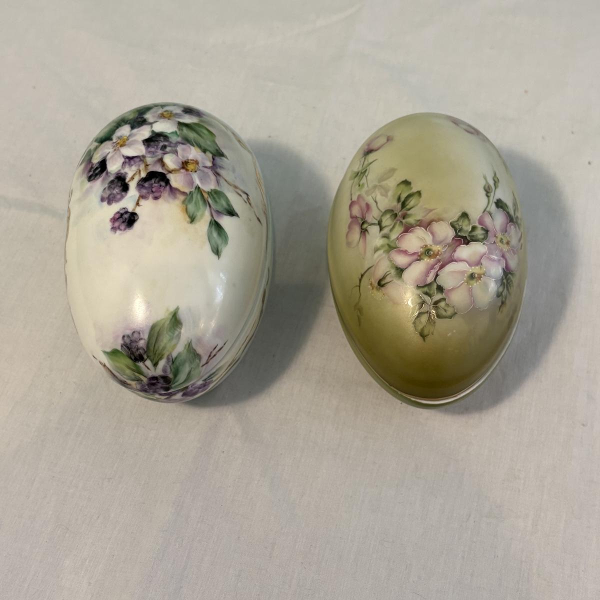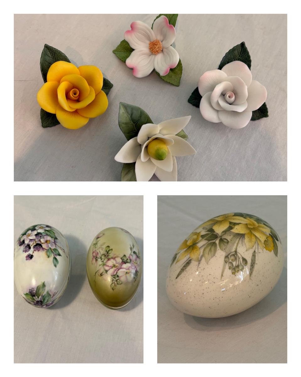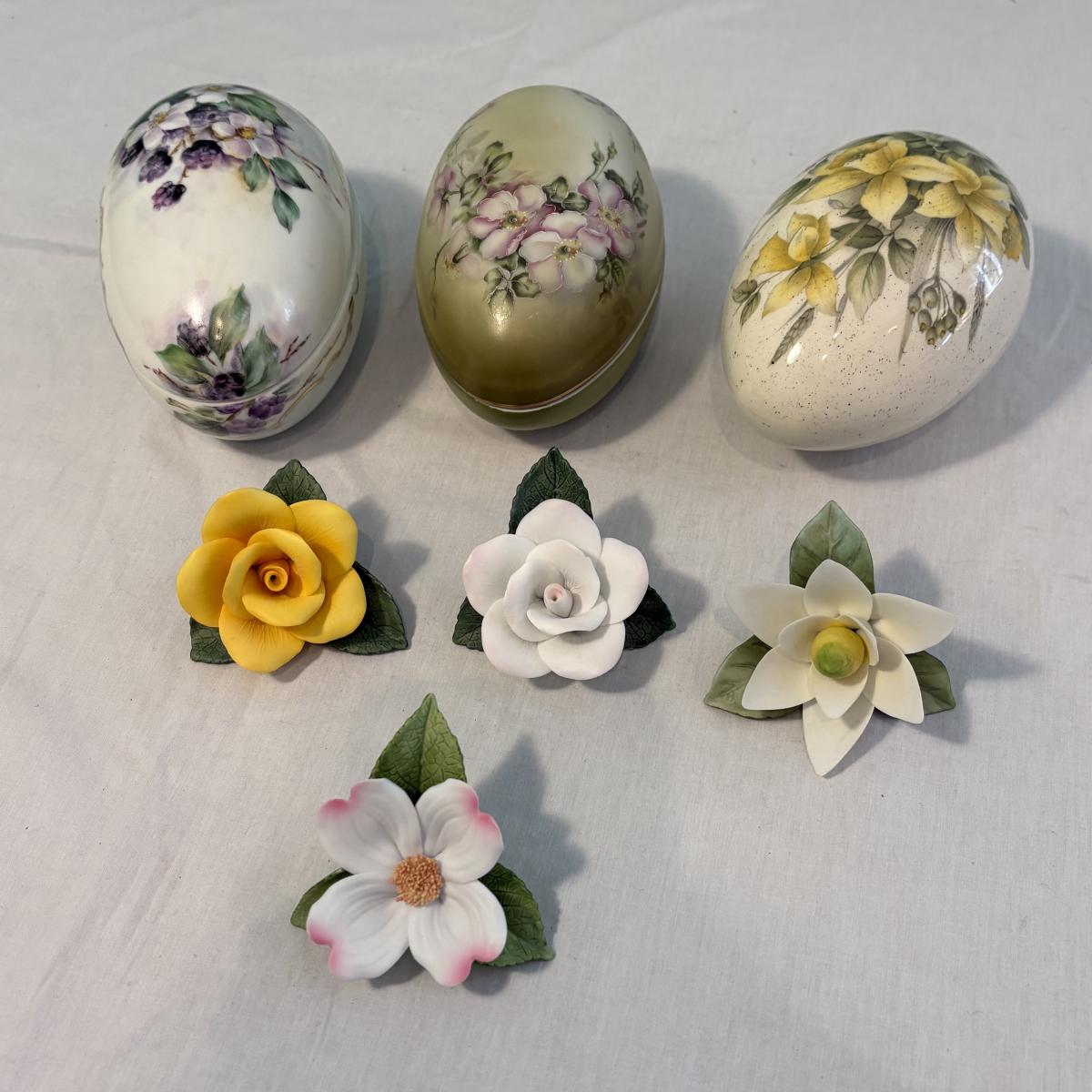 This kit features a collection of four porcelain flower collectibles by Andrea by Sadek, two egg shaped porcelain trinket boxes by Celine & Nippon, and a ceramic decorative egg with a floral motif. The Celine trinket dish, which is the larger of the two, has measurements of approximately 5.5" x 3" x 3.5"H. The flower figurines are approximately 3" each. There are several paint blemishes on them, see pictures for reference.
