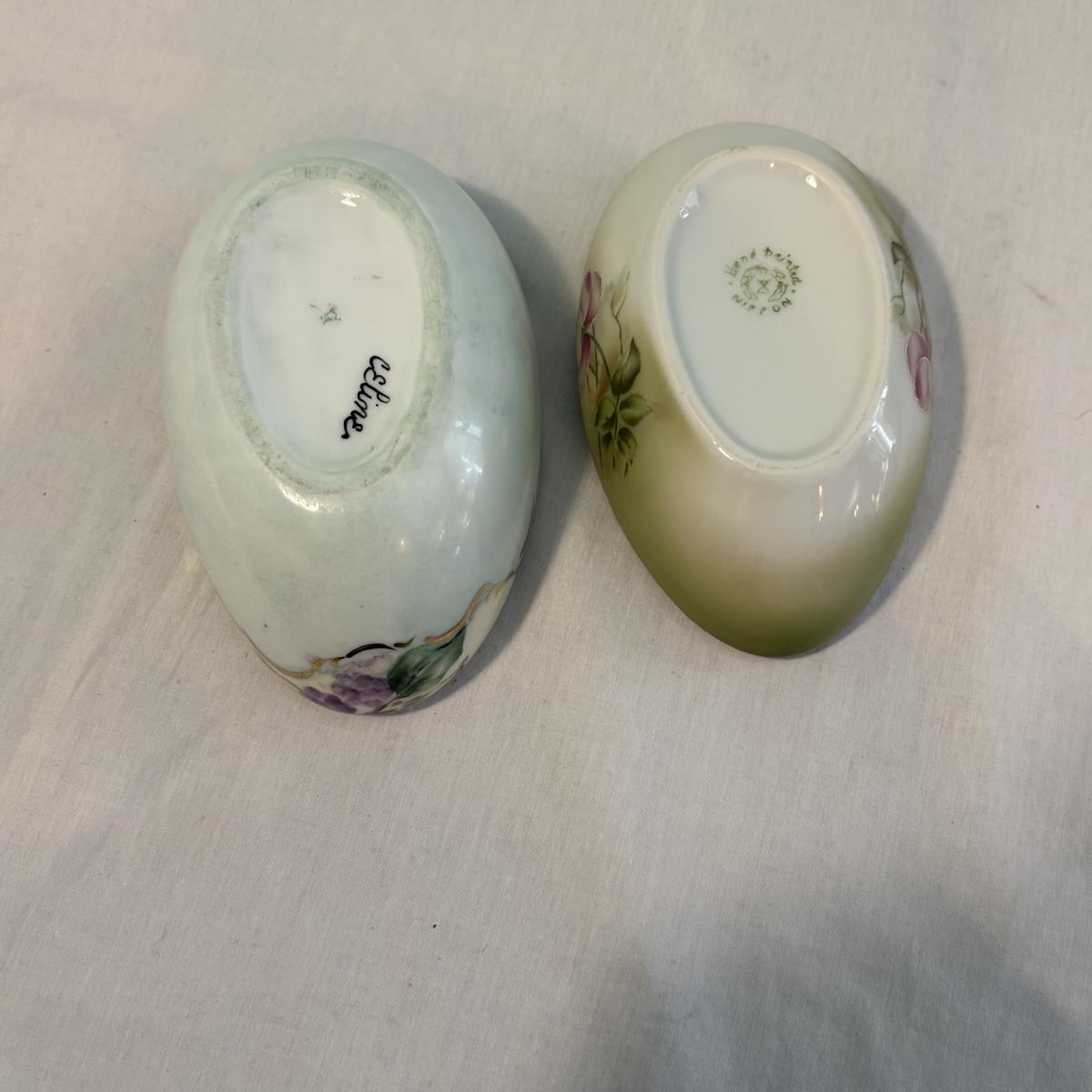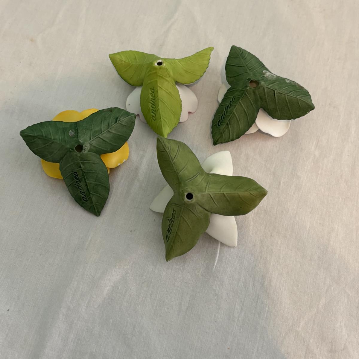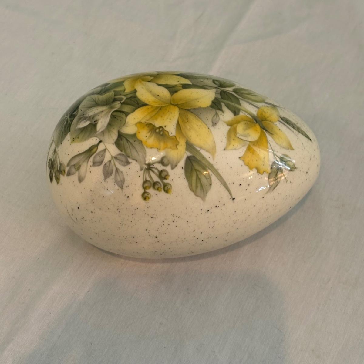 This kit features a collection of four porcelain flower collectibles by Andrea by Sadek, two egg shaped porcelain trinket boxes by Celine & Nippon, and a ceramic decorative egg with a floral motif. The Celine trinket dish, which is the larger of the two, has measurements of approximately 5.5" x 3" x 3.5"H. The flower figurines are approximately 3" each. There are several paint blemishes on them, see pictures for reference.