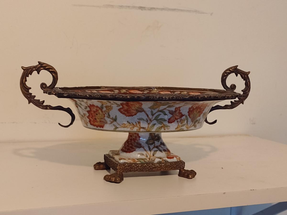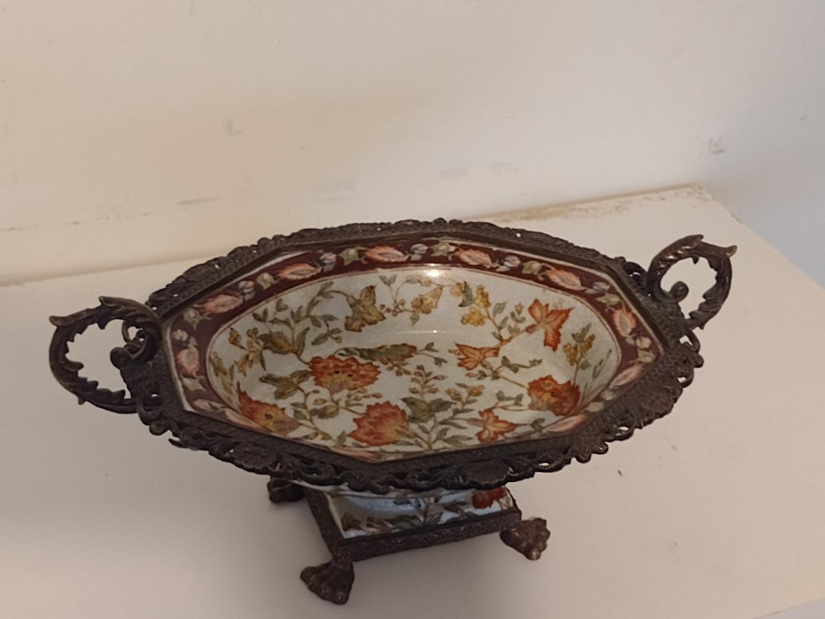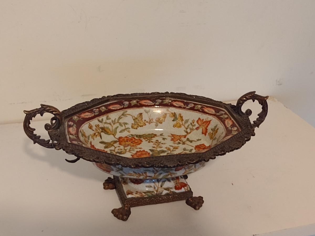 Decorative Enameled Pedestal Bowl with Metal Accents