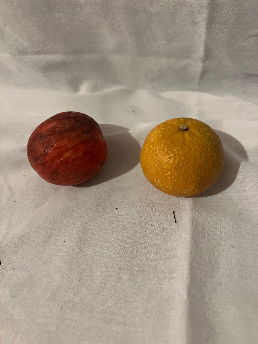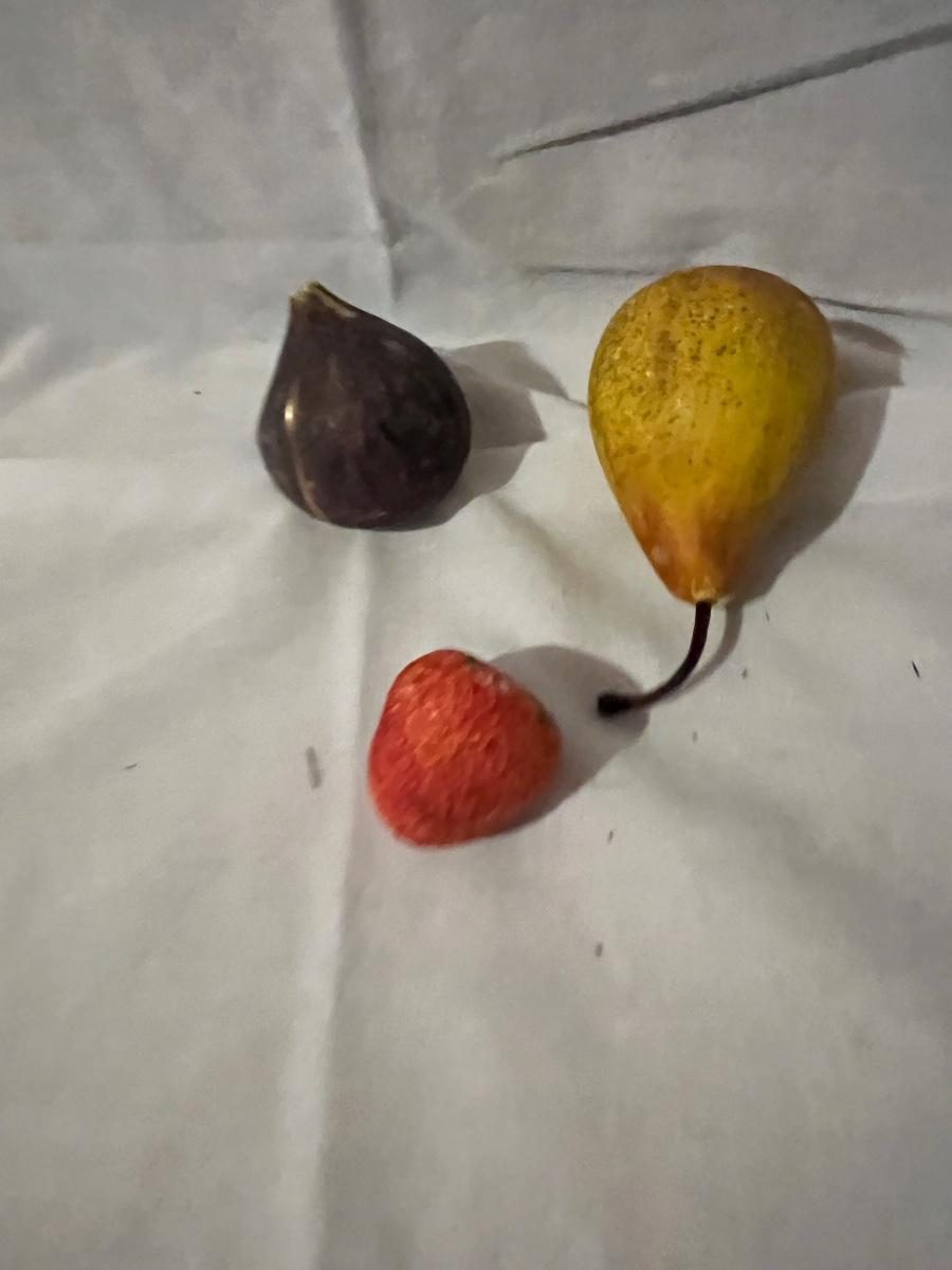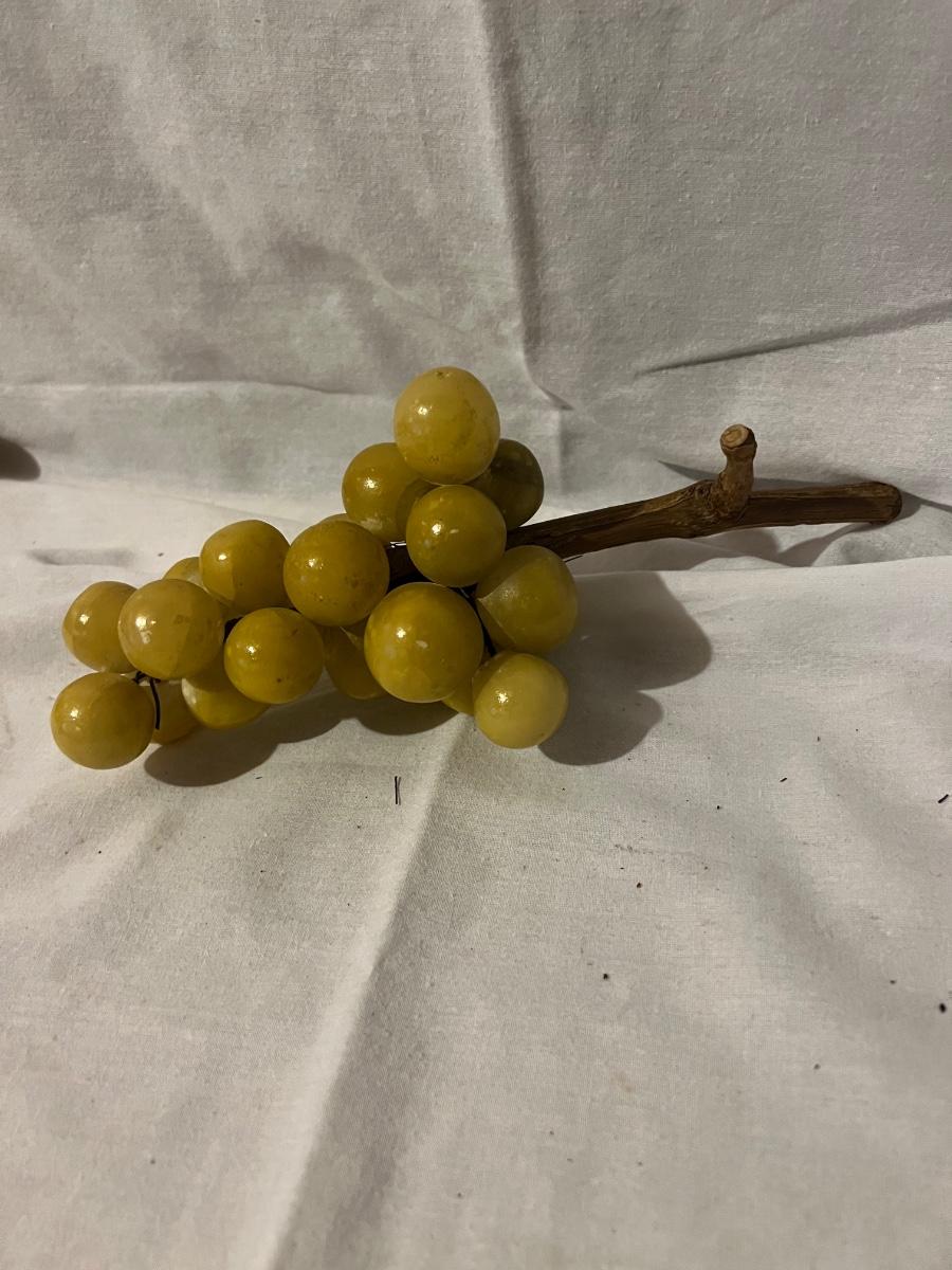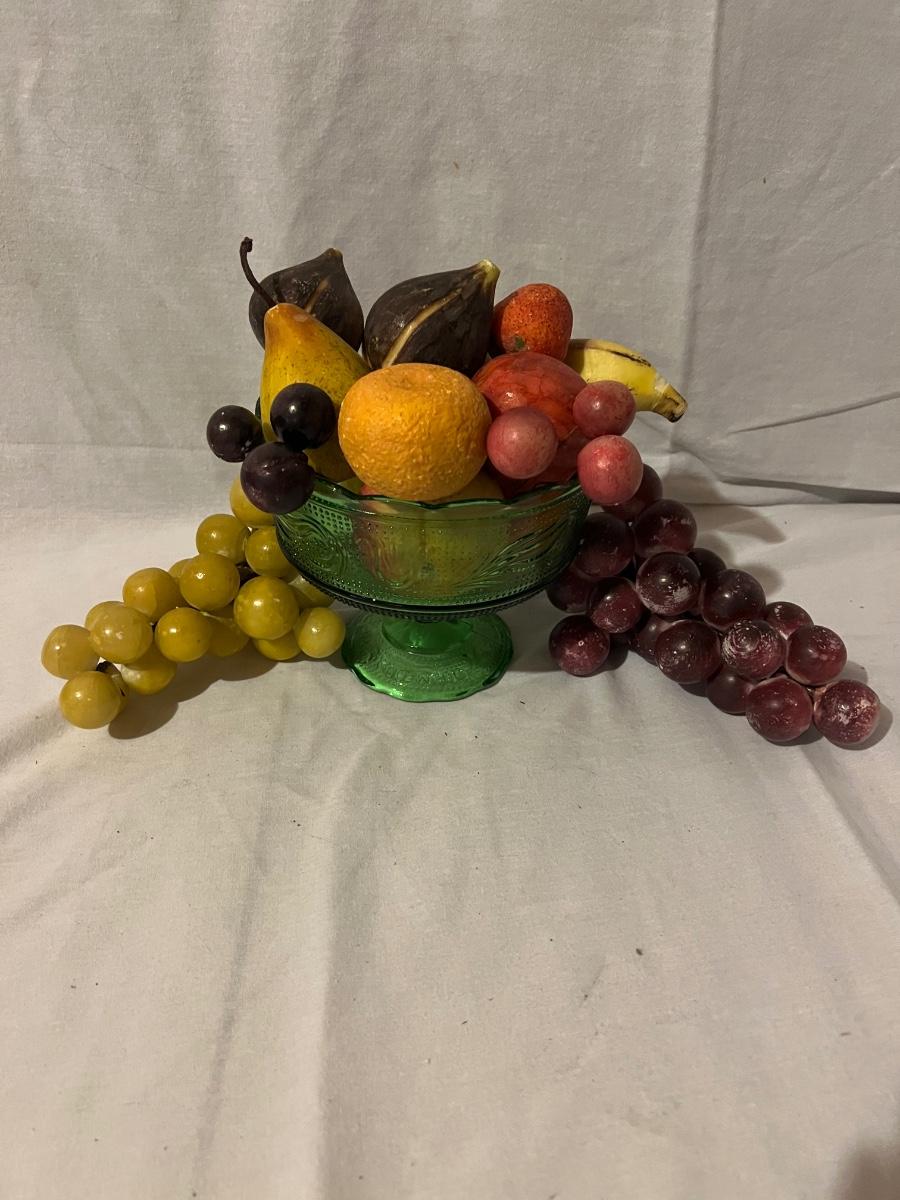 Seventeen pieces of collectible decorative fruit. Possibly carved from stone. No identification available but very heavy. Quite realistic. Appears to be hand painted. Also includes a Brody Co, green glass footed bowl that measures 6.5”D x 5.5”H. Bowl marked “E.O. Brody Company M 600 USA Cleveland.” The apple and peach measure approximately 2.75”D.