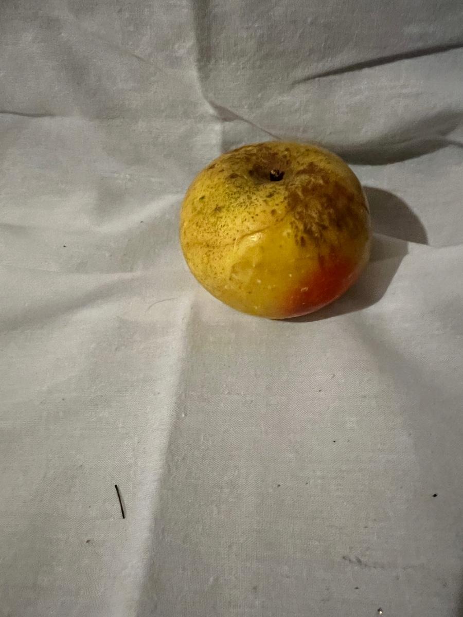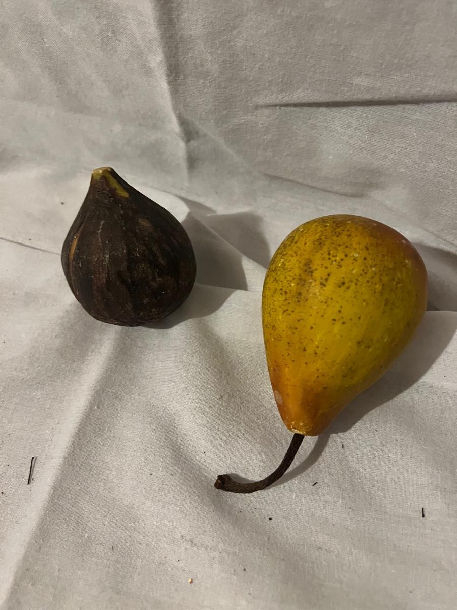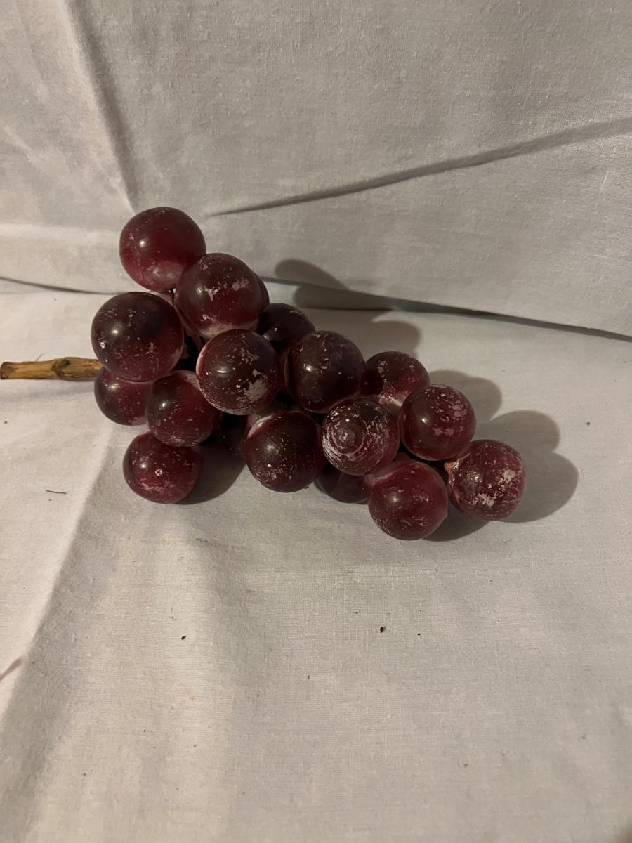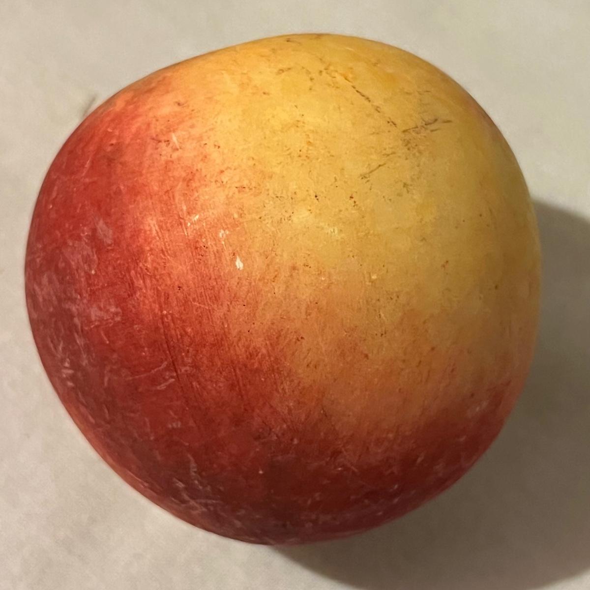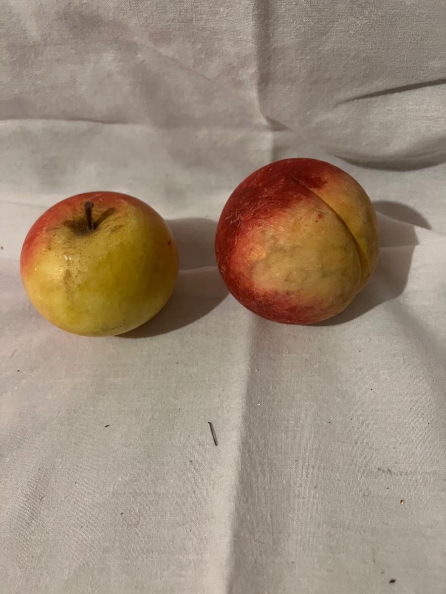 Seventeen pieces of collectible decorative fruit. Possibly carved from stone. No identification available but very heavy. Quite realistic. Appears to be hand painted. Also includes a Brody Co, green glass footed bowl that measures 6.5”D x 5.5”H. Bowl marked “E.O. Brody Company M 600 USA Cleveland.” The apple and peach measure approximately 2.75”D.