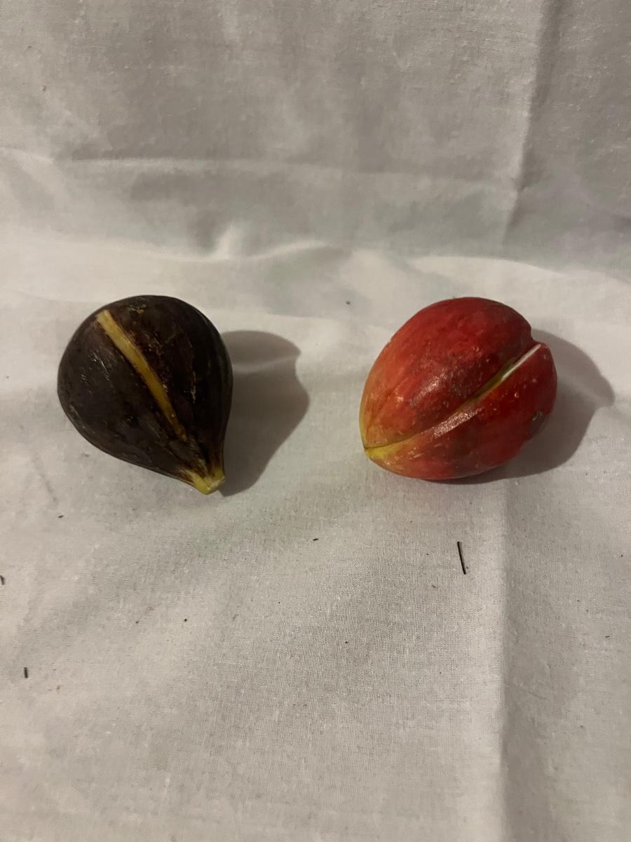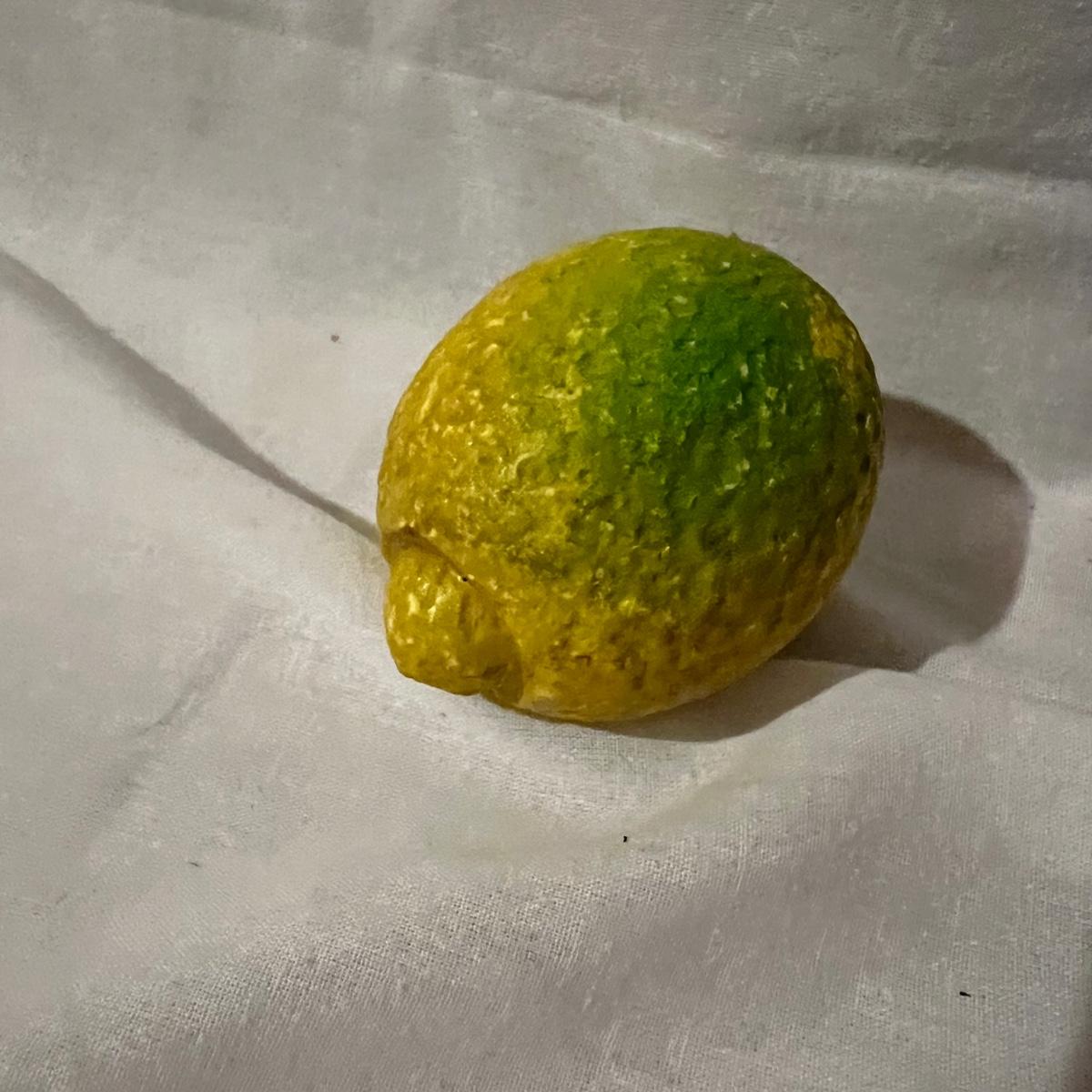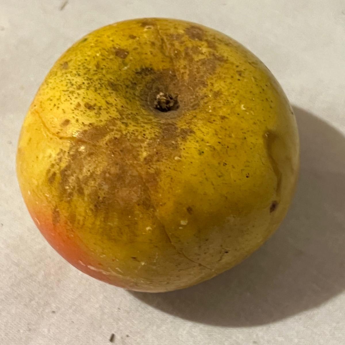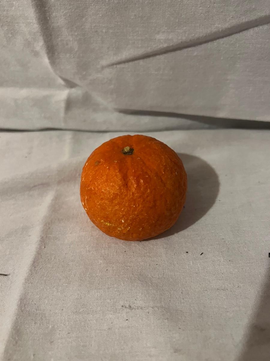 Seventeen pieces of collectible decorative fruit. Possibly carved from stone. No identification available but very heavy. Quite realistic. Appears to be hand painted. Also includes a Brody Co, green glass footed bowl that measures 6.5”D x 5.5”H. Bowl marked “E.O. Brody Company M 600 USA Cleveland.” The apple and peach measure approximately 2.75”D.
