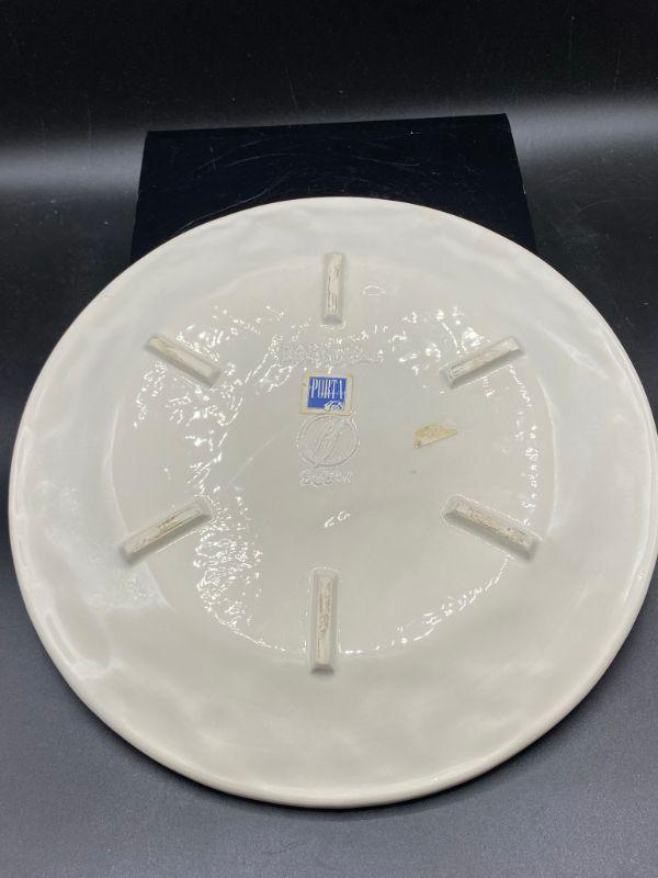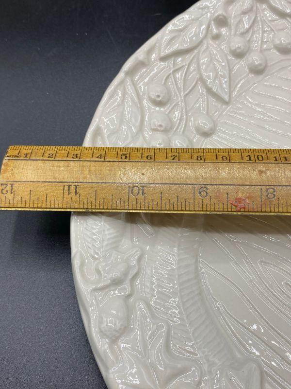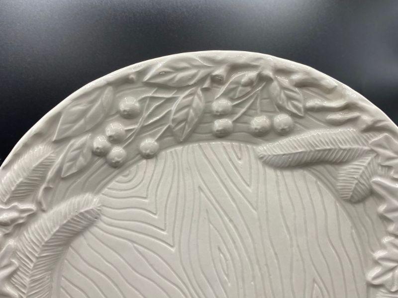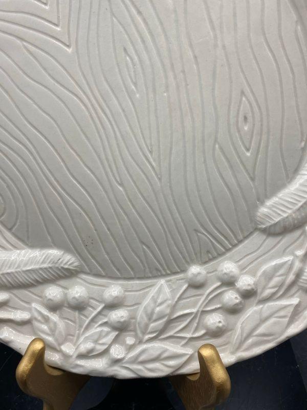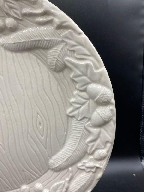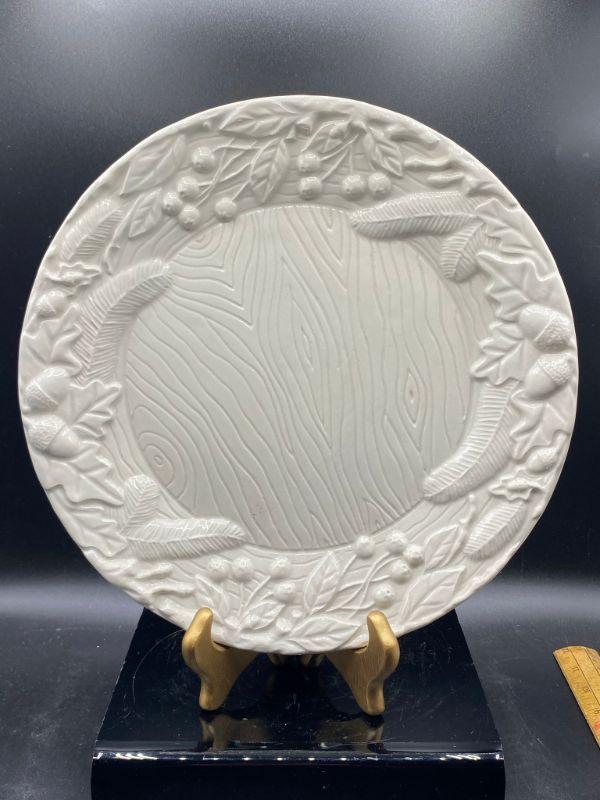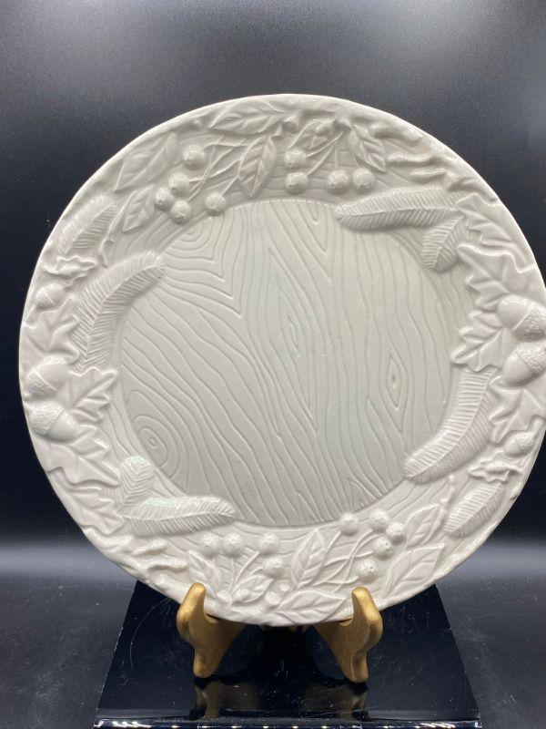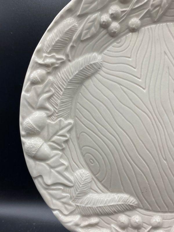Decorative fall patterned serving plate. Has a wood grain texture with leaves, pine, acorns and berries around the edge. About 11" across. Made in Portugal. Great condition.