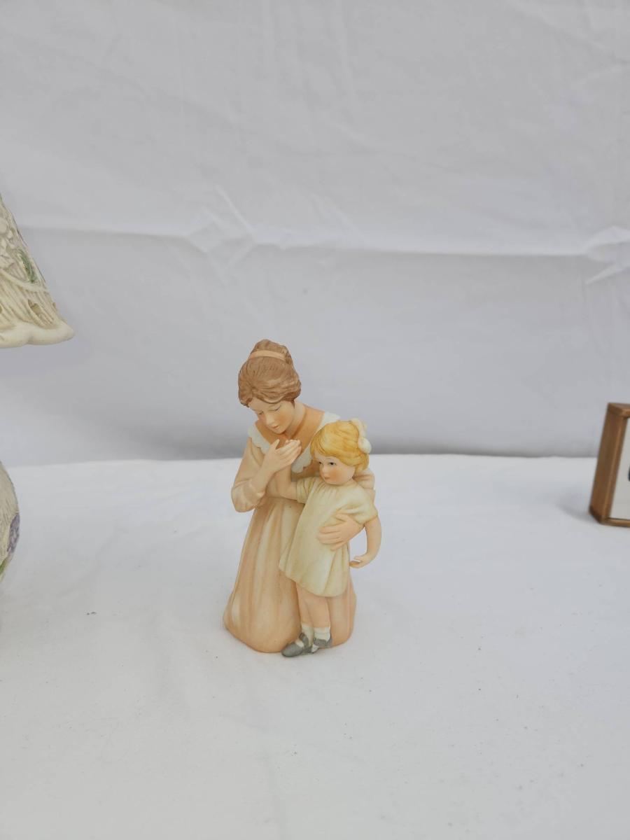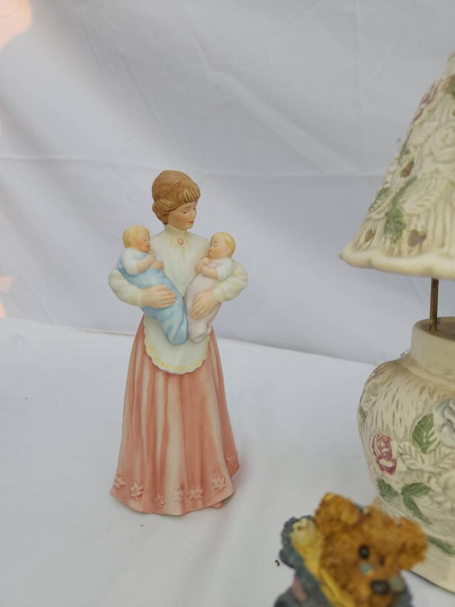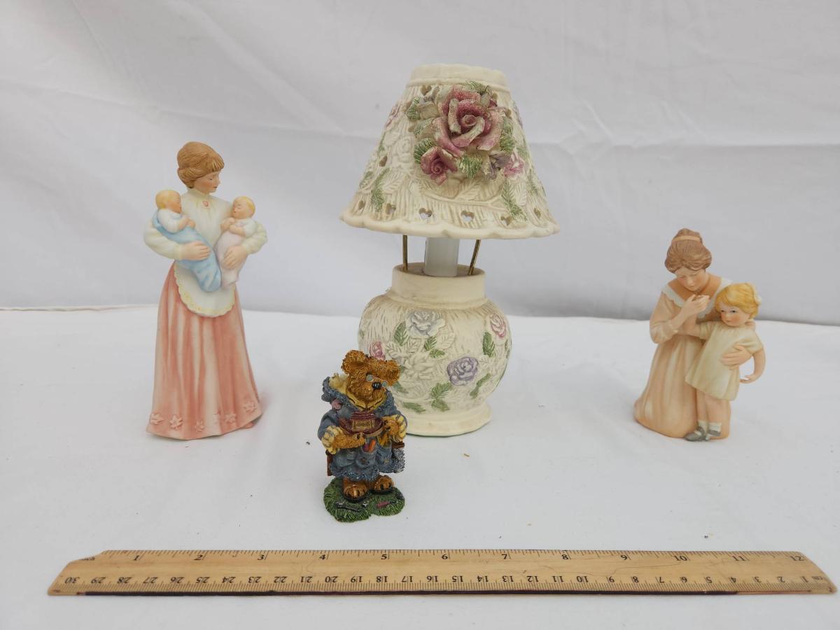 Two decorative mother-and-child figurines, one bear figurine holding flowers, and a small table lamp with a floral-patterned shade. The figurines appear to be made of ceramic or resin, showcasing detailed craftsmanship. The ruler shown provides a size reference.