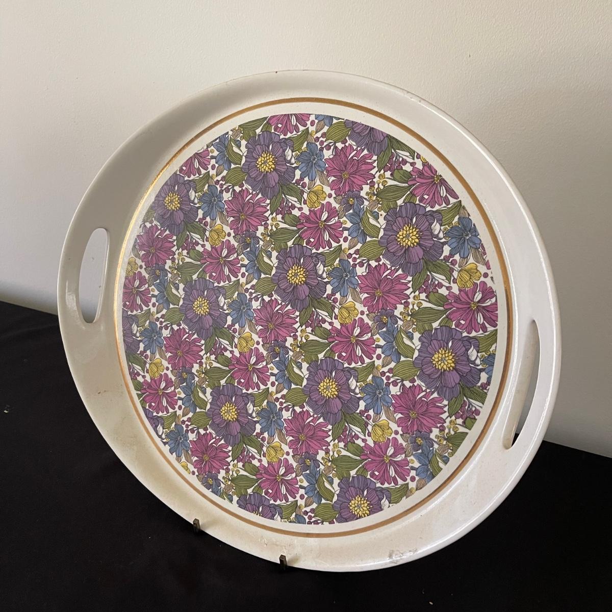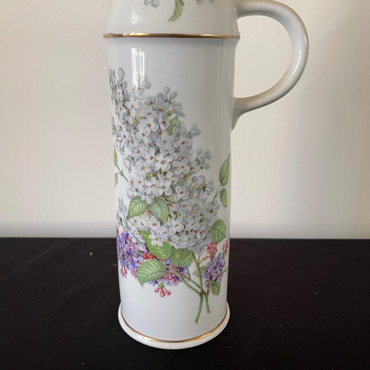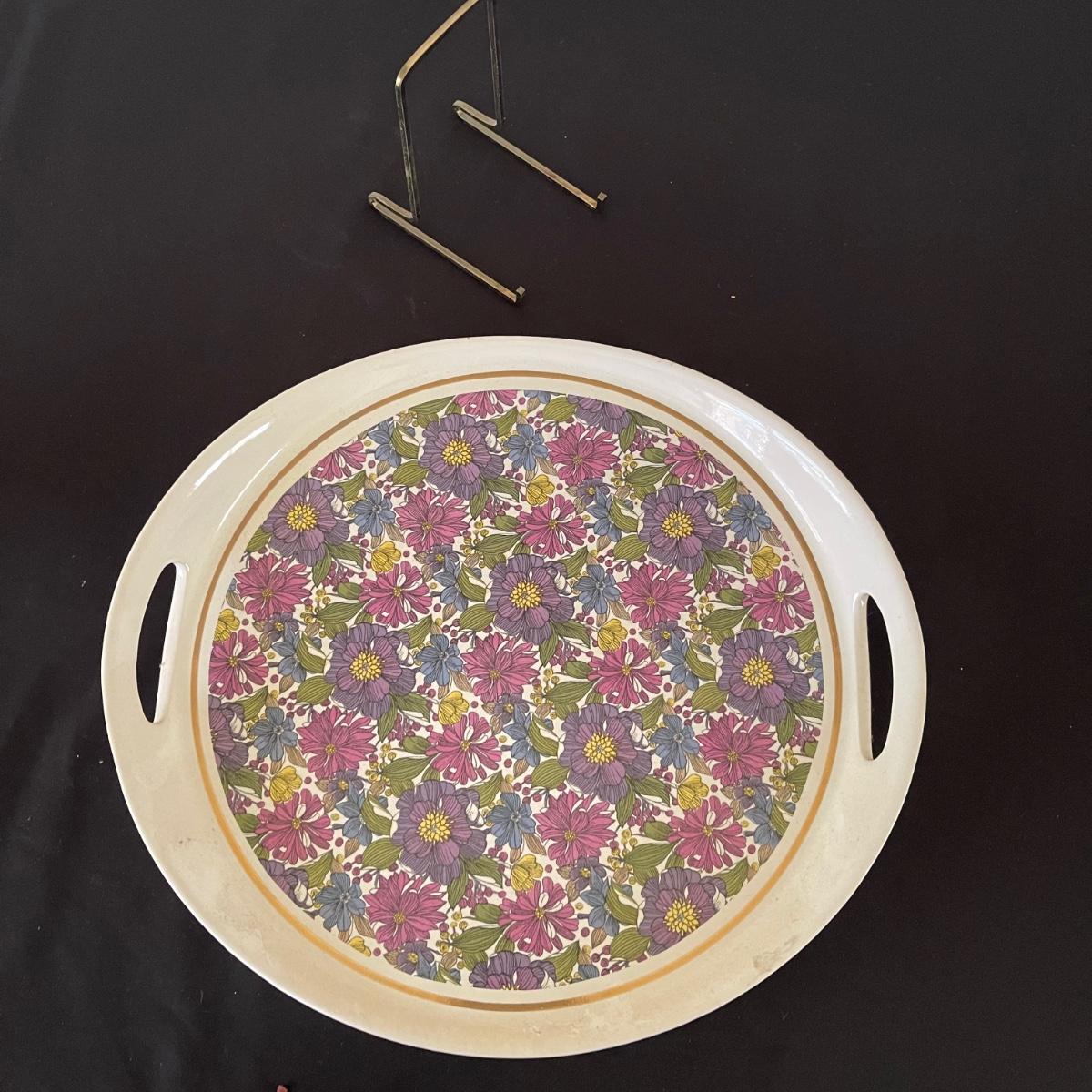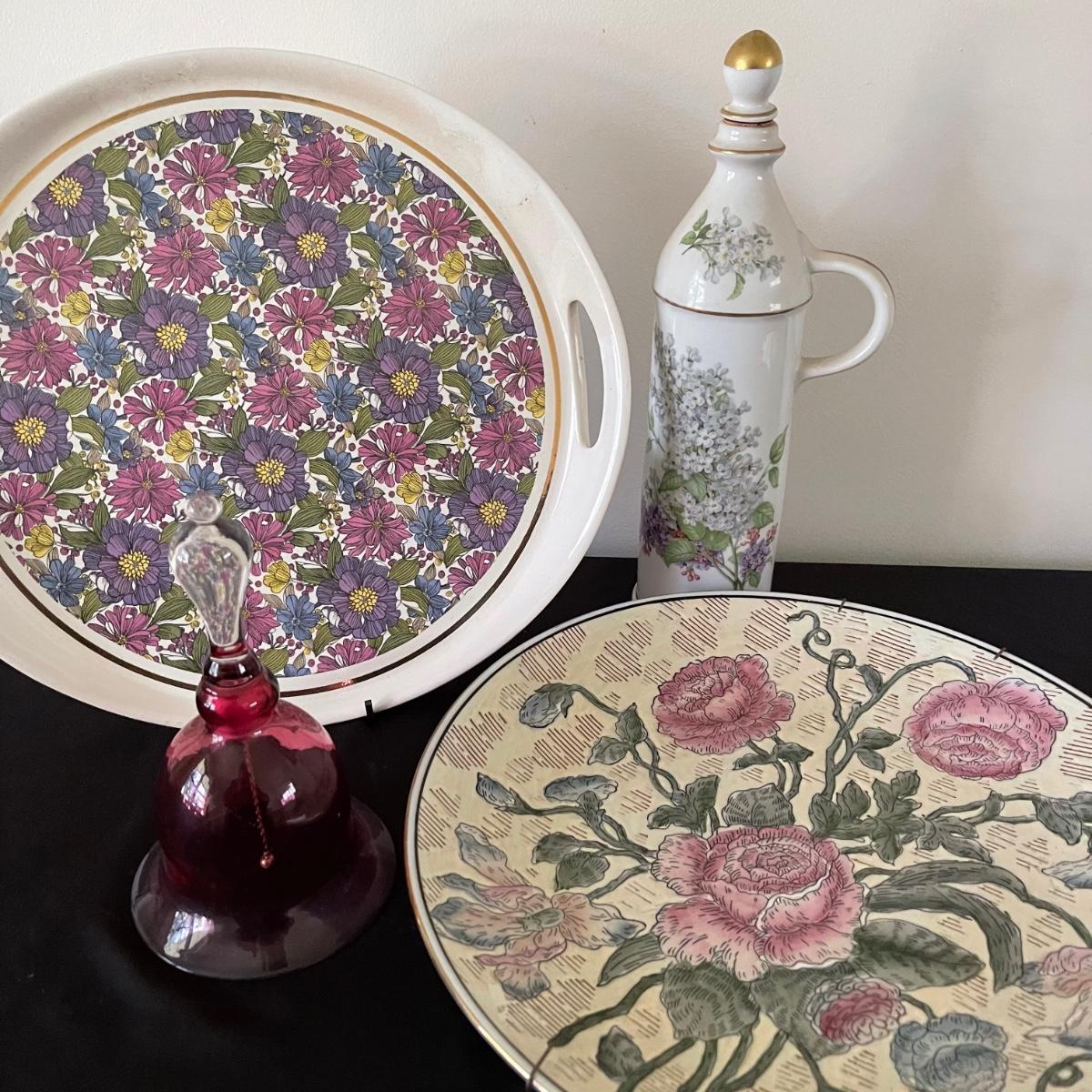 Two decorative floral plates, a glass bell, and and a Limoge jug with a cork and handle. The larger plate is 13.5” in diameter and the other is 12.5”. Plates and floral painted jug are ceramic. Shipping available.