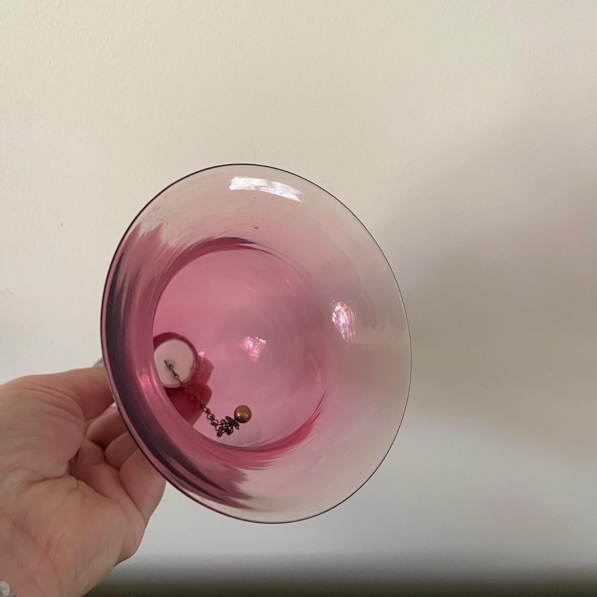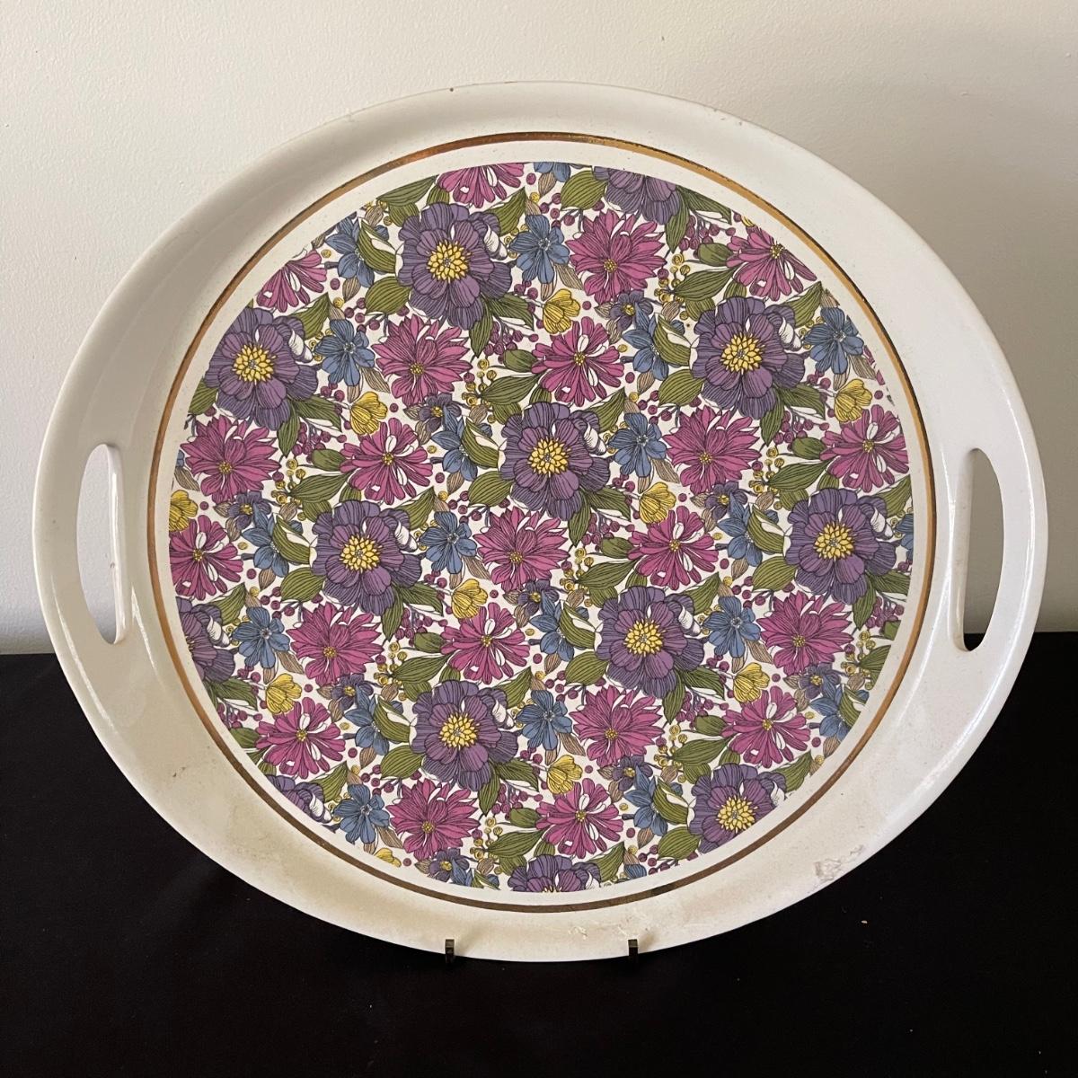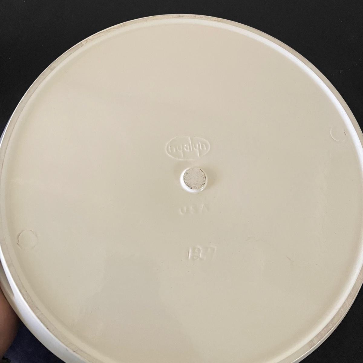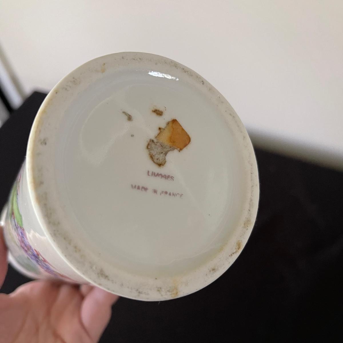 Two decorative floral plates, a glass bell, and and a Limoge jug with a cork and handle. The larger plate is 13.5” in diameter and the other is 12.5”. Plates and floral painted jug are ceramic. Shipping available.