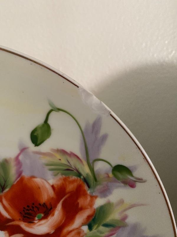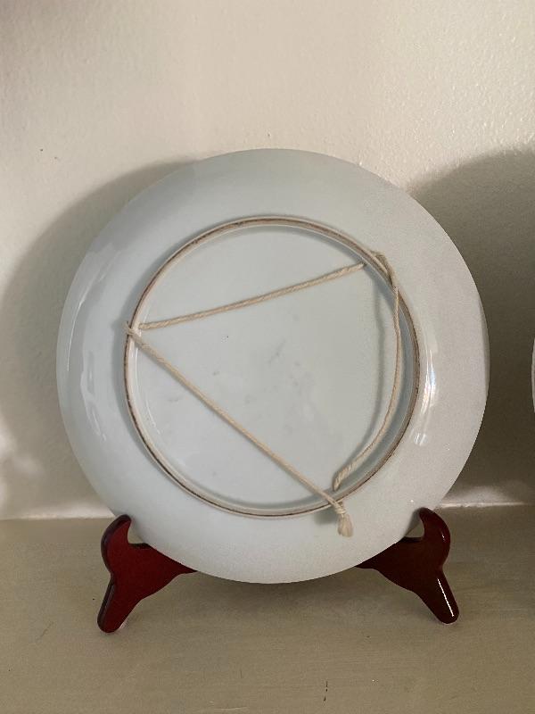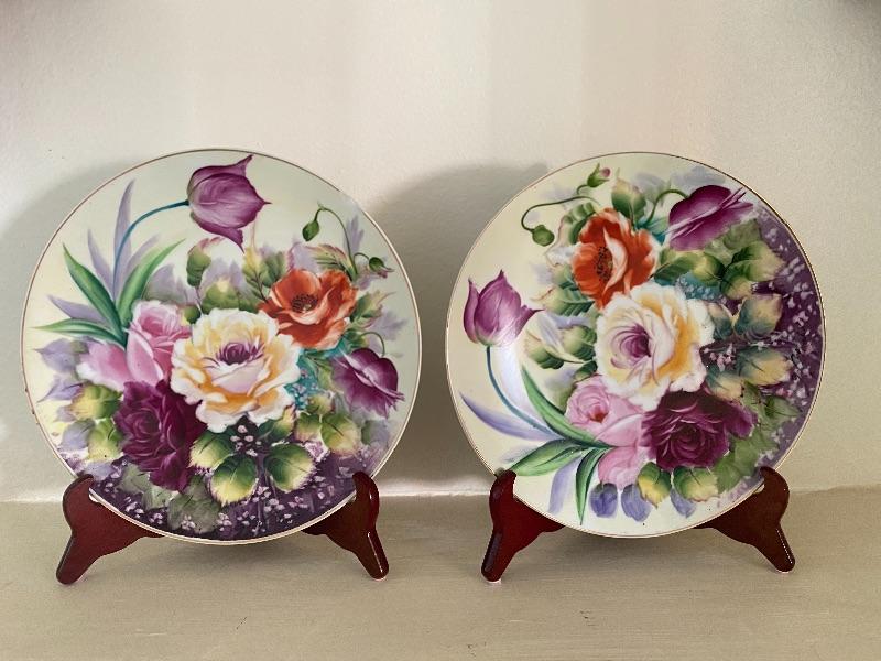 Pair of decorative floral plates with stands. Plates are strung on back for hanging as well. One unfortunately does have a chip.