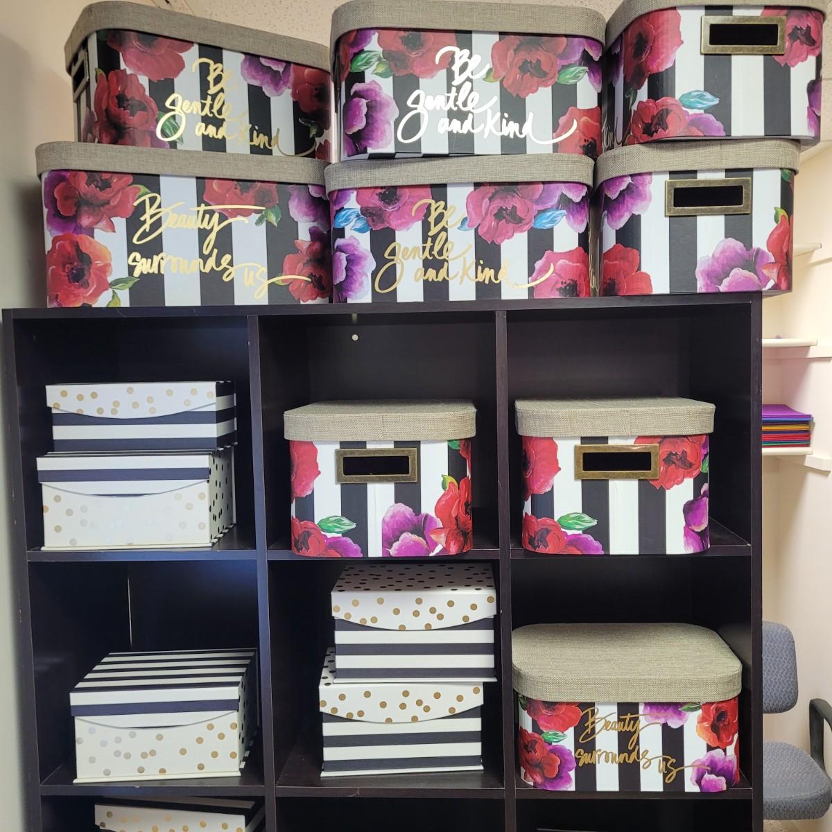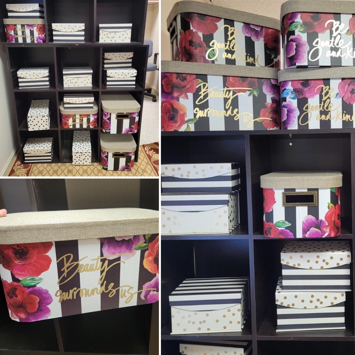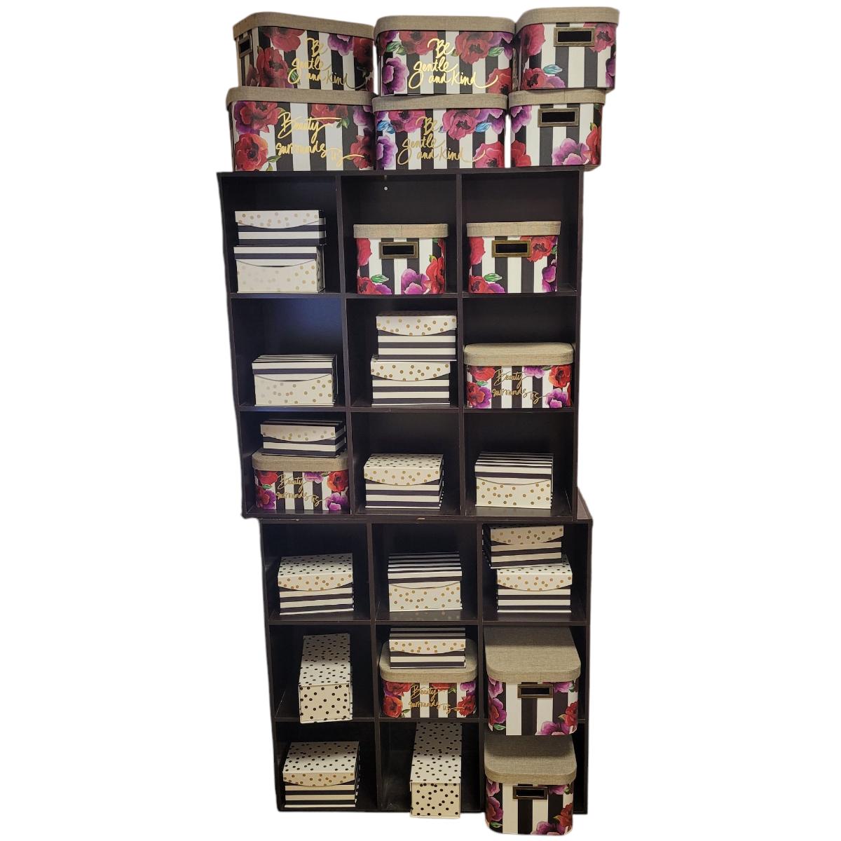 This lot includes 29 decorative floral storage boxes. Made by Sundance Graphics, these boxes feature stripes, polka dots, flowers, and golden cursive phrases. Phrases include "Beauty Surrounds Us", and "Be Gentle and Kind". The smaller boxes feature a magnetic snap style lid while the larger boxes have a traditional lid made from fabric and cardboard. The larger boxes measure 14.5" x 10" x 7.5H. Pictured shelves are NOT included with this lot.