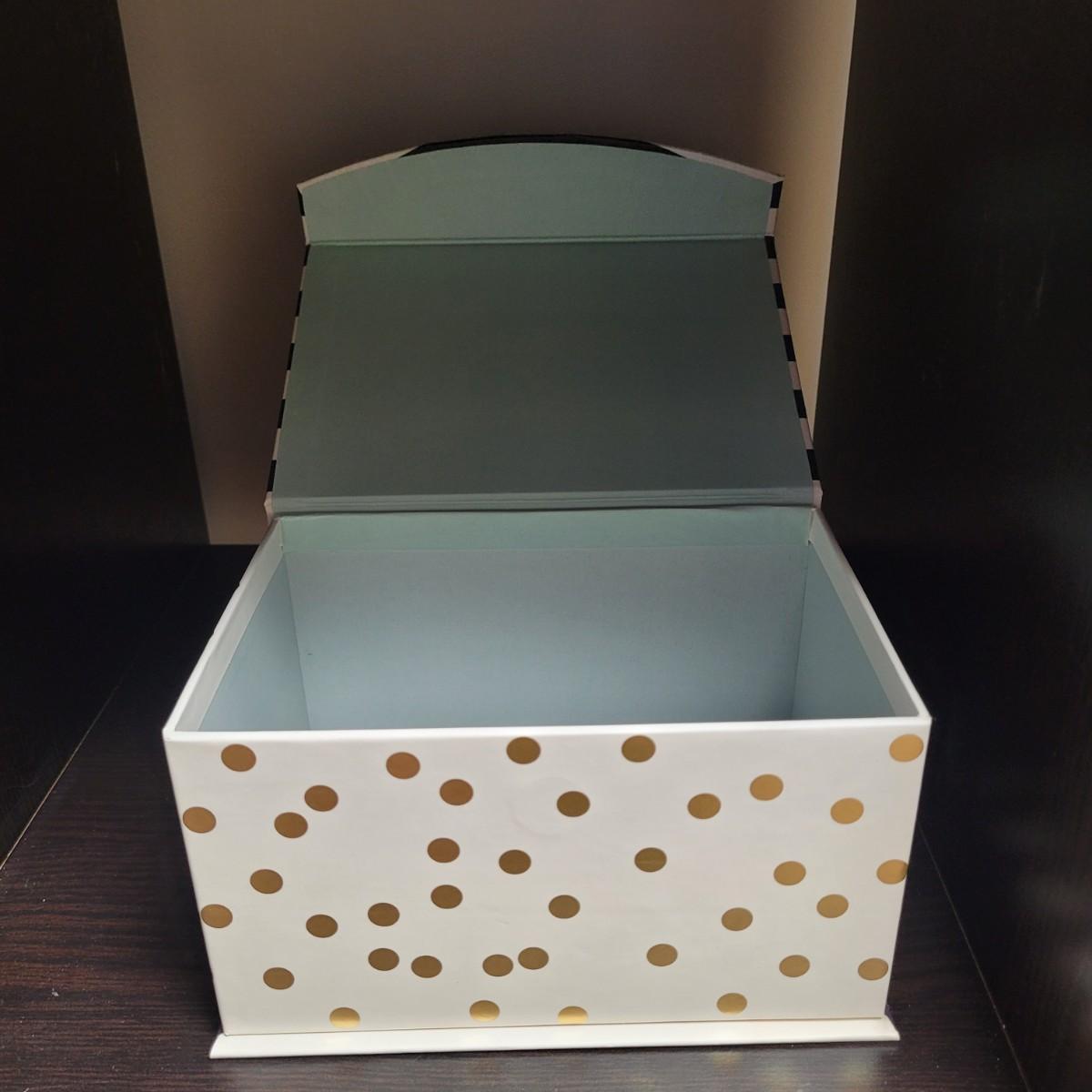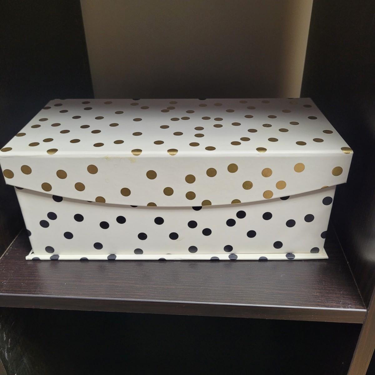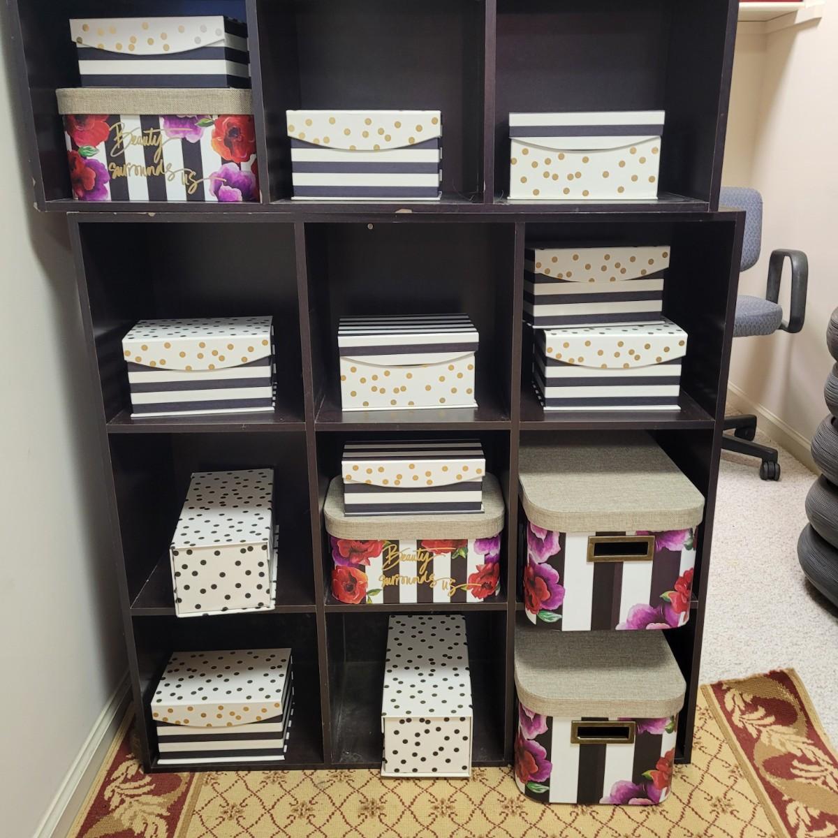 This lot includes 29 decorative floral storage boxes. Made by Sundance Graphics, these boxes feature stripes, polka dots, flowers, and golden cursive phrases. Phrases include "Beauty Surrounds Us", and "Be Gentle and Kind". The smaller boxes feature a magnetic snap style lid while the larger boxes have a traditional lid made from fabric and cardboard. The larger boxes measure 14.5" x 10" x 7.5H. Pictured shelves are NOT included with this lot.