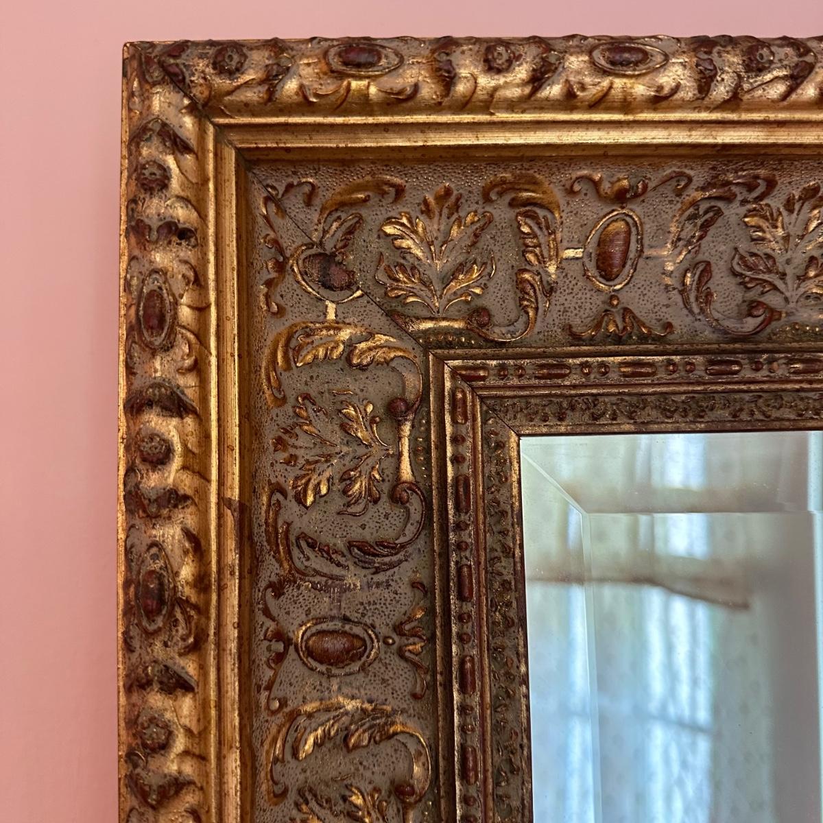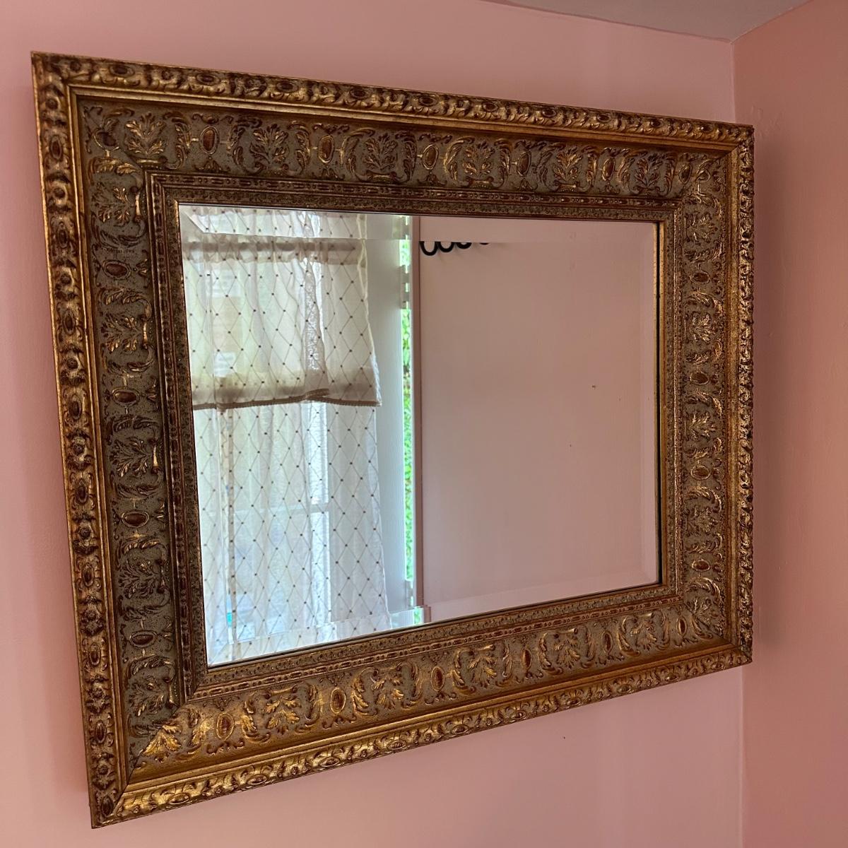 Decorative framed beveled mirror measures 27” X 3.25” X 24”H. Can be hung vertically or horizontally. Shipping available.
