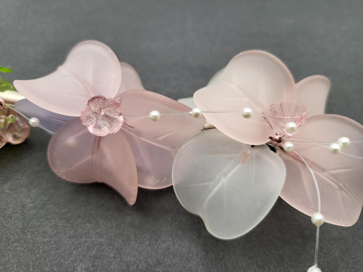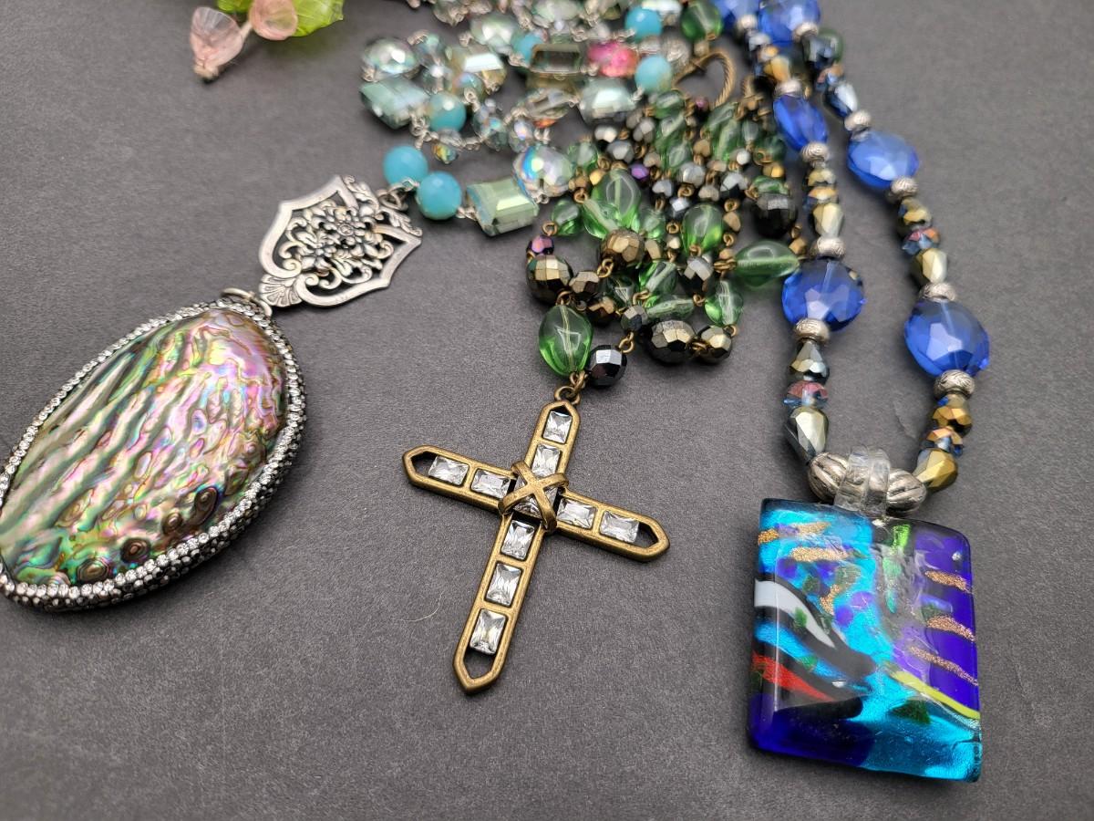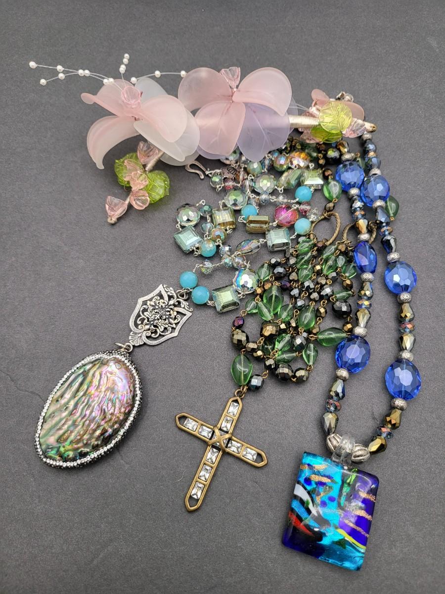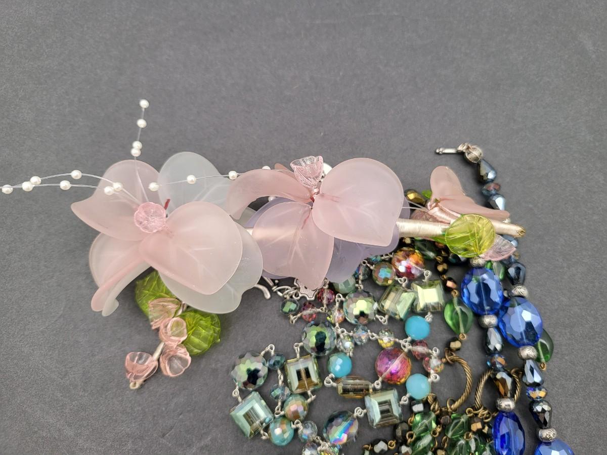 Three, art glass bead/crystal necklaces (2)-18" and (1)-30". Light pastel frosted flower petal vanity decor, 6.5" long.