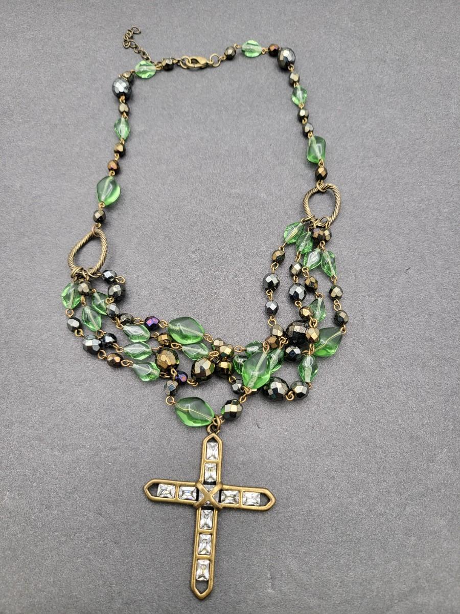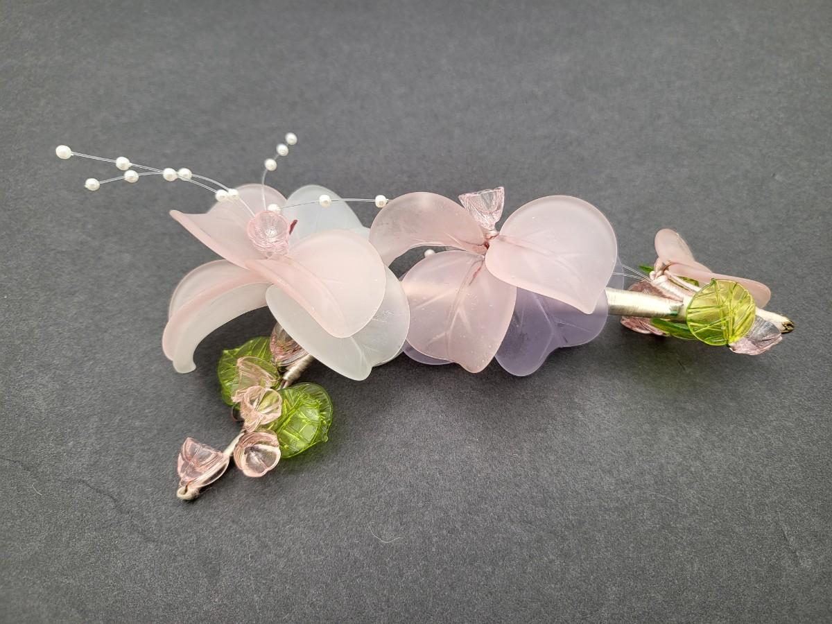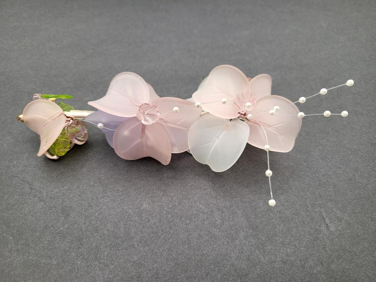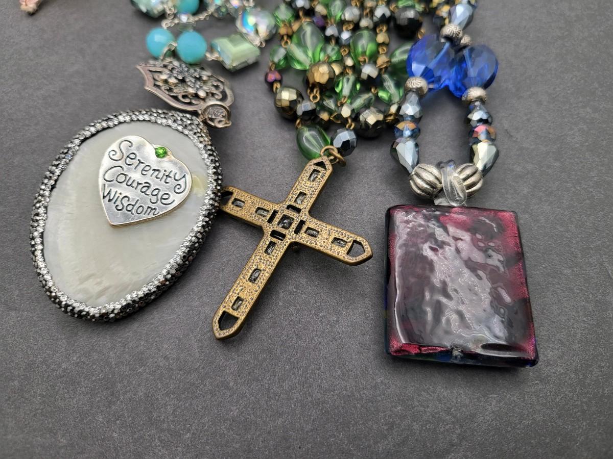Three, art glass bead/crystal necklaces (2)-18" and (1)-30". Light pastel frosted flower petal vanity decor, 6.5" long.