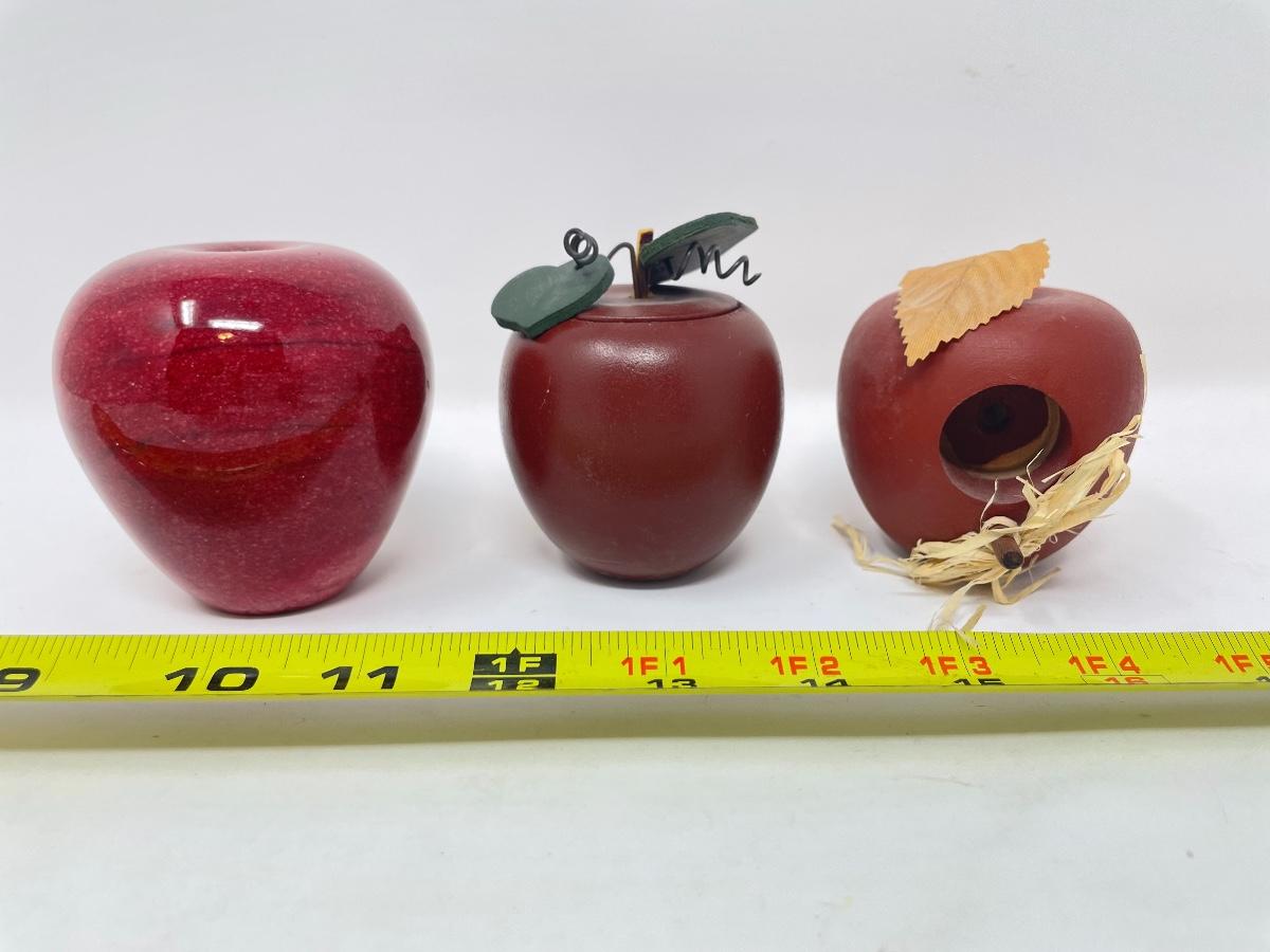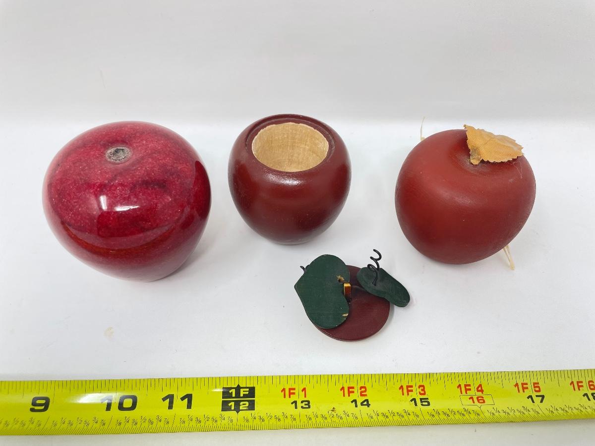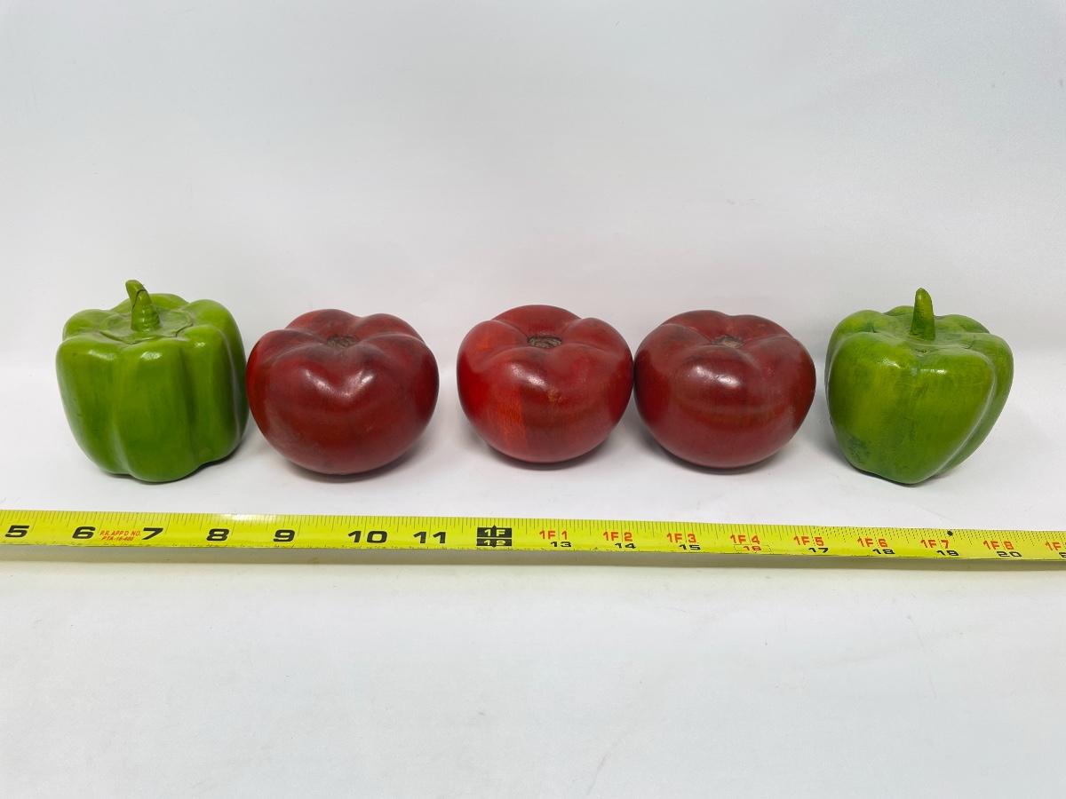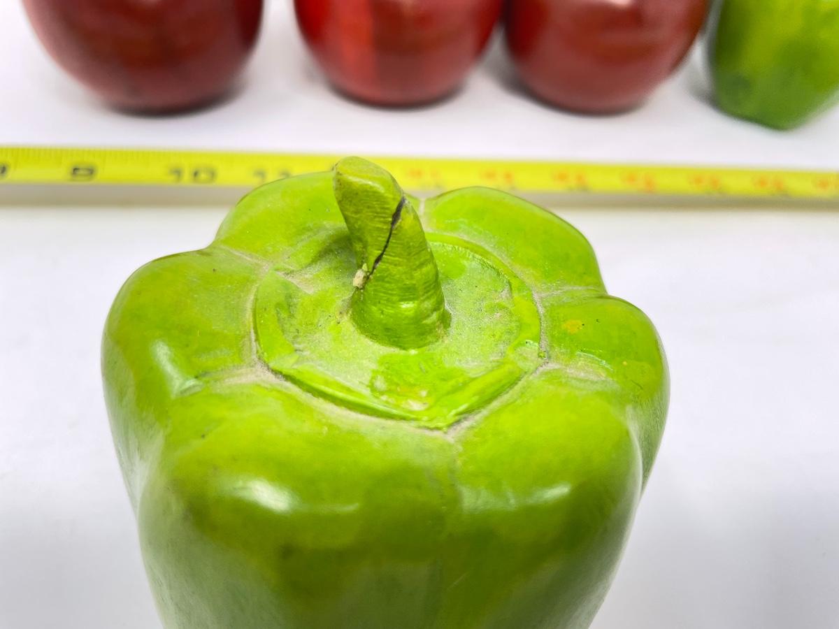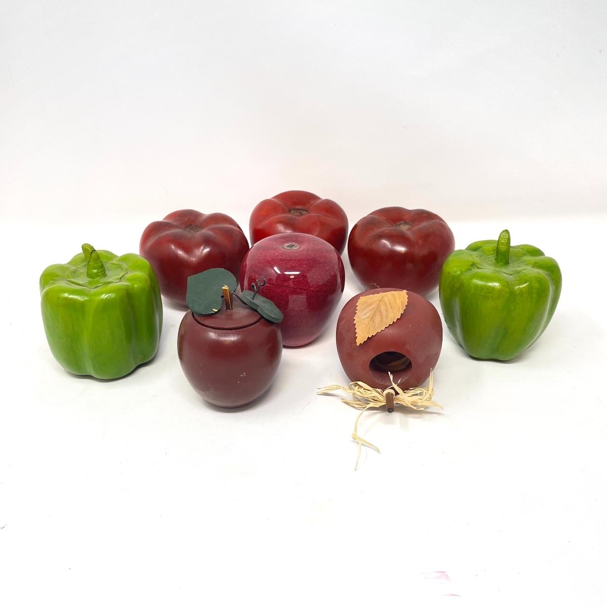 In good condition - unsure of the material of the tomatoes and peppers, but they are lightweight (one pepper has a repair). The two smaller apples are wooden and the larger apple is very heavy.