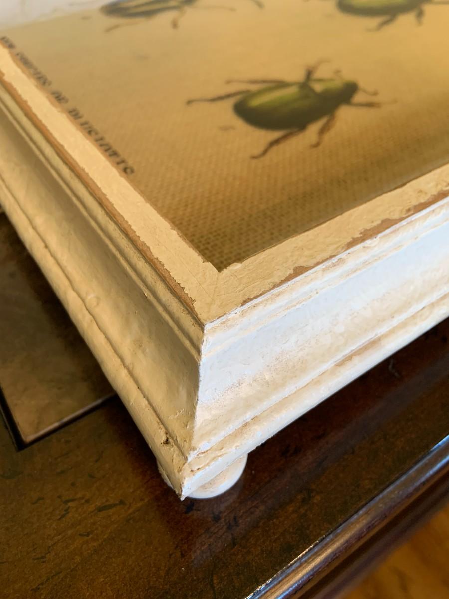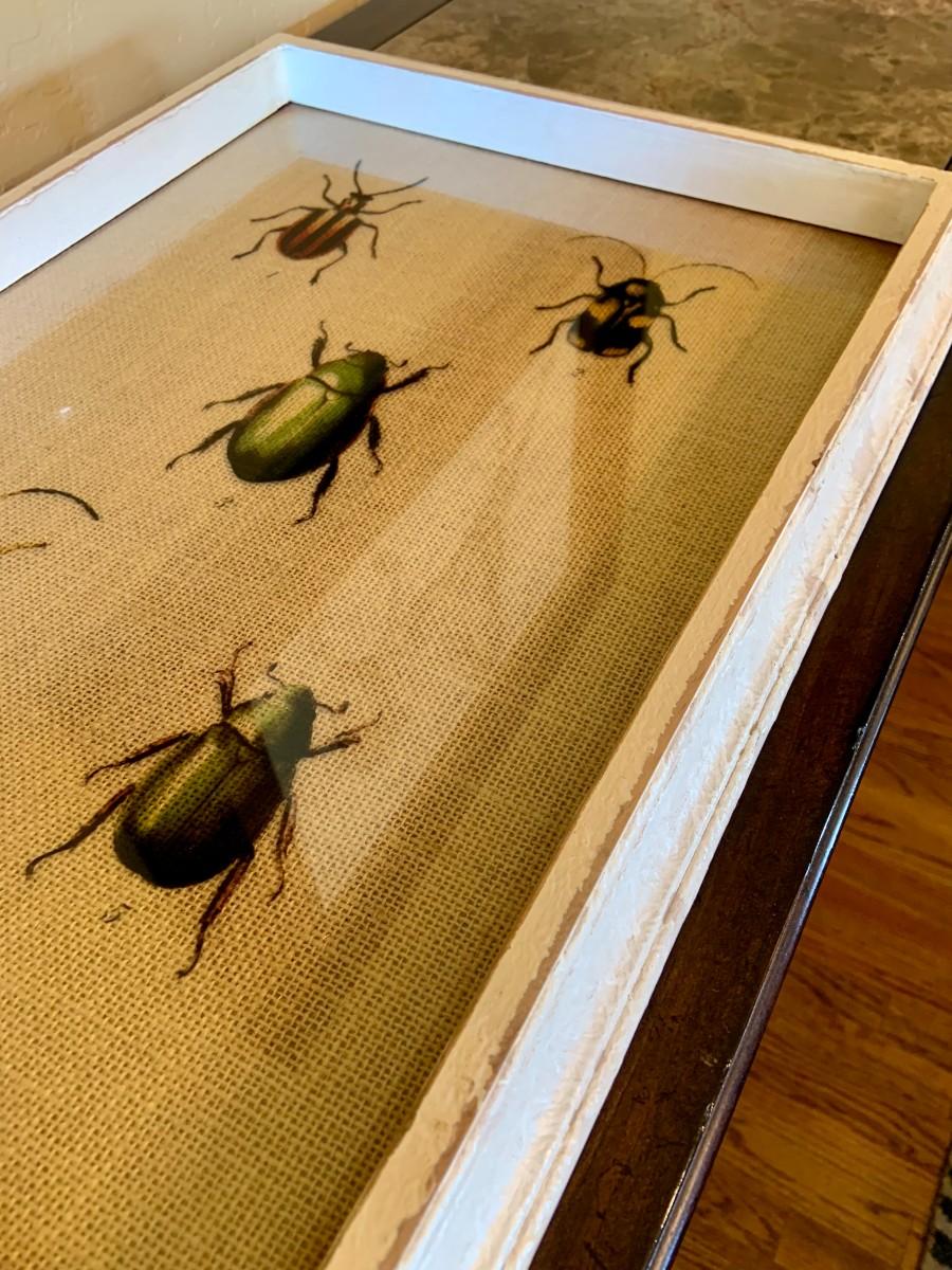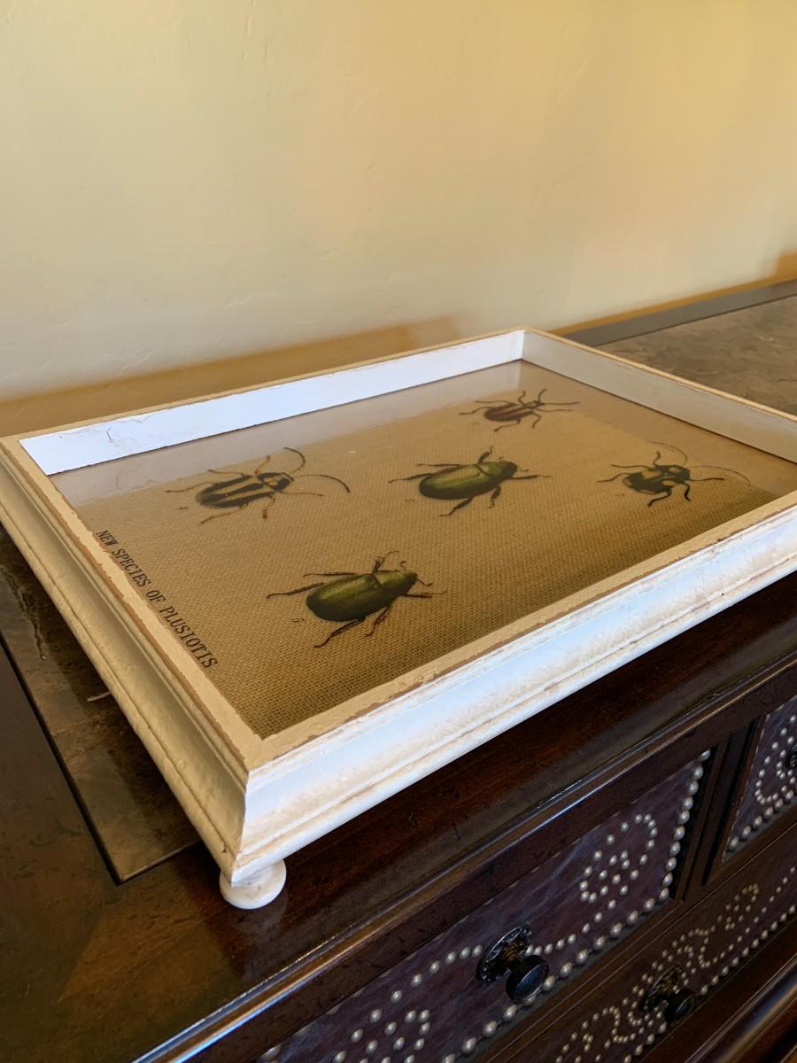 Chippy wooden footed tray with glass top and burlap.