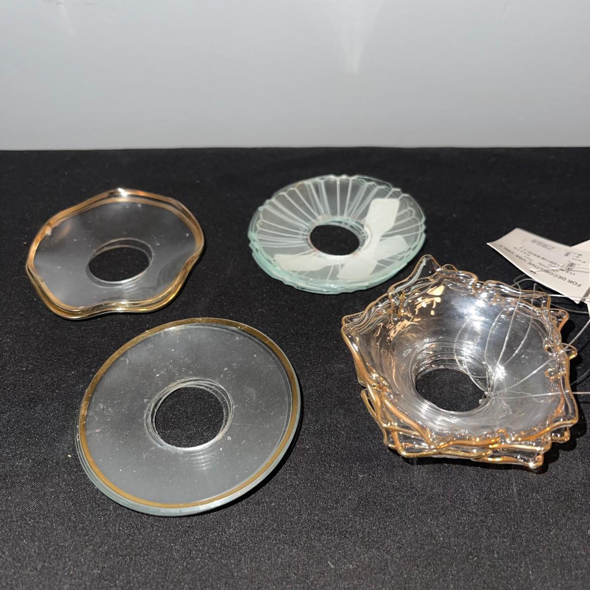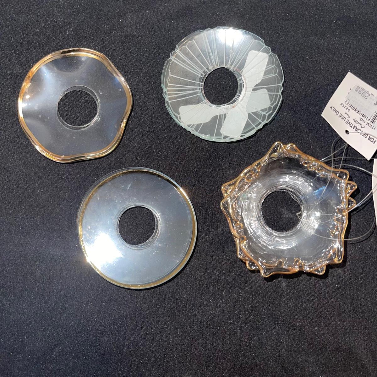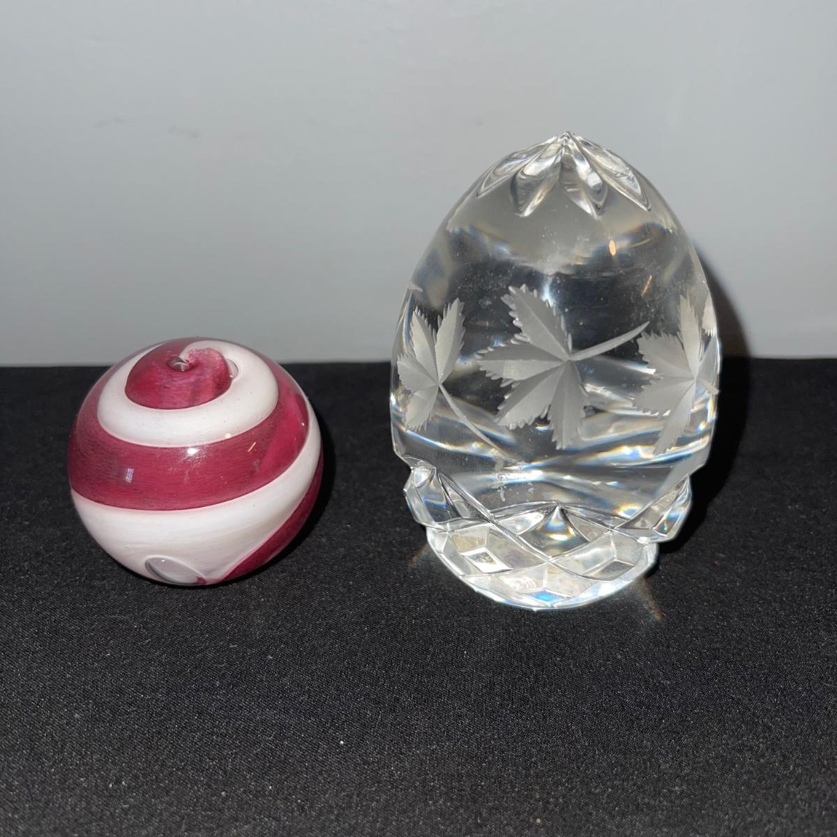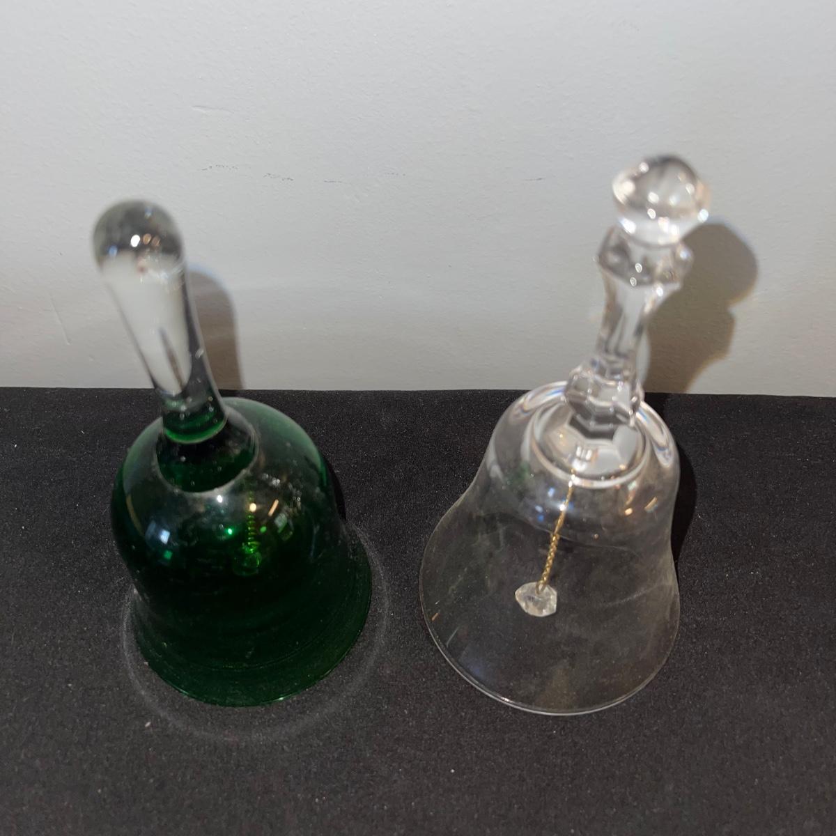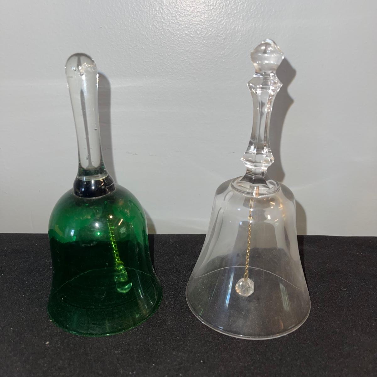 Various decorative glass items including two hanging glass orbs, a collection of bobeches, two bells, and two paper weights. The taller hanging orb stand is 13” tall. The bobeches are a variety of styles.