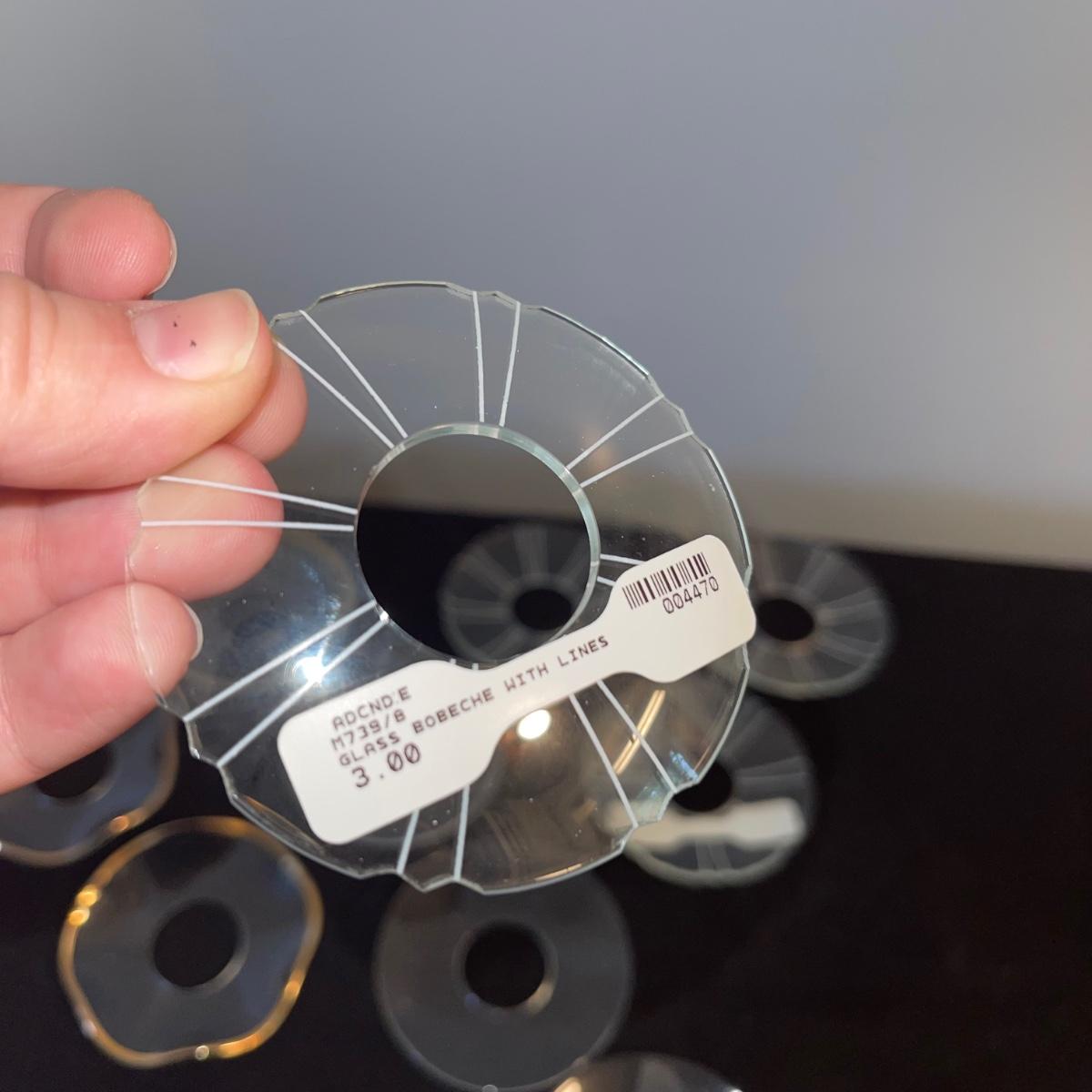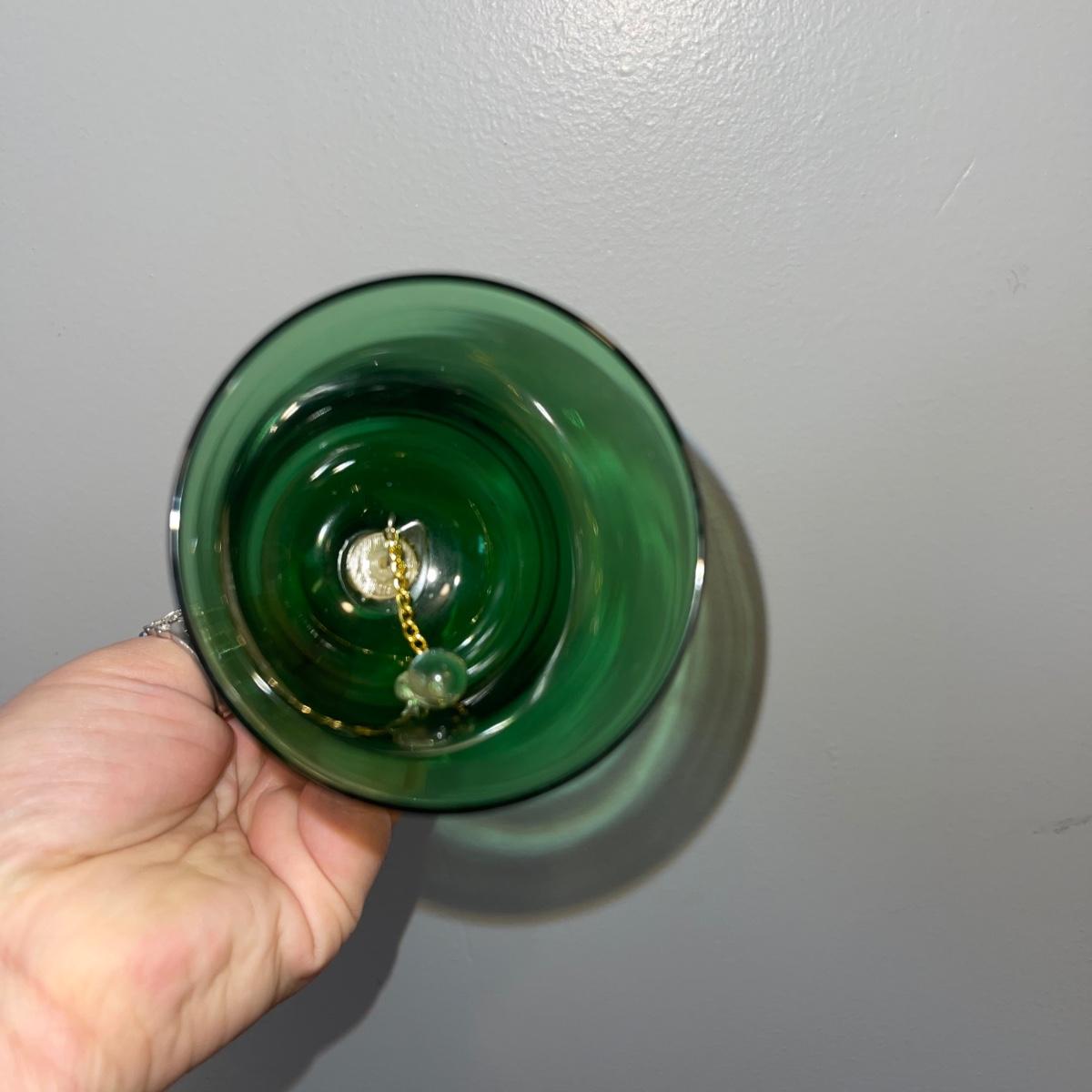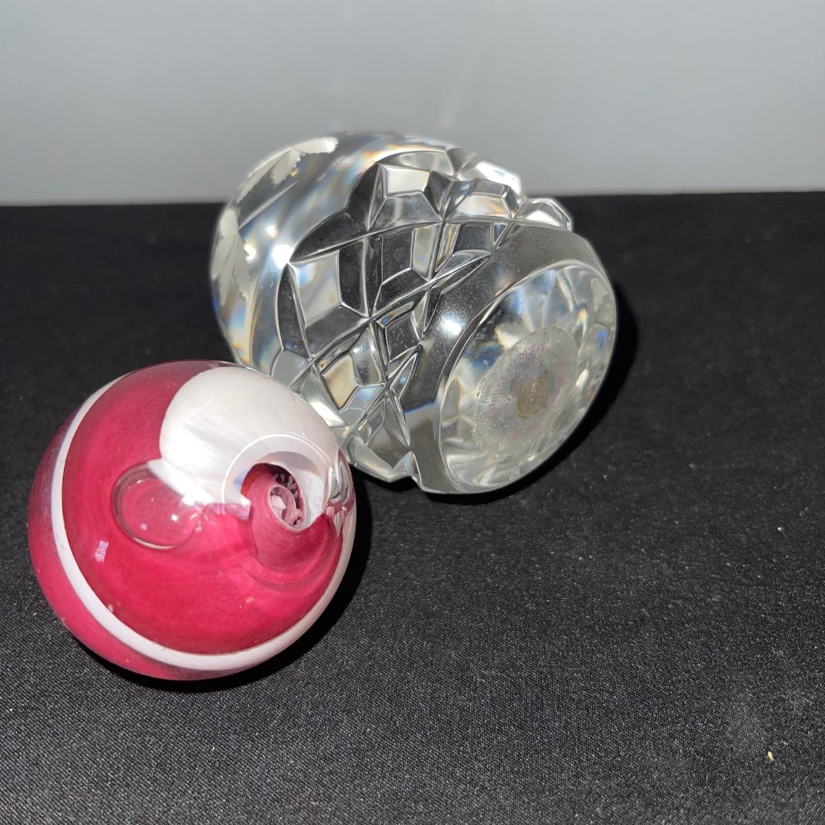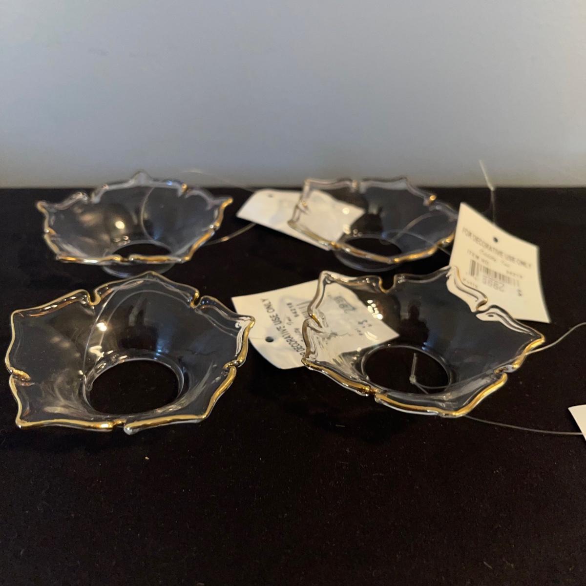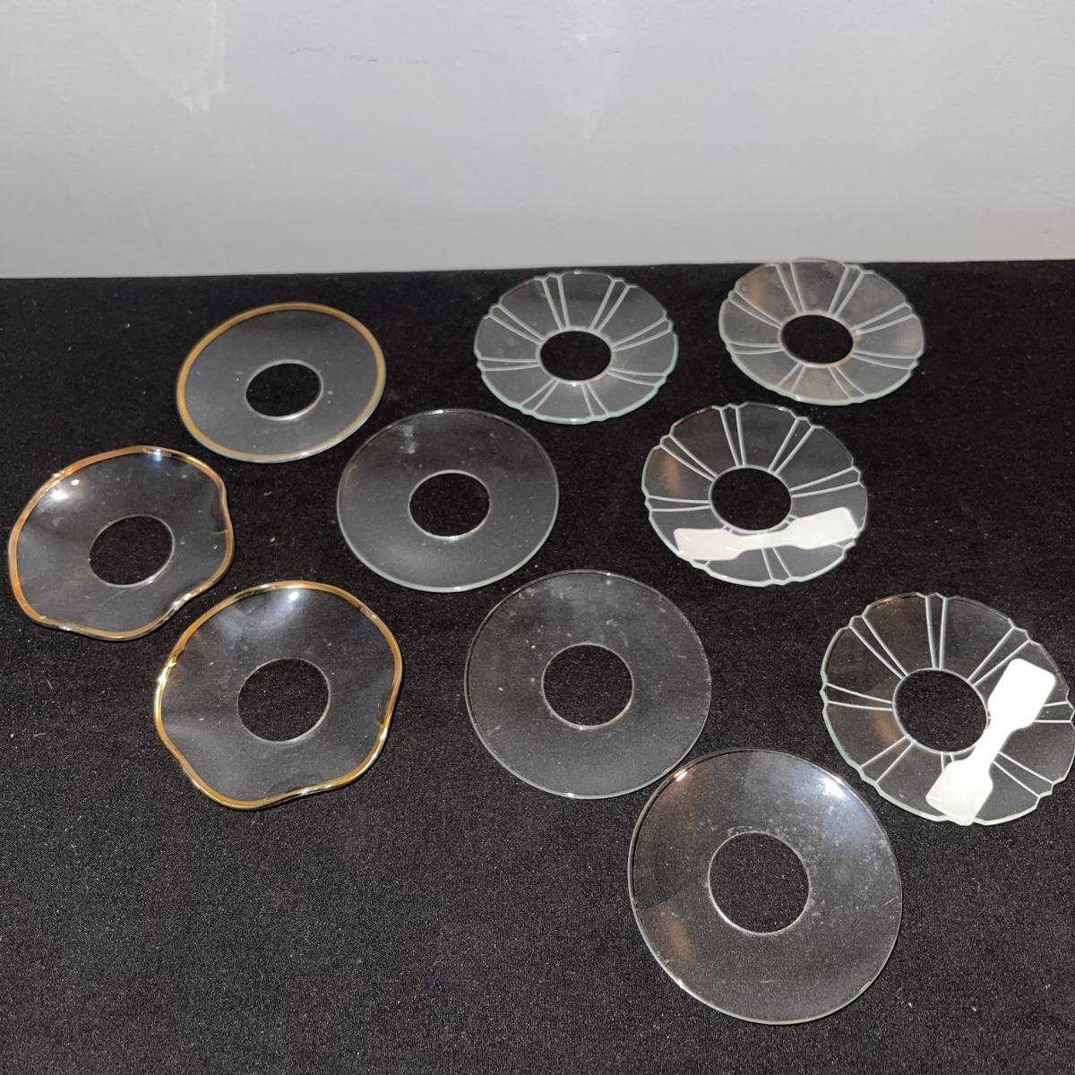 Various decorative glass items including two hanging glass orbs, a collection of bobeches, two bells, and two paper weights. The taller hanging orb stand is 13” tall. The bobeches are a variety of styles.