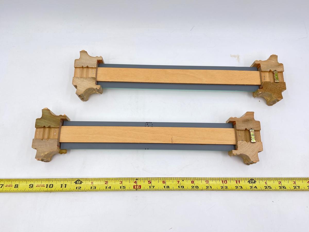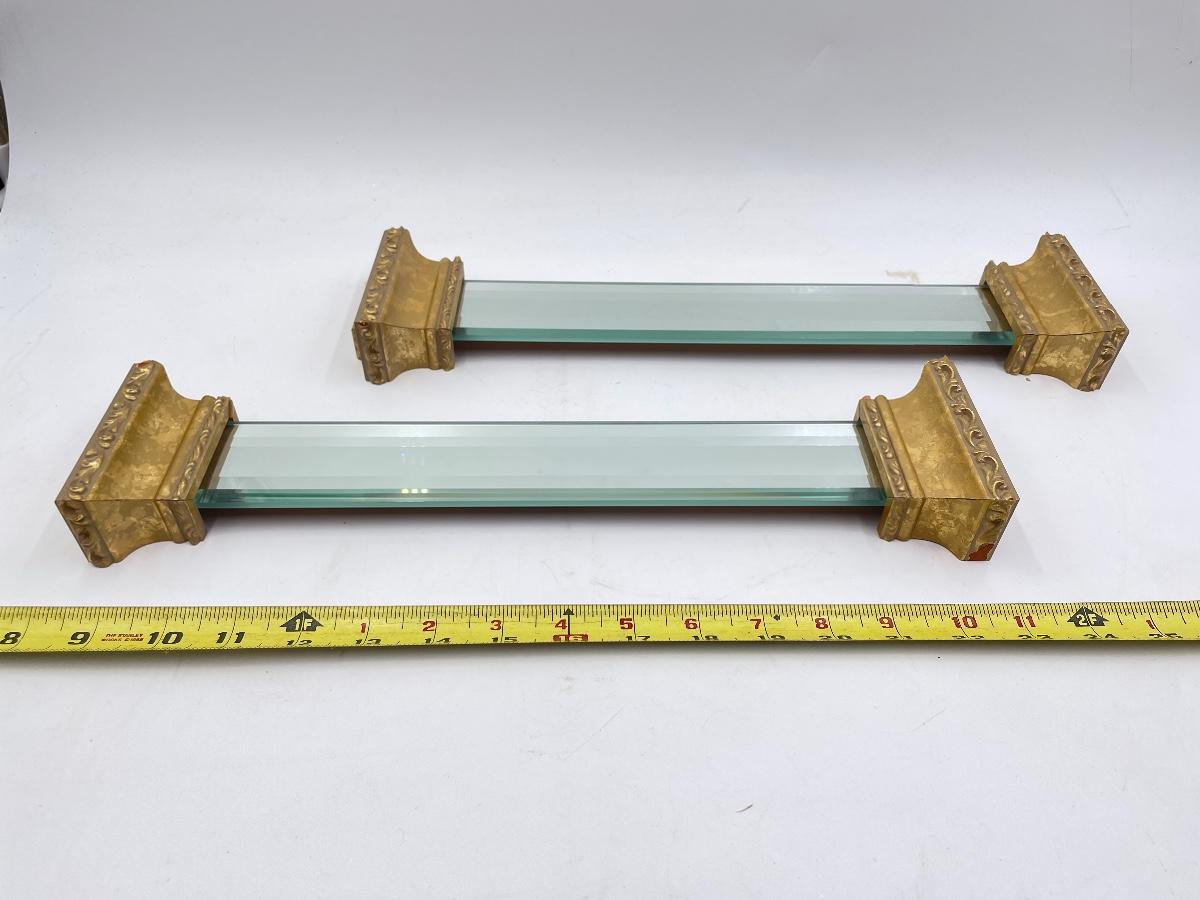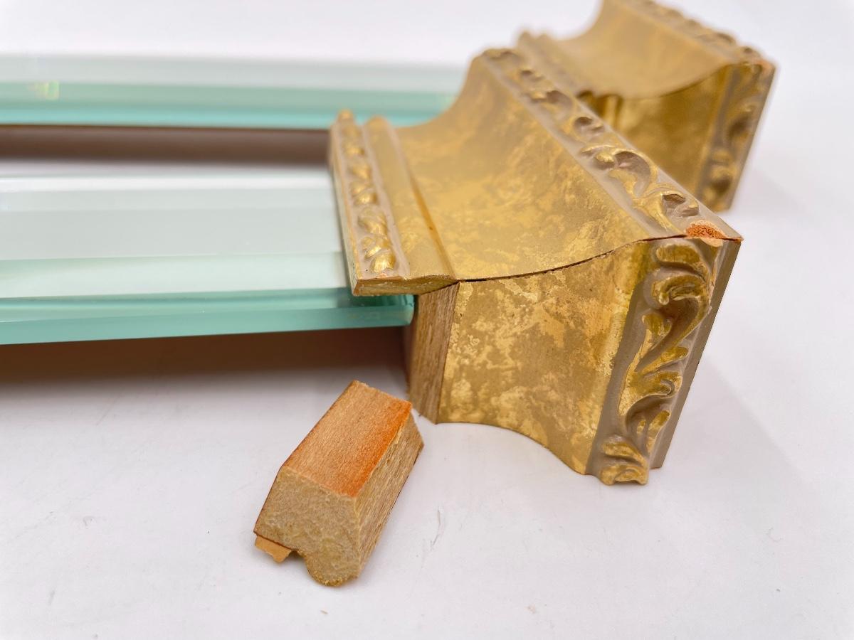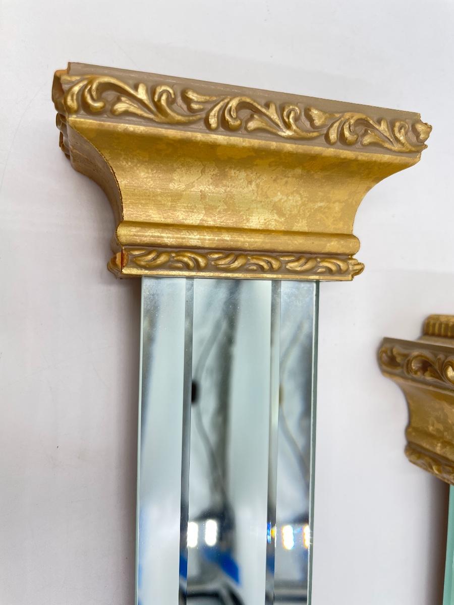Approx 15.5” long. One mirror has a small piece that has broken off (please see pictures) but it could easily be reattached with some glue. There is also a separate spot where the gold finish has come off. Otherwise in very good condition.
