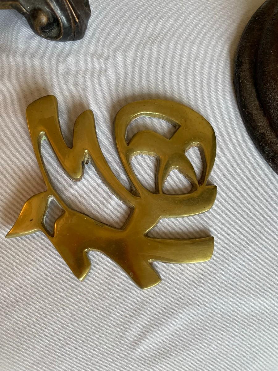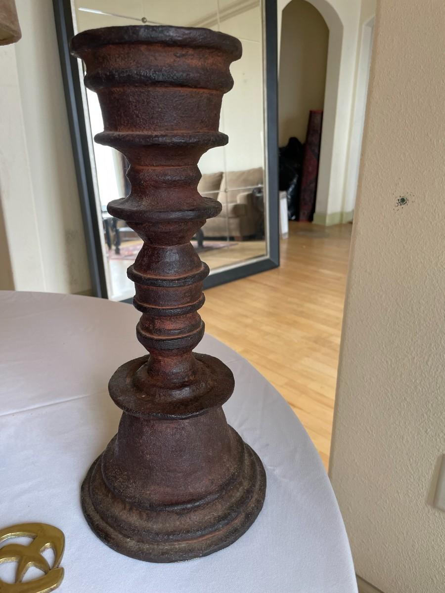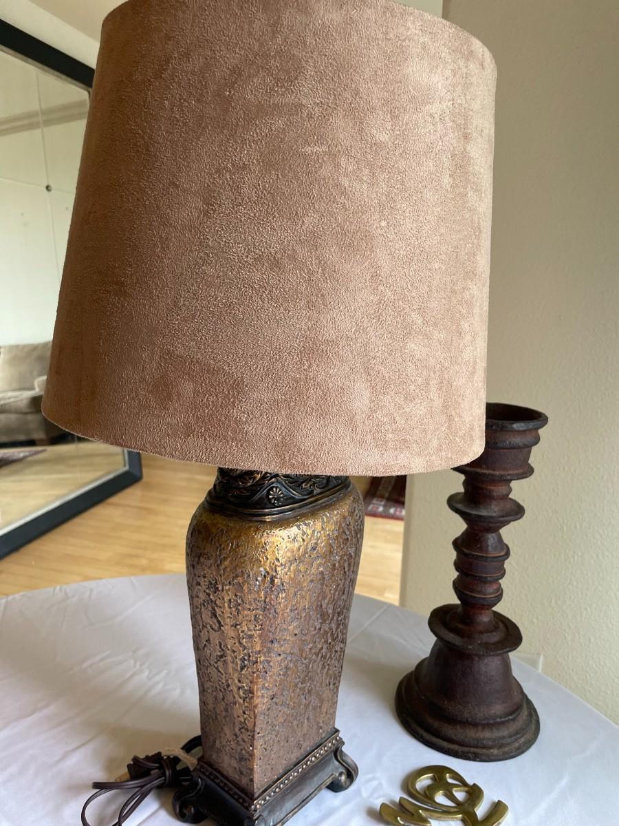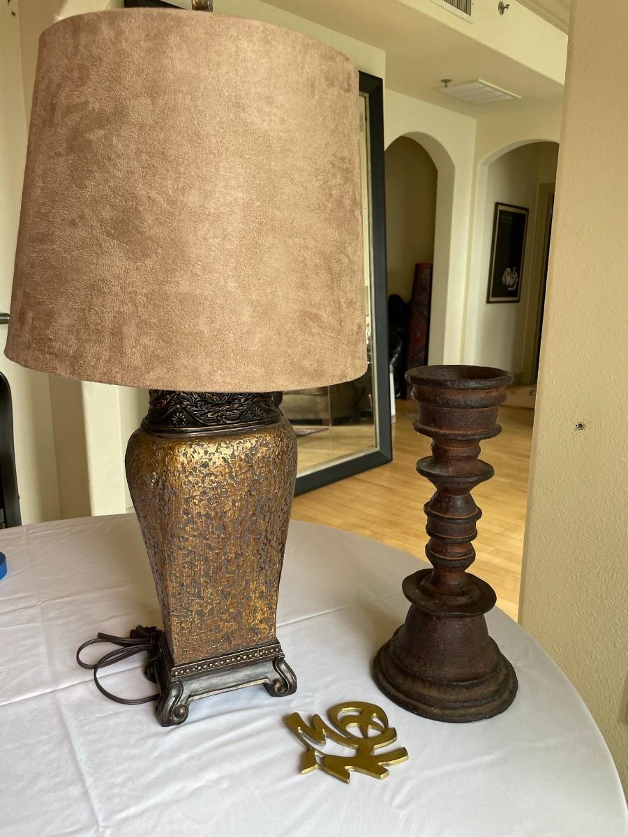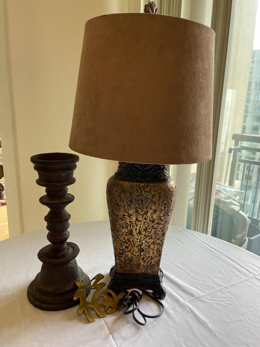 Lamp with Shade, 31" tall, wooden candle holder 16" T and Brass trivet