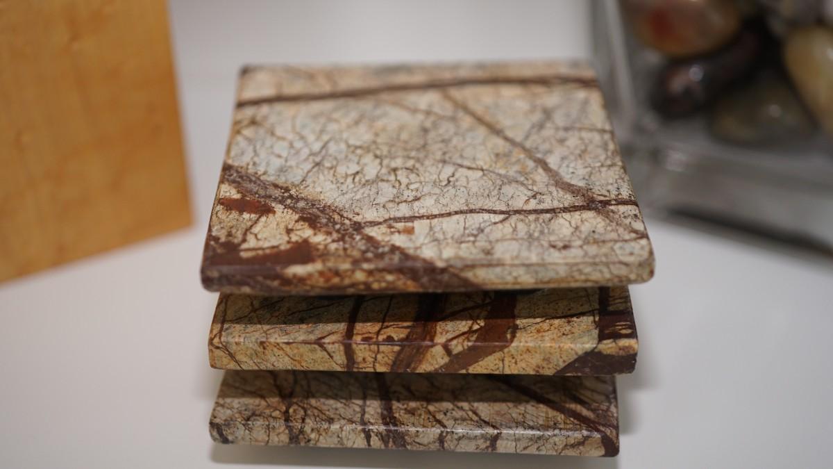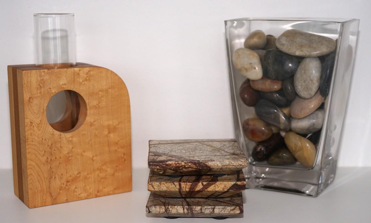 Decorative GROUPING OF BUD VASE IN ABSTRACT MAPLE HOLDER, GLASS VASE W/ POLISHED STONES, THREE GRANITE COASTERS