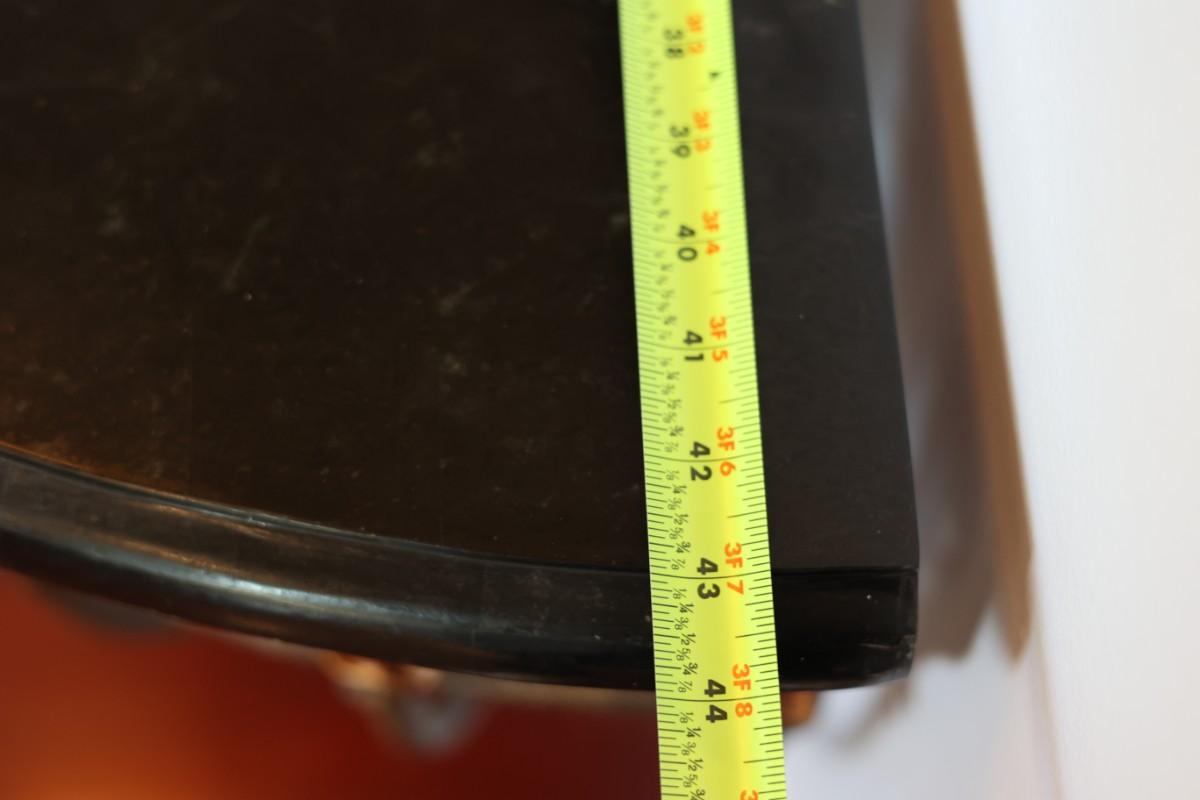 Half-moon shaped accent console designed to sit against a wall. Features decorative trim and a curved open base. Smooth finished top with rounded front edge. Nice piece for entryway, hallway, or accent wall use.