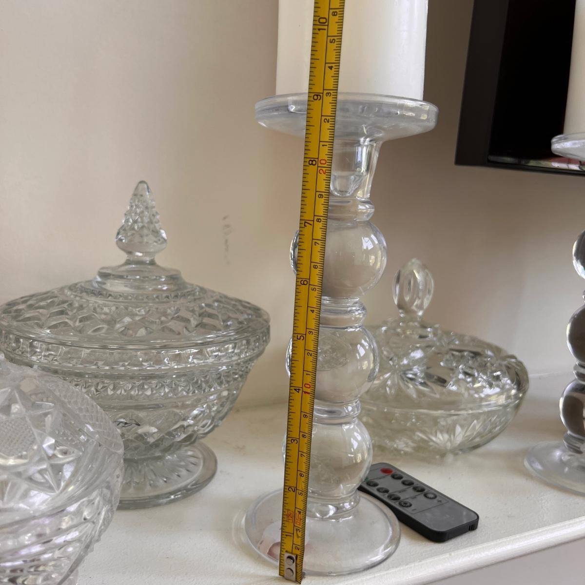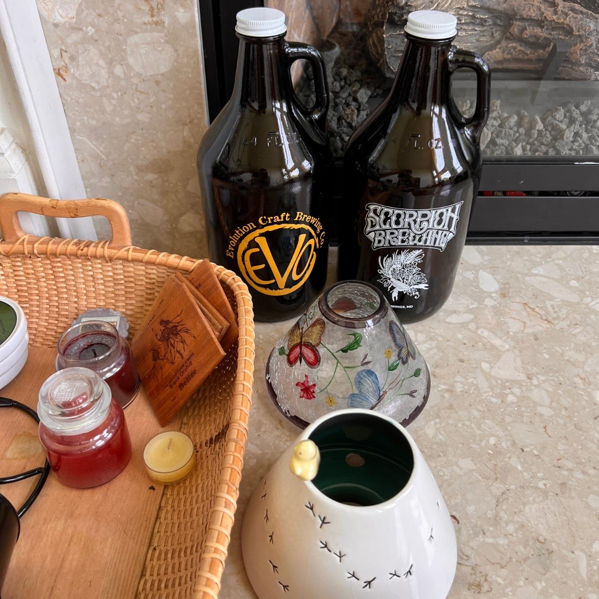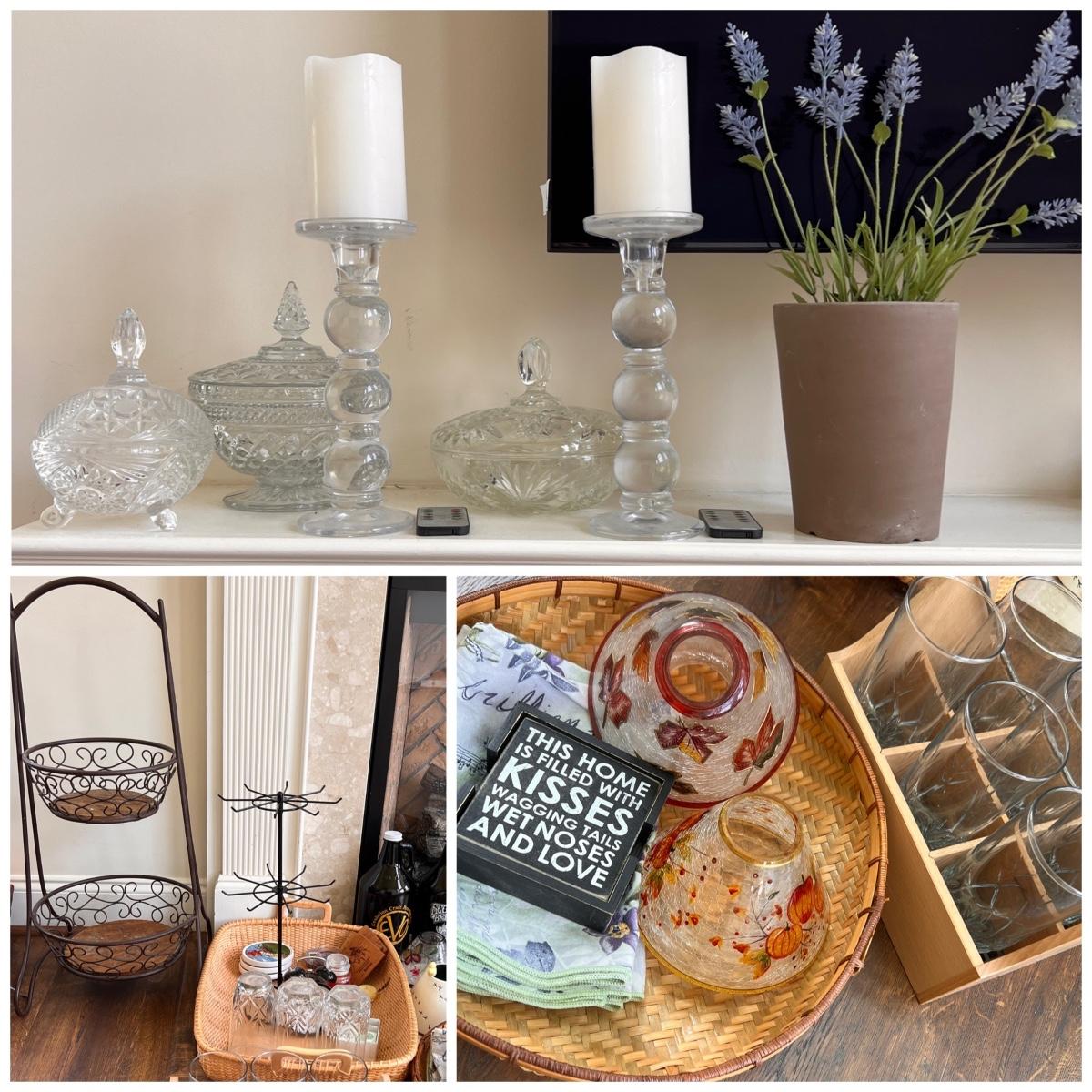 Glass bubble candle pillars, potted fake flowers, 3 etched glass candy dishes, coasters, set of 9 glasses, crackle glass jar shade toppers, metal and wood 2 tiered garden stand, 2 tier metal wire display, 2 serving basket, battery operated alarm clock, 2 growler jugs, candles, etc.