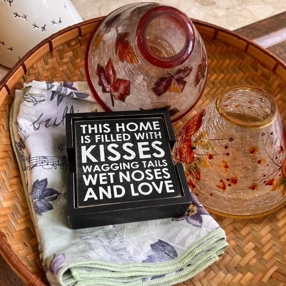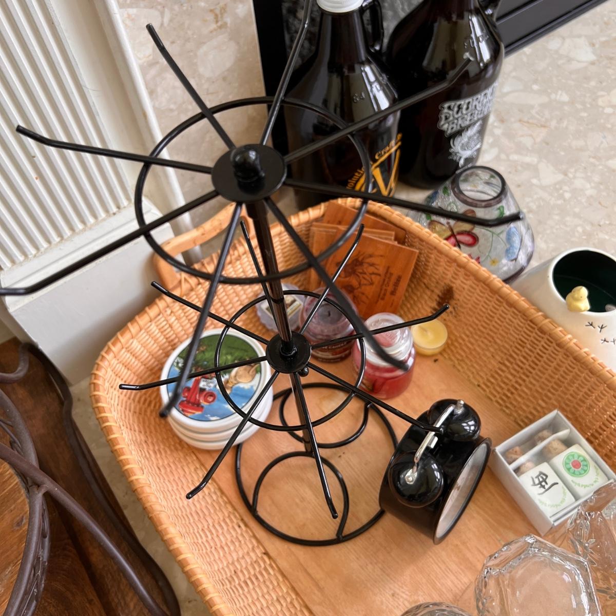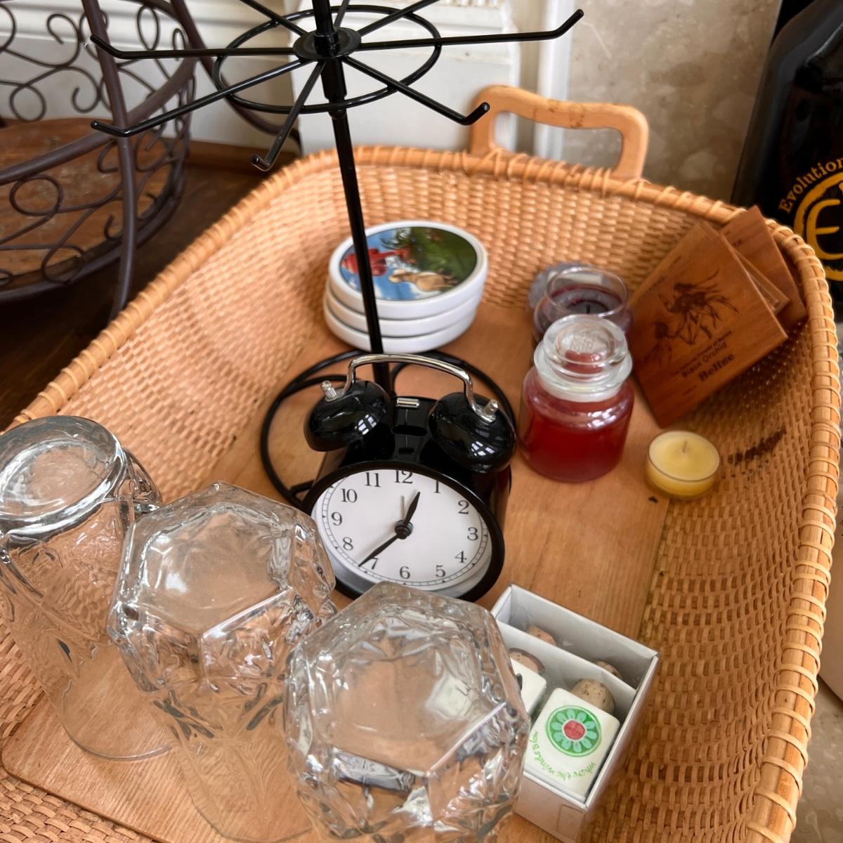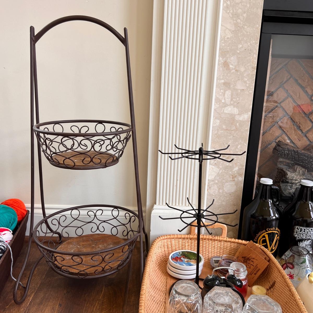 Glass bubble candle pillars, potted fake flowers, 3 etched glass candy dishes, coasters, set of 9 glasses, crackle glass jar shade toppers, metal and wood 2 tiered garden stand, 2 tier metal wire display, 2 serving basket, battery operated alarm clock, 2 growler jugs, candles, etc.