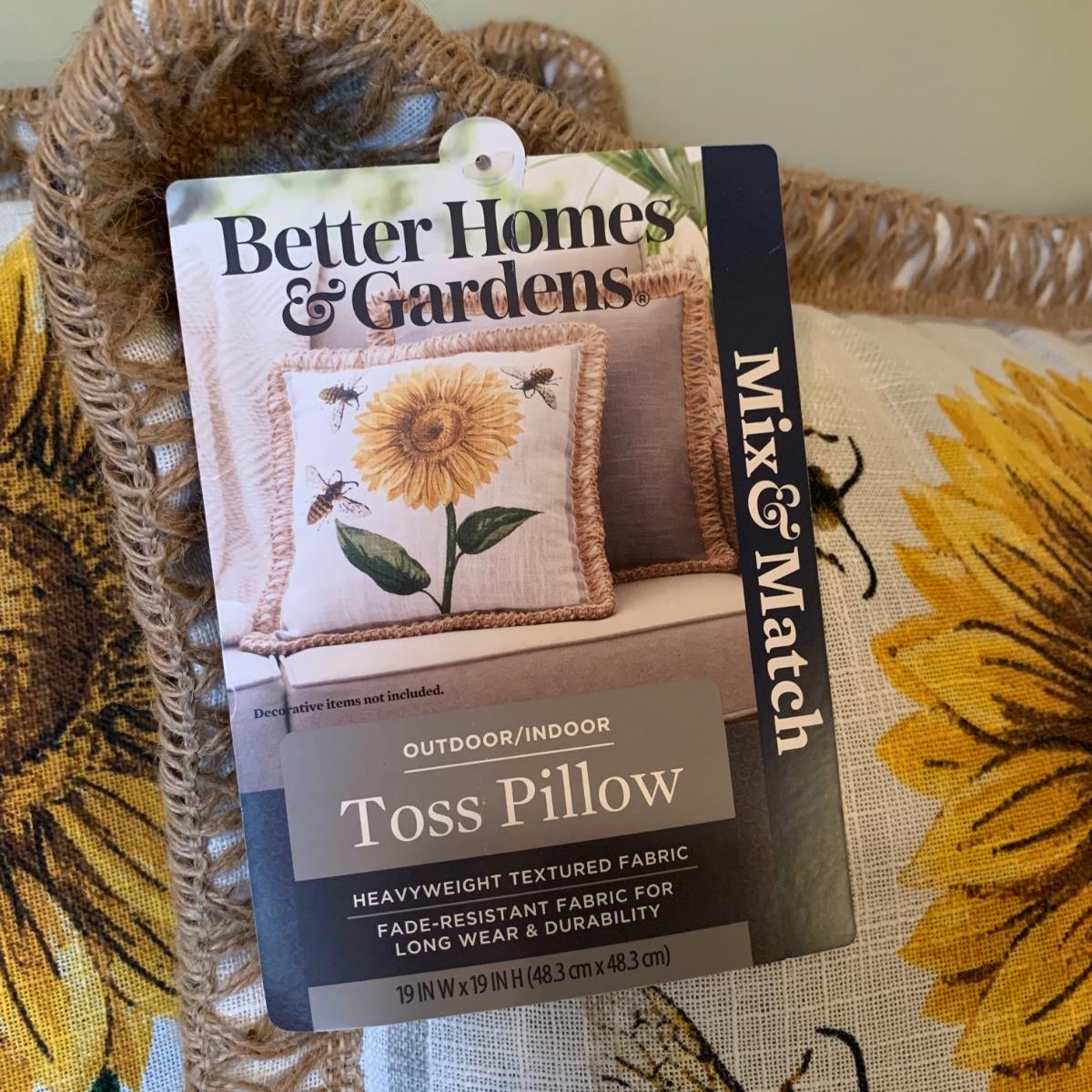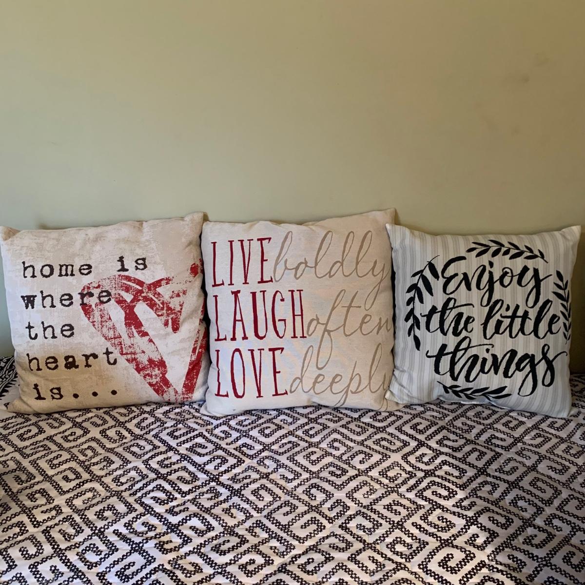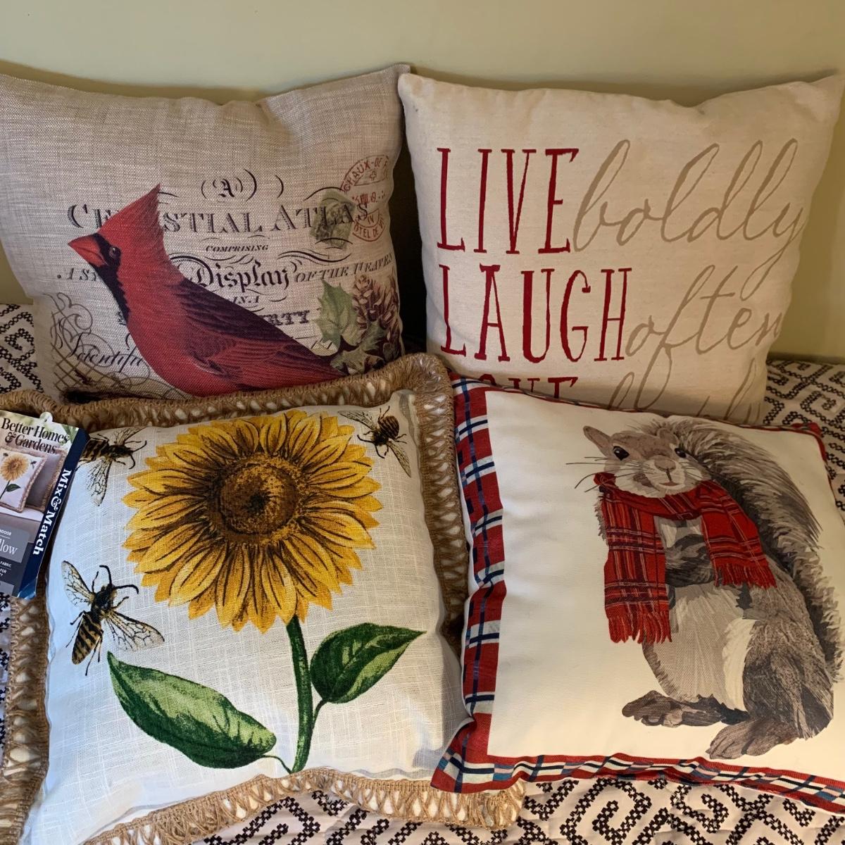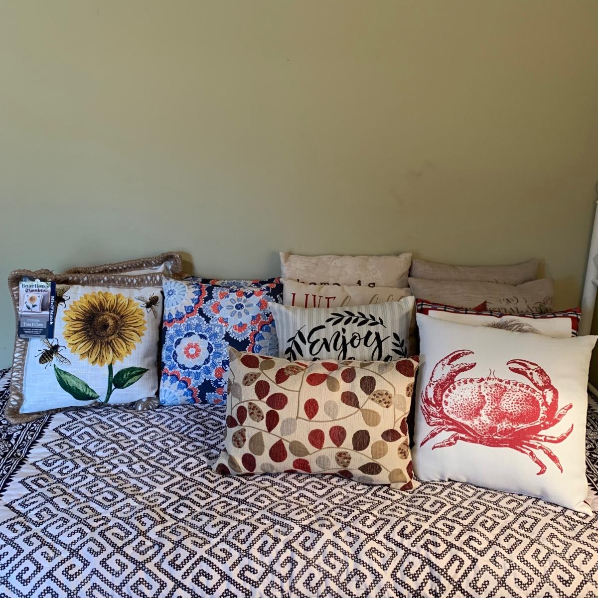A collection of 12 throw pillows. Two are new with tags from Better Homes & Gardens, these are indoor/outdoor pillows. The blue floral pair and “Enjoy the Little Things” also feel like they are indoor/outdoor, where the rest are all indoor. Most pillows are approximately 15”sq. and some are smaller.