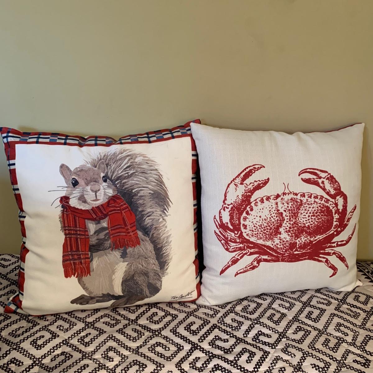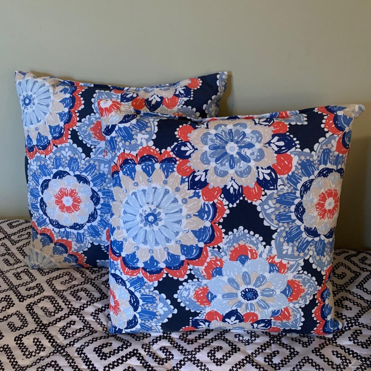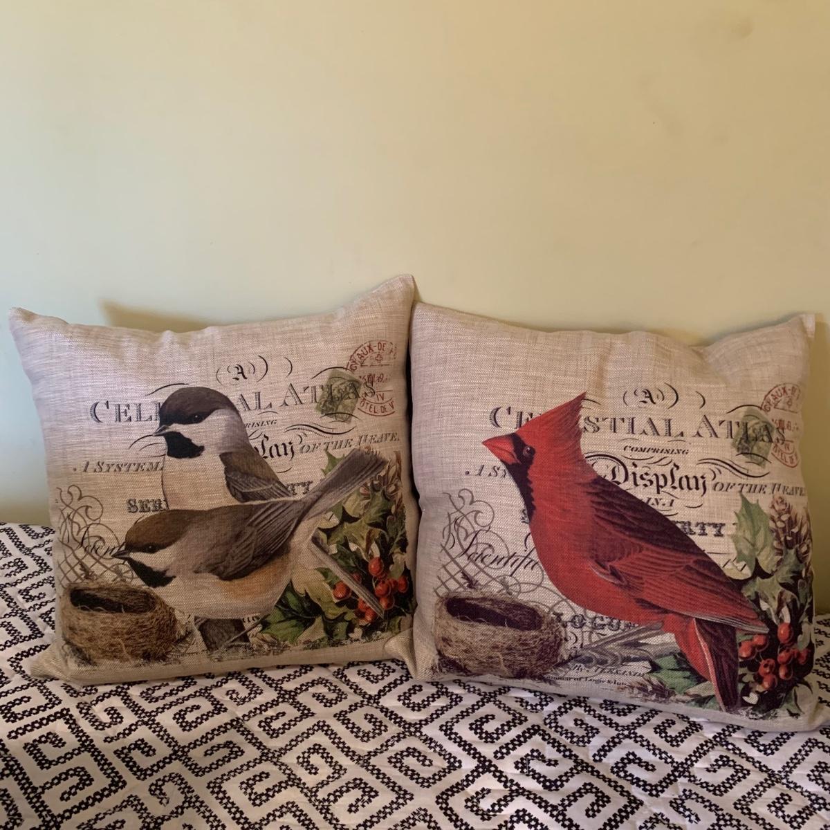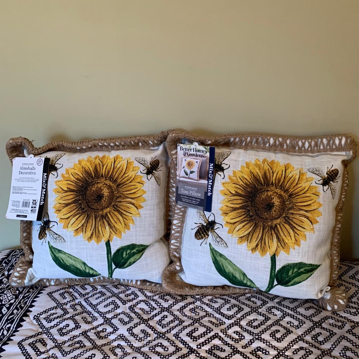 A collection of 12 throw pillows. Two are new with tags from Better Homes & Gardens, these are indoor/outdoor pillows. The blue floral pair and “Enjoy the Little Things” also feel like they are indoor/outdoor, where the rest are all indoor. Most pillows are approximately 15”sq. and some are smaller.
