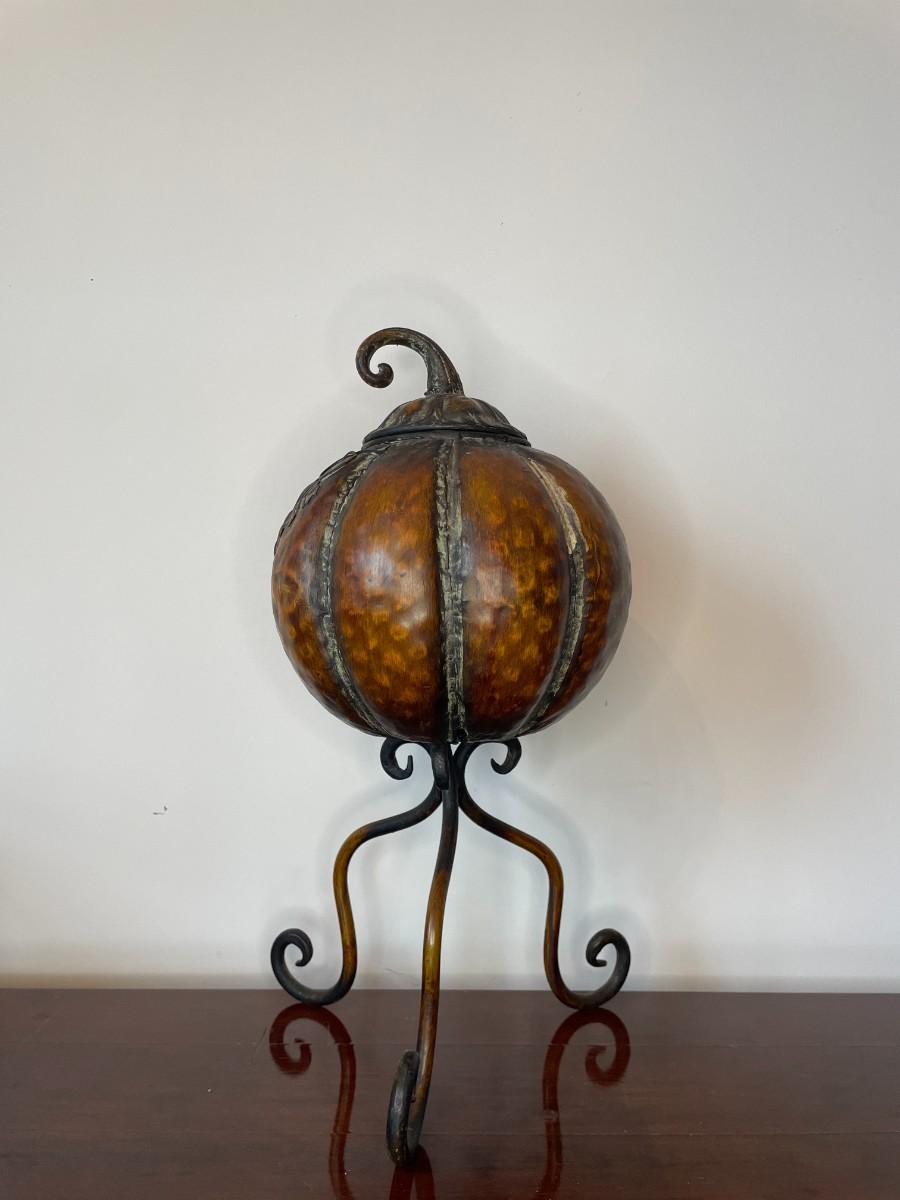 18 1/2" H x 9"W. Rustic metal decorative pumpkin.