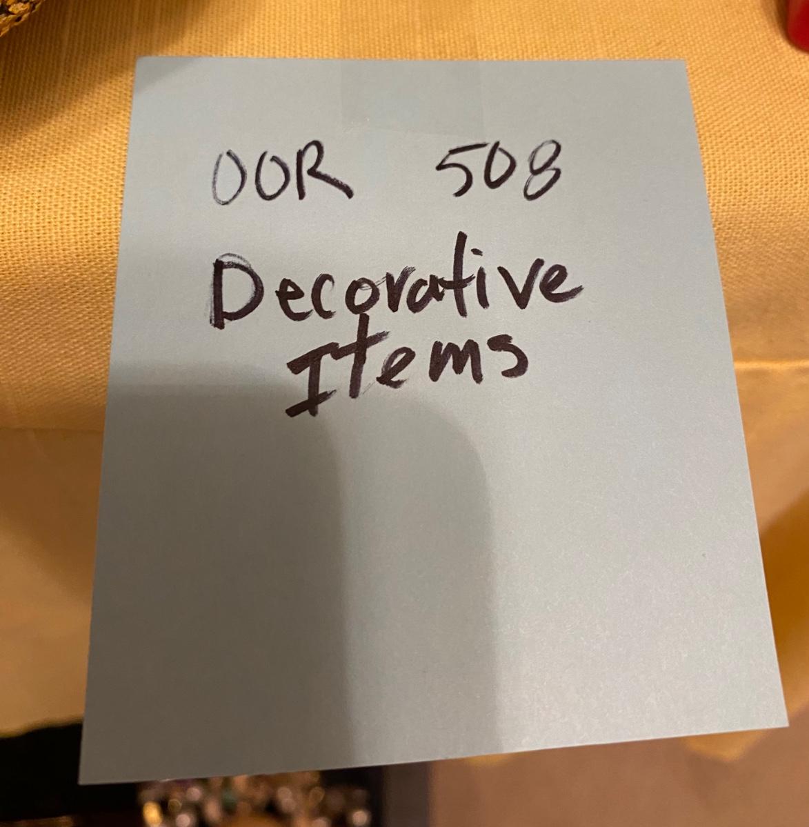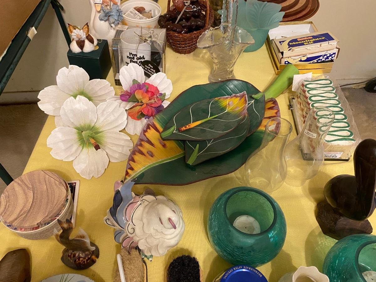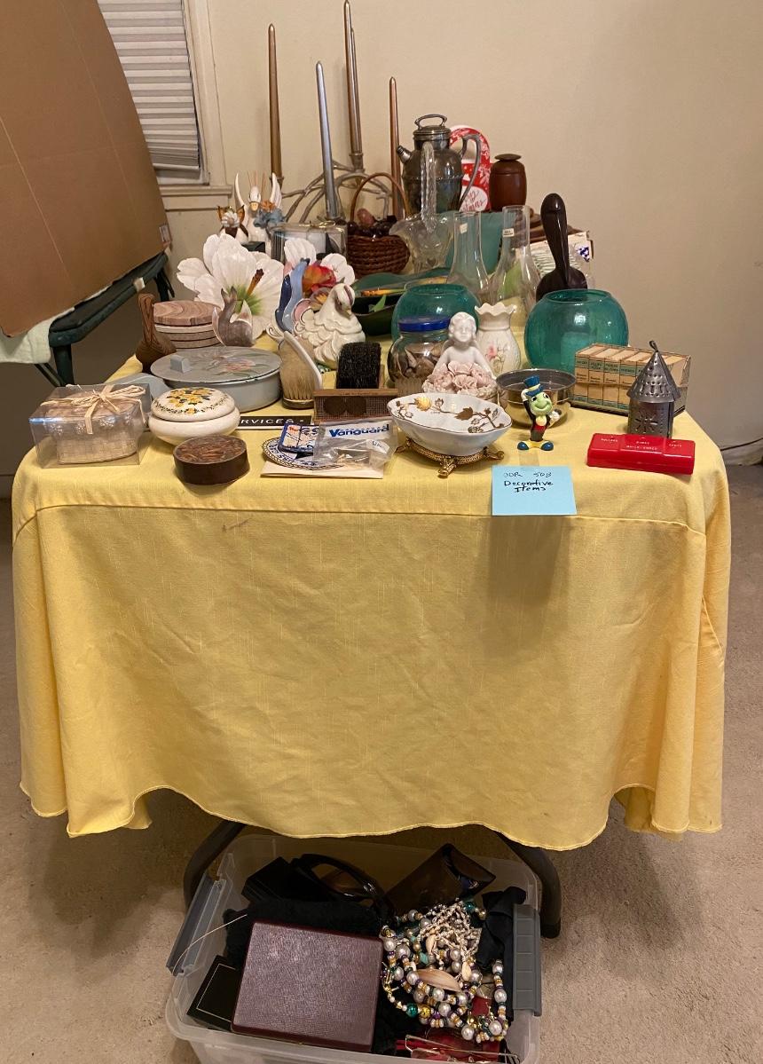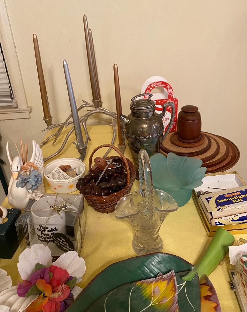 Candles, candle holders, various sizes of wood chargers, decorative items and costume jewelry.