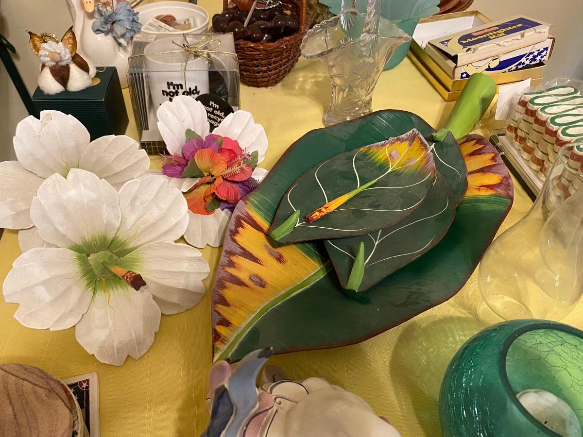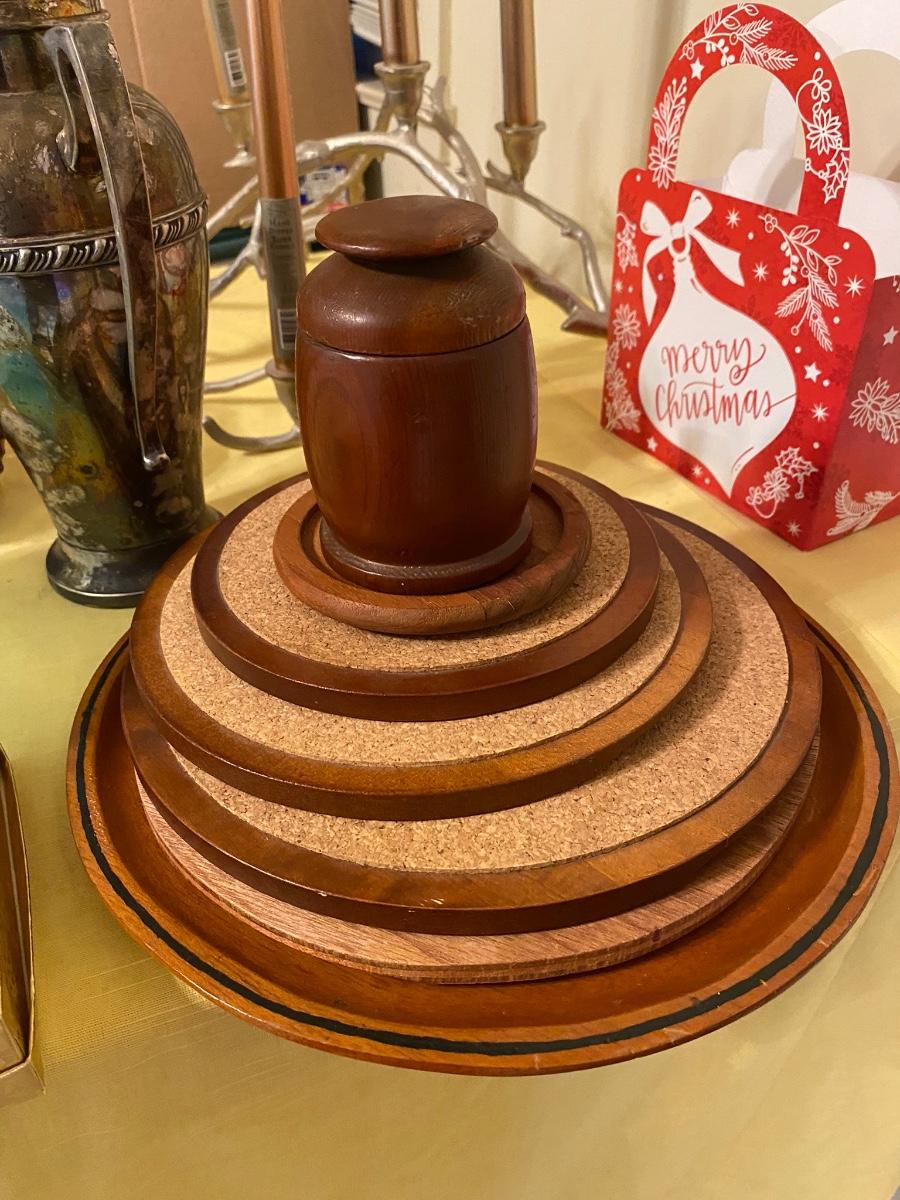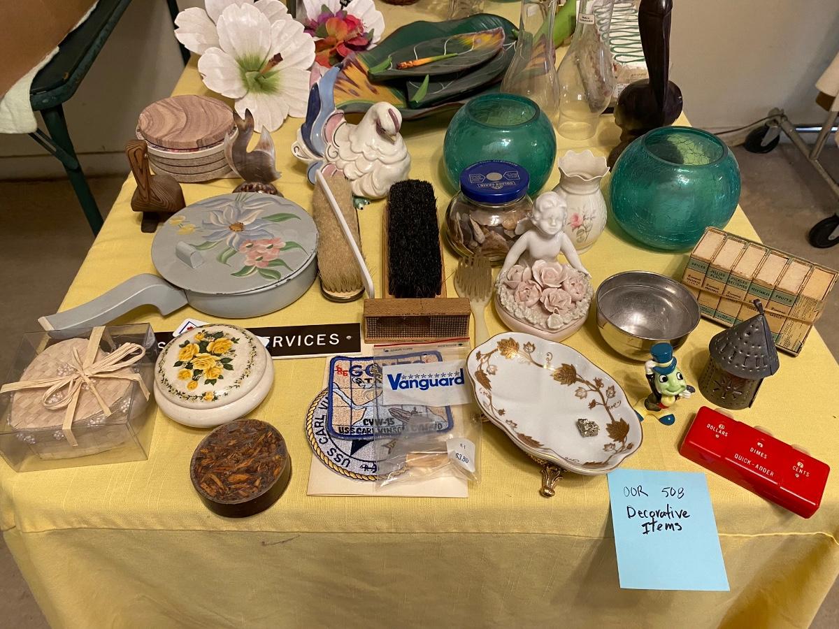 Candles, candle holders, various sizes of wood chargers, decorative items and costume jewelry.