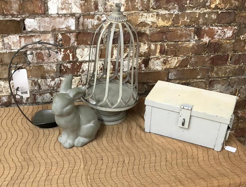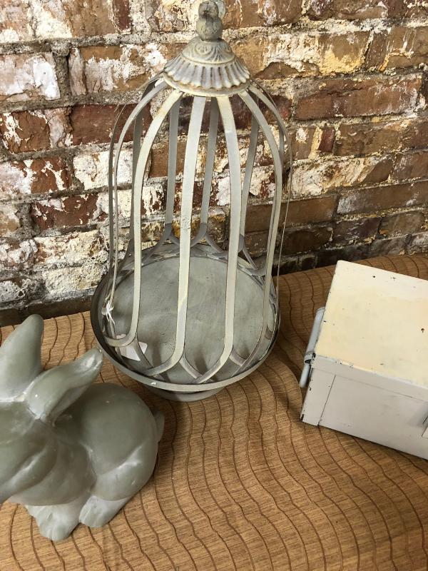 Mixed lot of decorative items, cage is 19: tall, box 12"x6"x6".