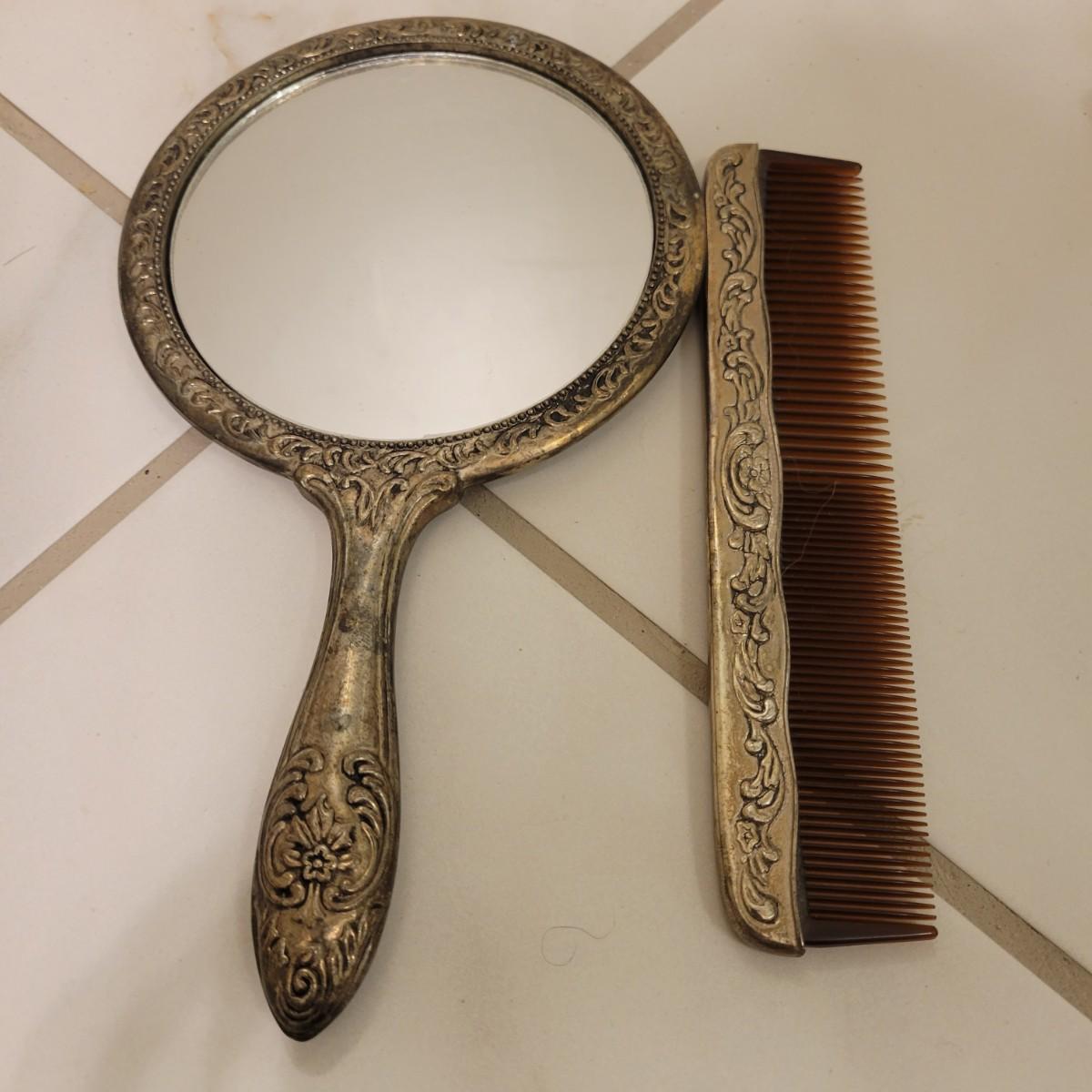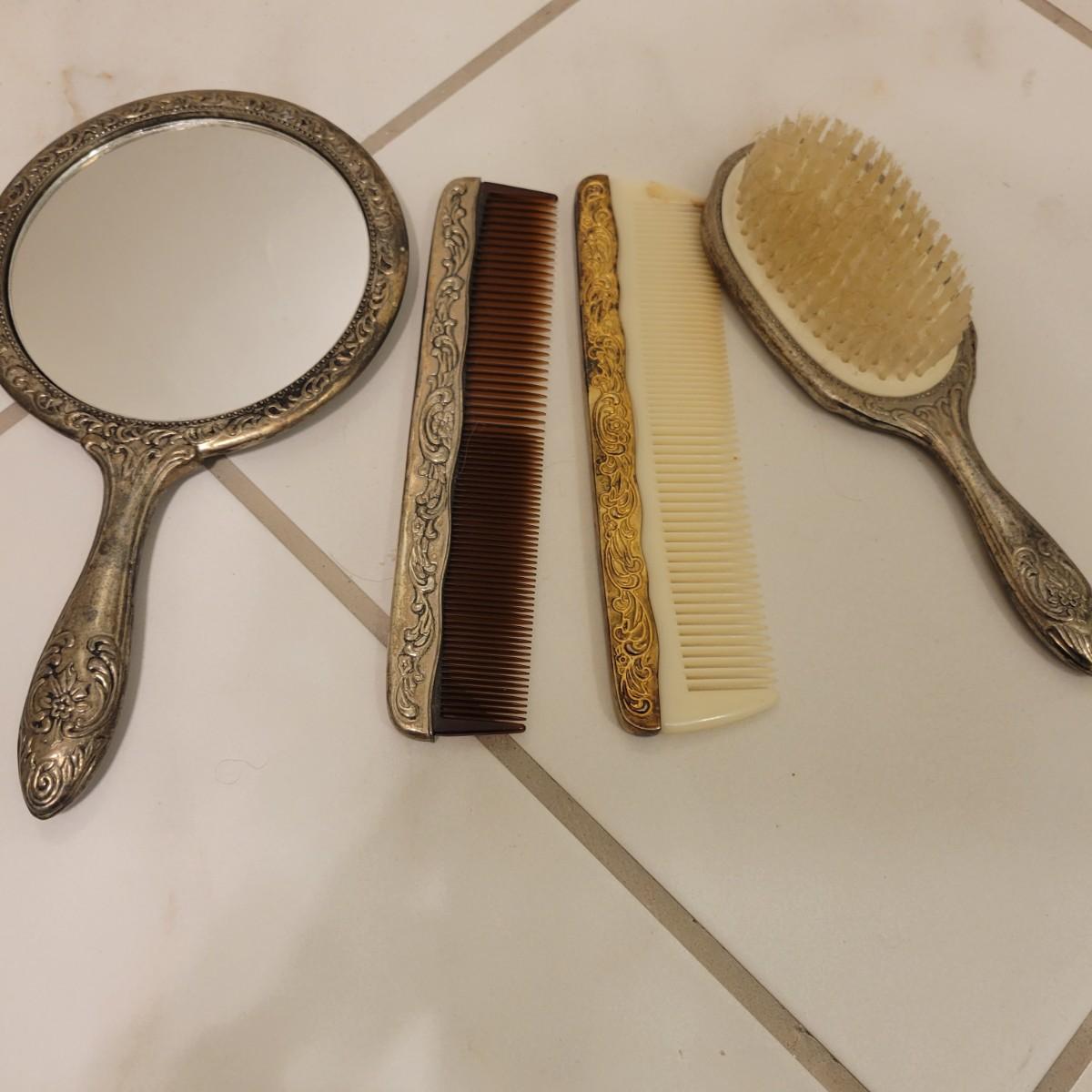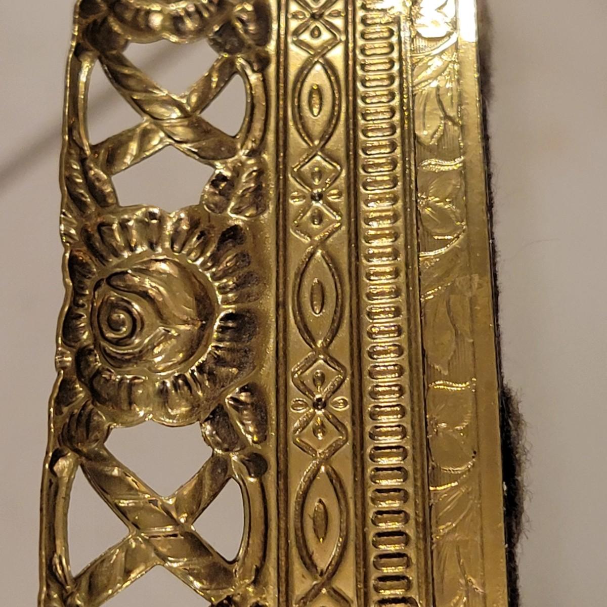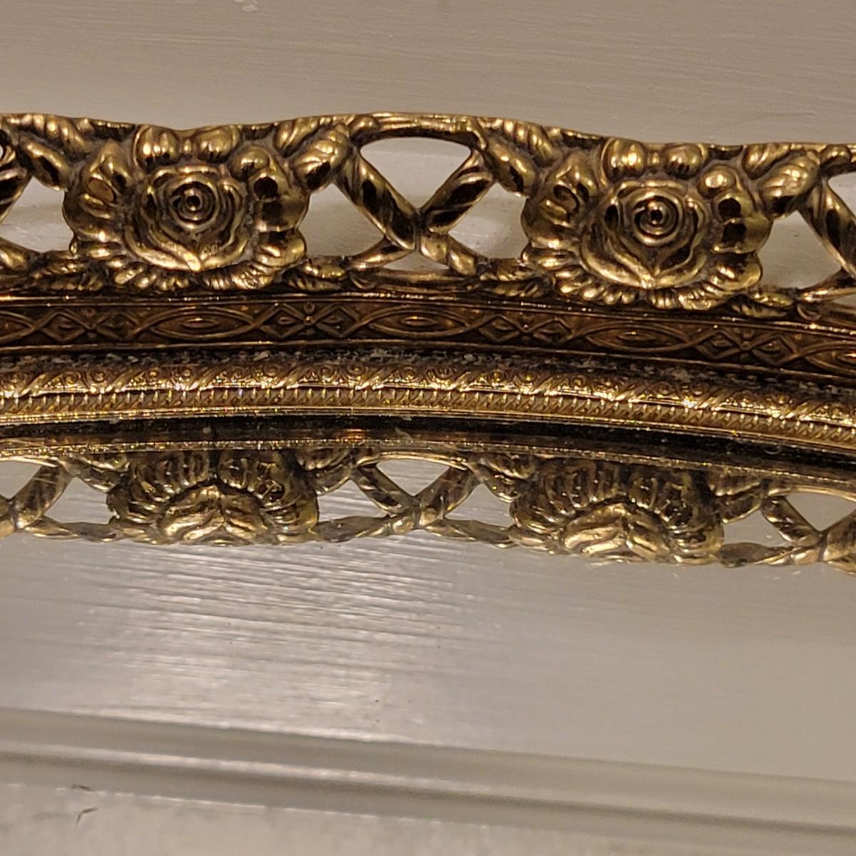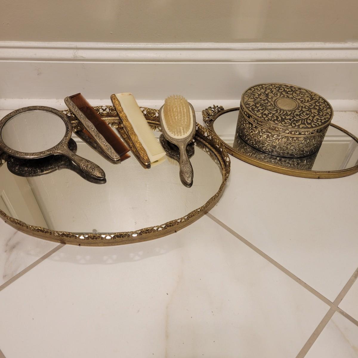 An assortment of decorative metal bathroom accessories in good condition with no notable damage. This lot includes two intricate display mirrors with metal exteriors with a floral pattern. Also included is a velvet lined box with an intricate metal exterior, a mirror, brush, and two combs with similar levels of detail. Largest mirror measures approximately 17" x 12.5 " x 1.5" Local pickup only
