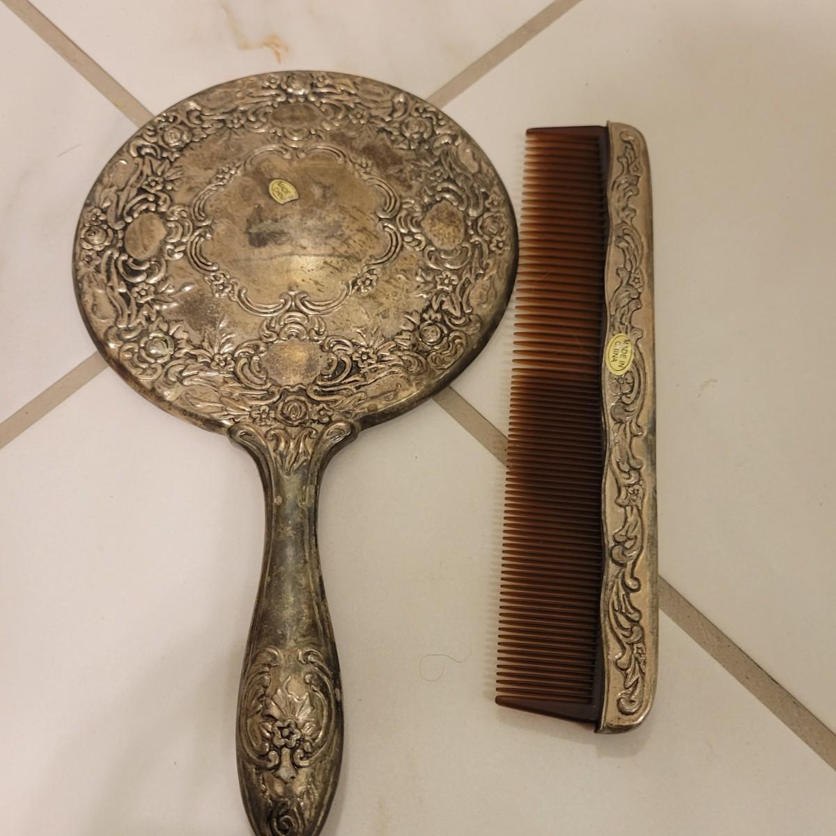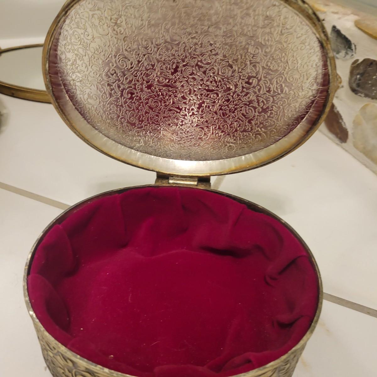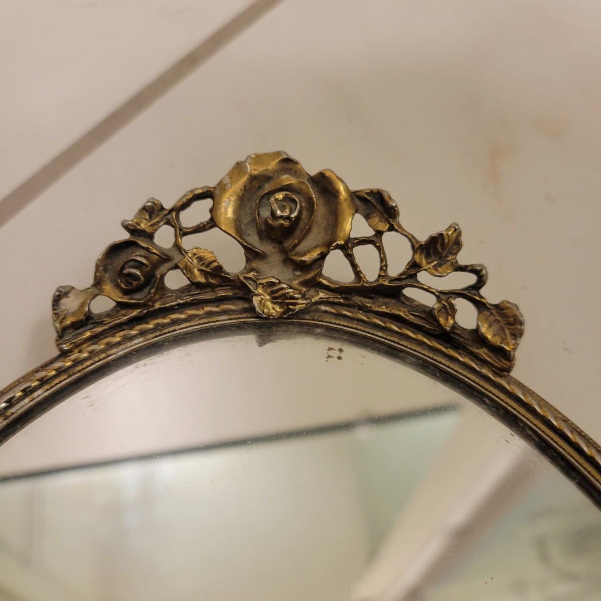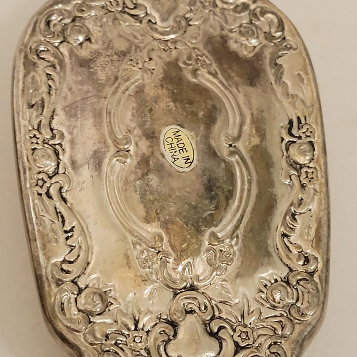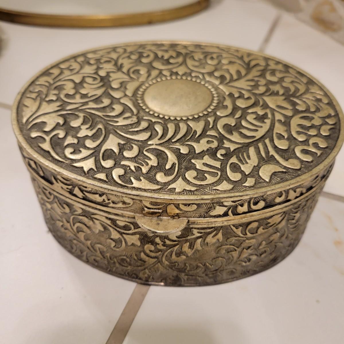An assortment of decorative metal bathroom accessories in good condition with no notable damage. This lot includes two intricate display mirrors with metal exteriors with a floral pattern. Also included is a velvet lined box with an intricate metal exterior, a mirror, brush, and two combs with similar levels of detail. Largest mirror measures approximately 17" x 12.5 " x 1.5" Local pickup only