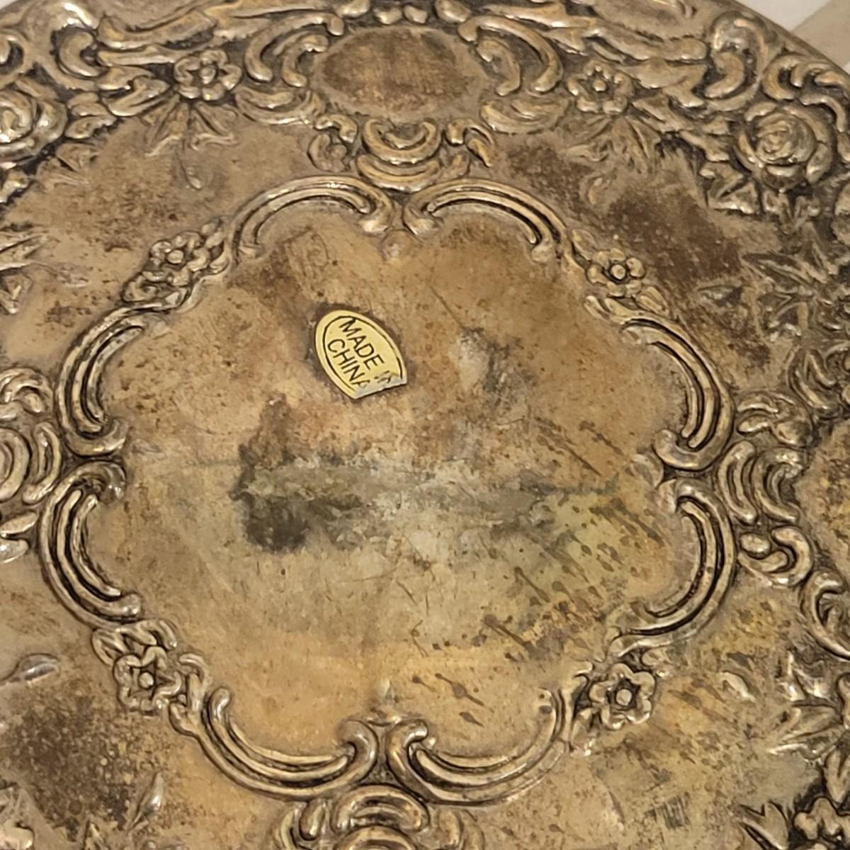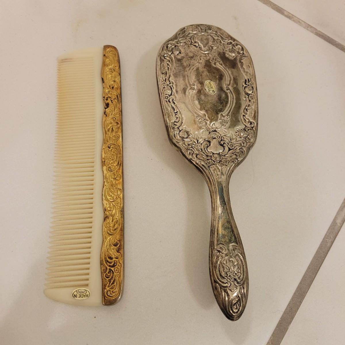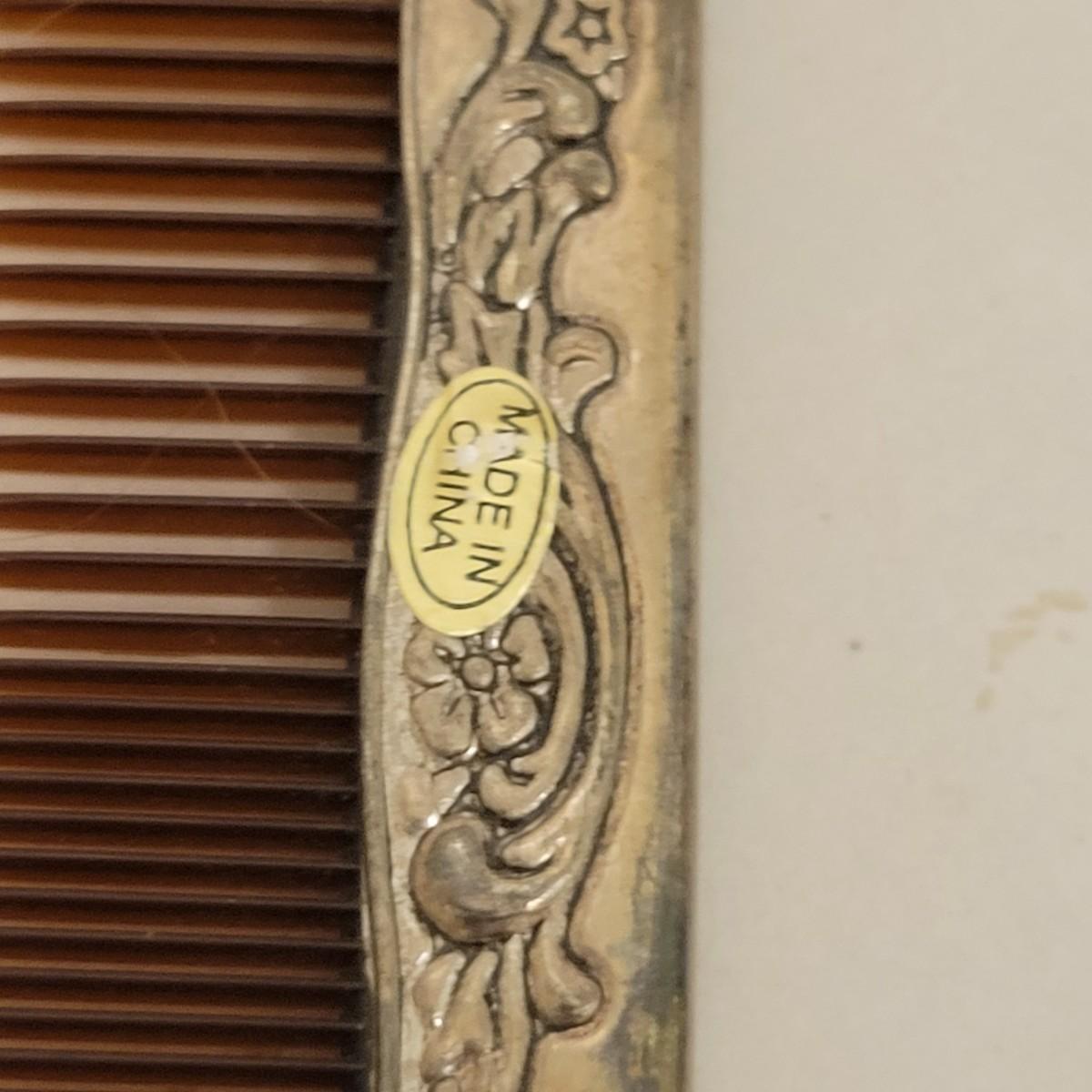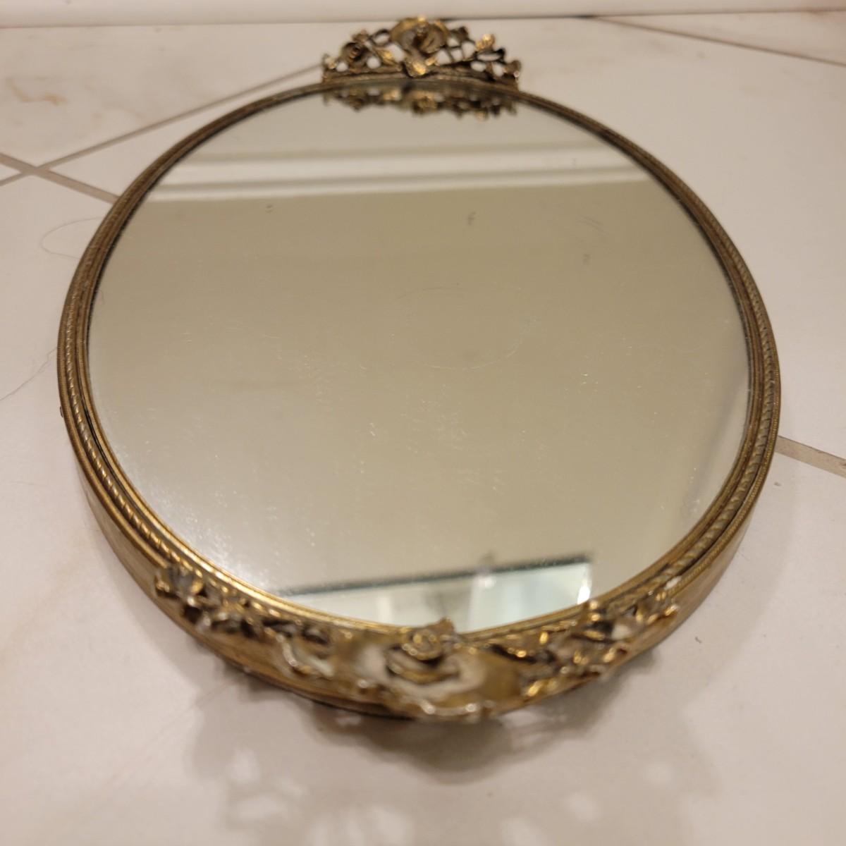 An assortment of decorative metal bathroom accessories in good condition with no notable damage. This lot includes two intricate display mirrors with metal exteriors with a floral pattern. Also included is a velvet lined box with an intricate metal exterior, a mirror, brush, and two combs with similar levels of detail. Largest mirror measures approximately 17" x 12.5 " x 1.5" Local pickup only