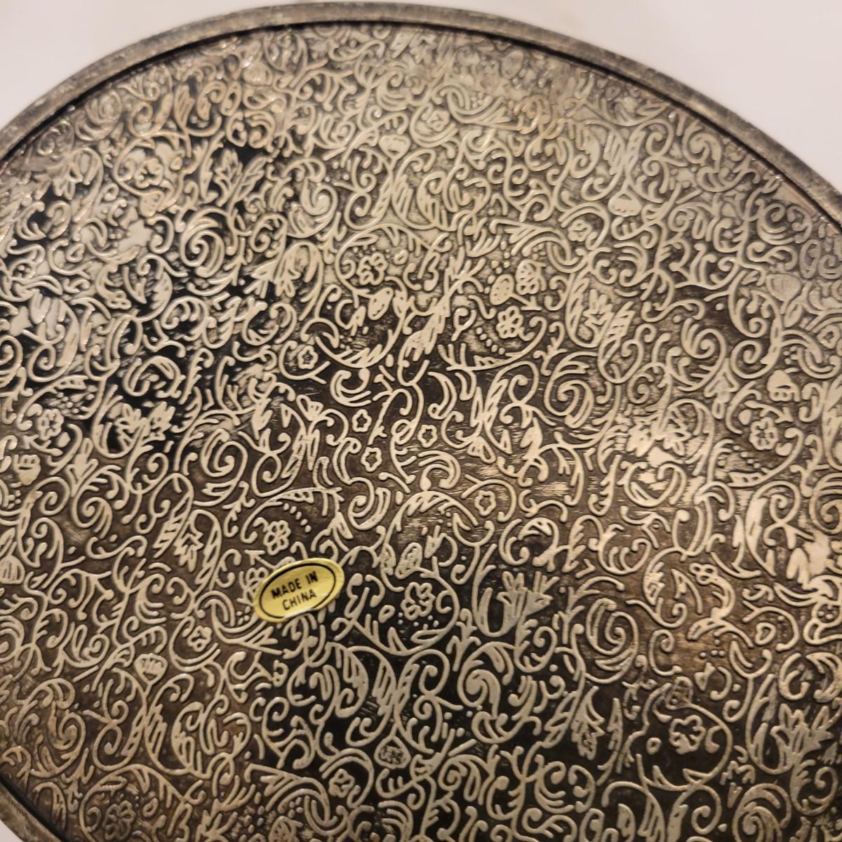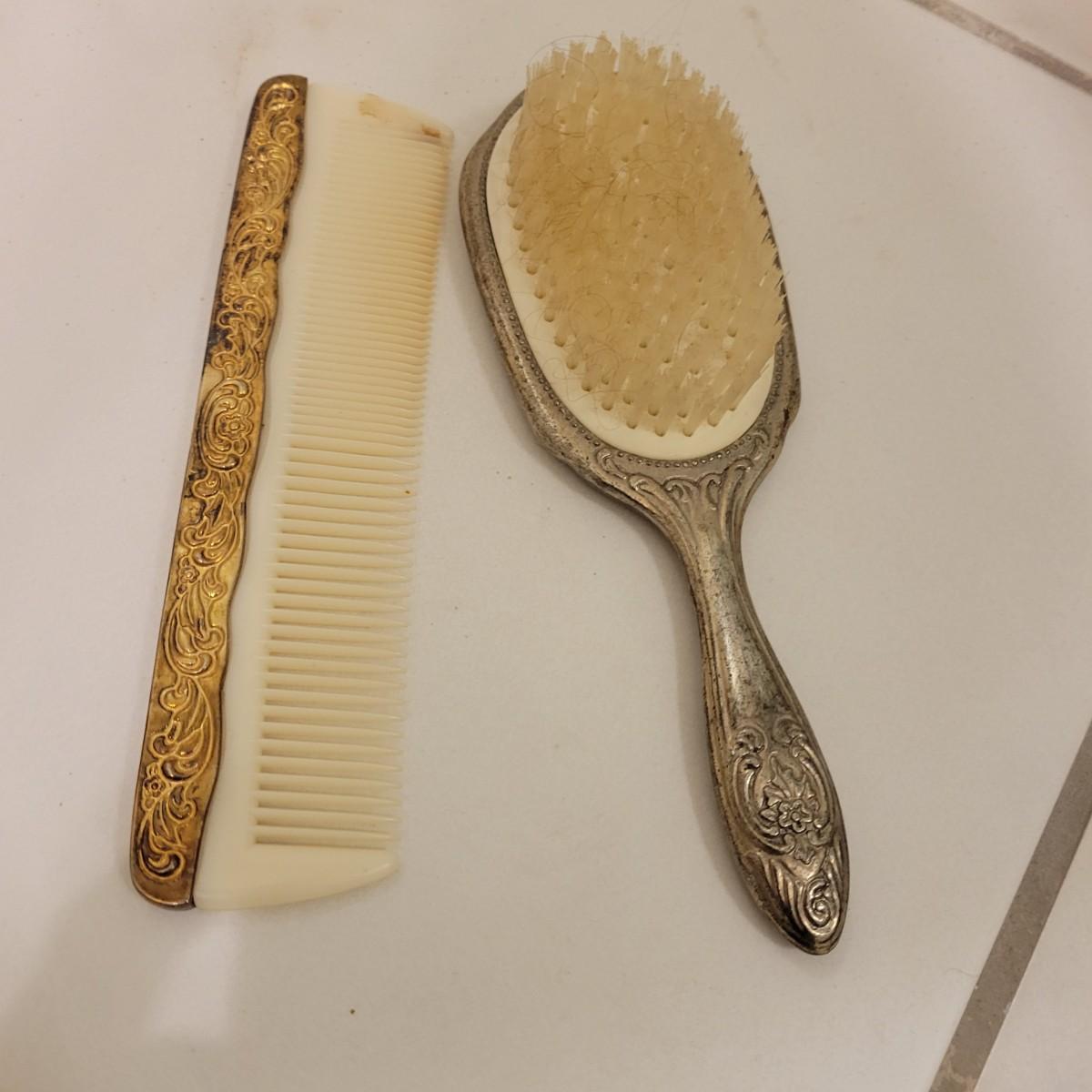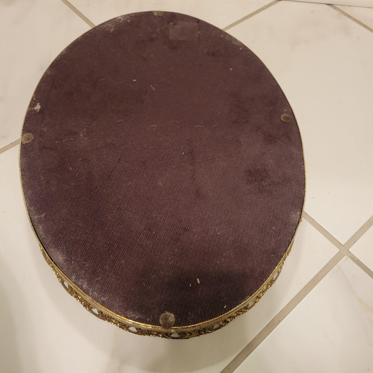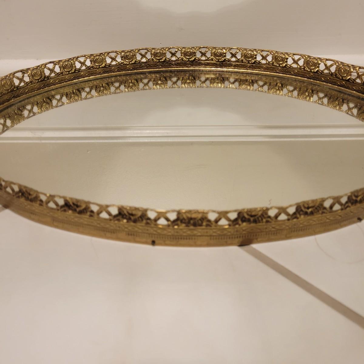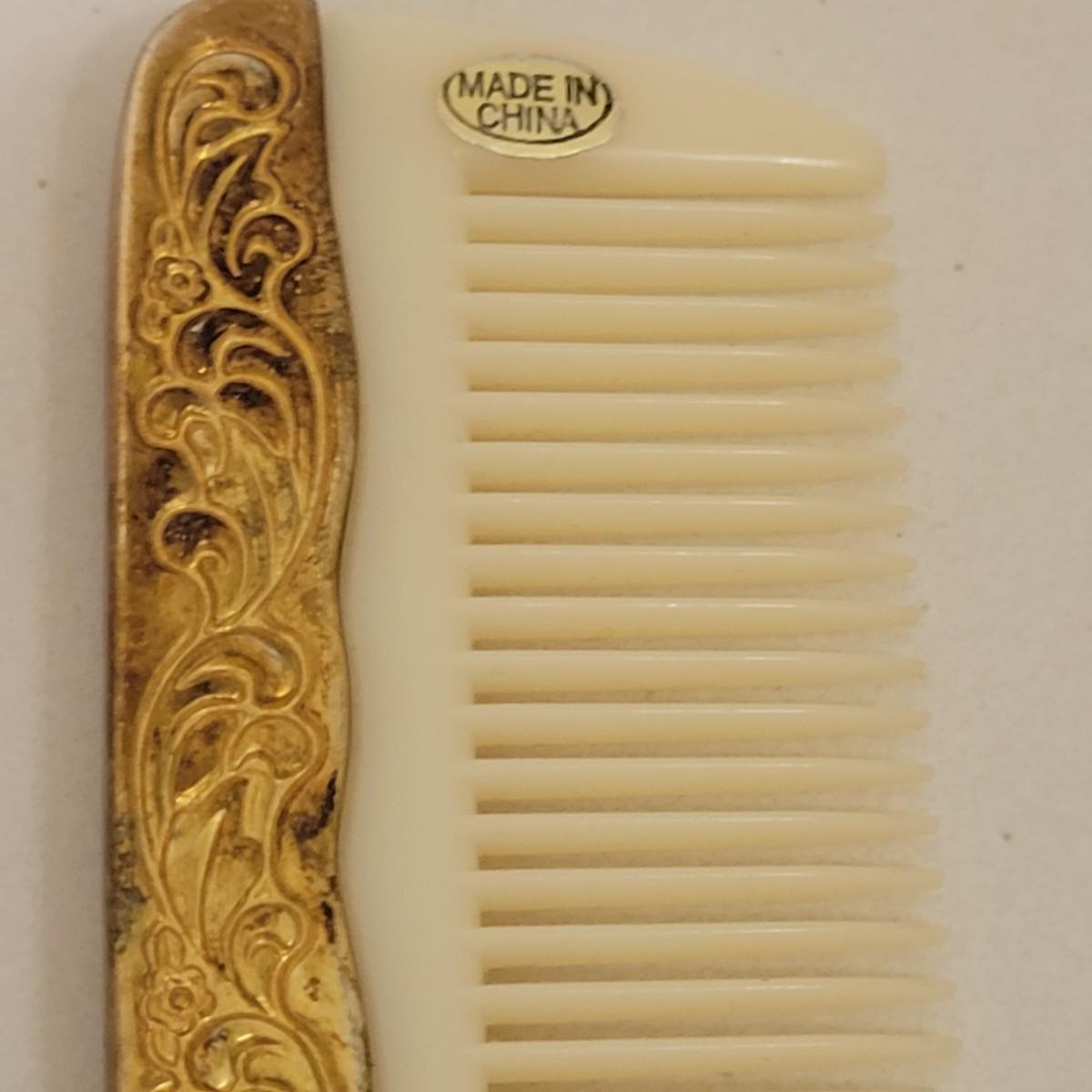 An assortment of decorative metal bathroom accessories in good condition with no notable damage. This lot includes two intricate display mirrors with metal exteriors with a floral pattern. Also included is a velvet lined box with an intricate metal exterior, a mirror, brush, and two combs with similar levels of detail. Largest mirror measures approximately 17" x 12.5 " x 1.5" Local pickup only