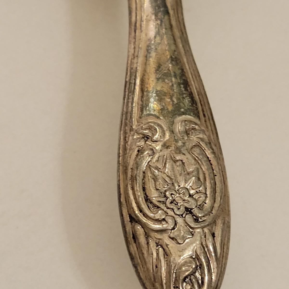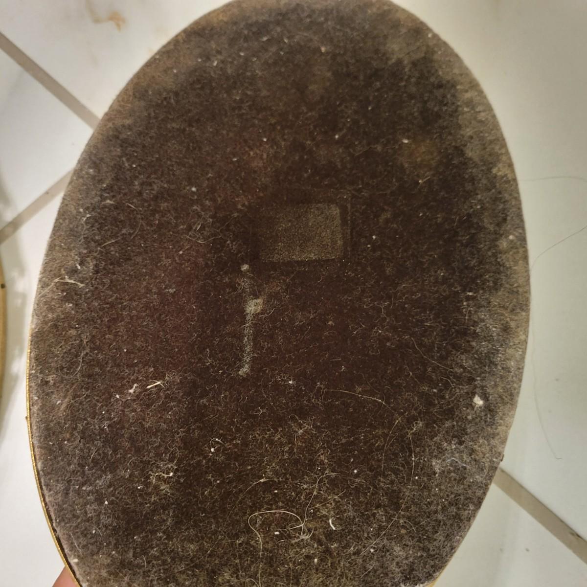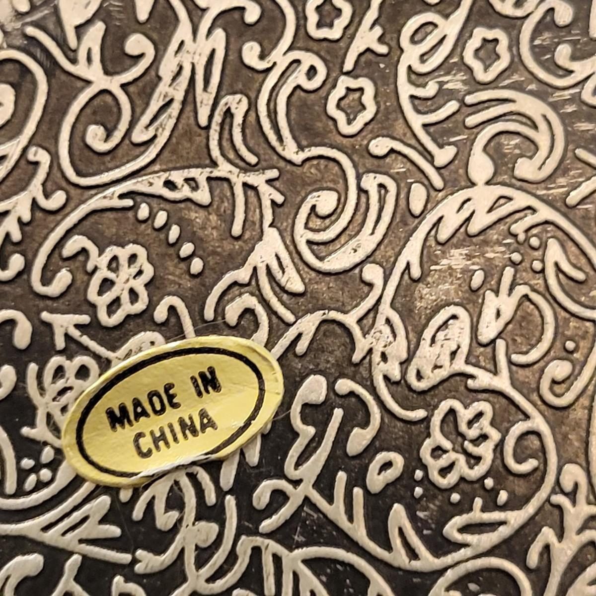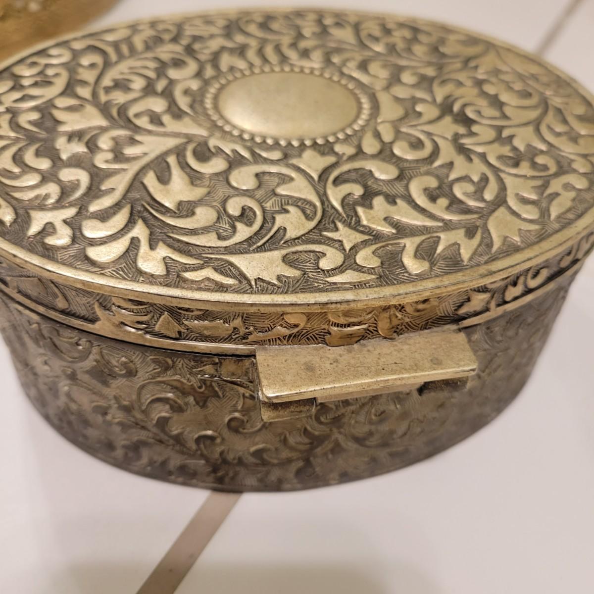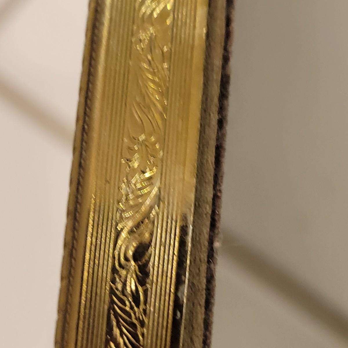 An assortment of decorative metal bathroom accessories in good condition with no notable damage. This lot includes two intricate display mirrors with metal exteriors with a floral pattern. Also included is a velvet lined box with an intricate metal exterior, a mirror, brush, and two combs with similar levels of detail. Largest mirror measures approximately 17" x 12.5 " x 1.5" Local pickup only