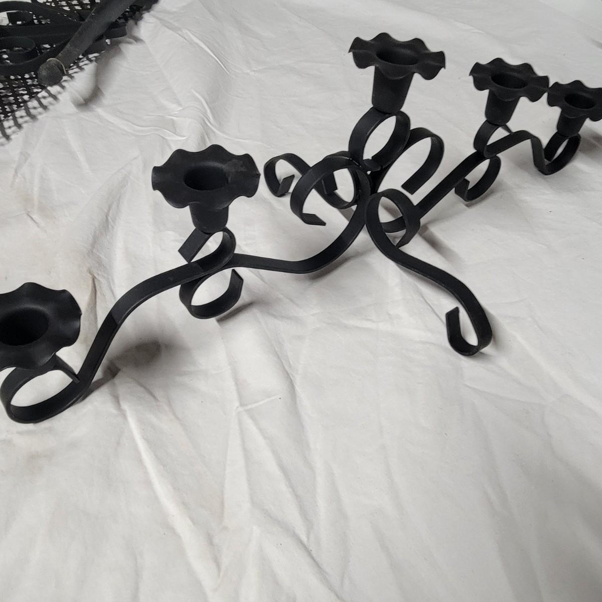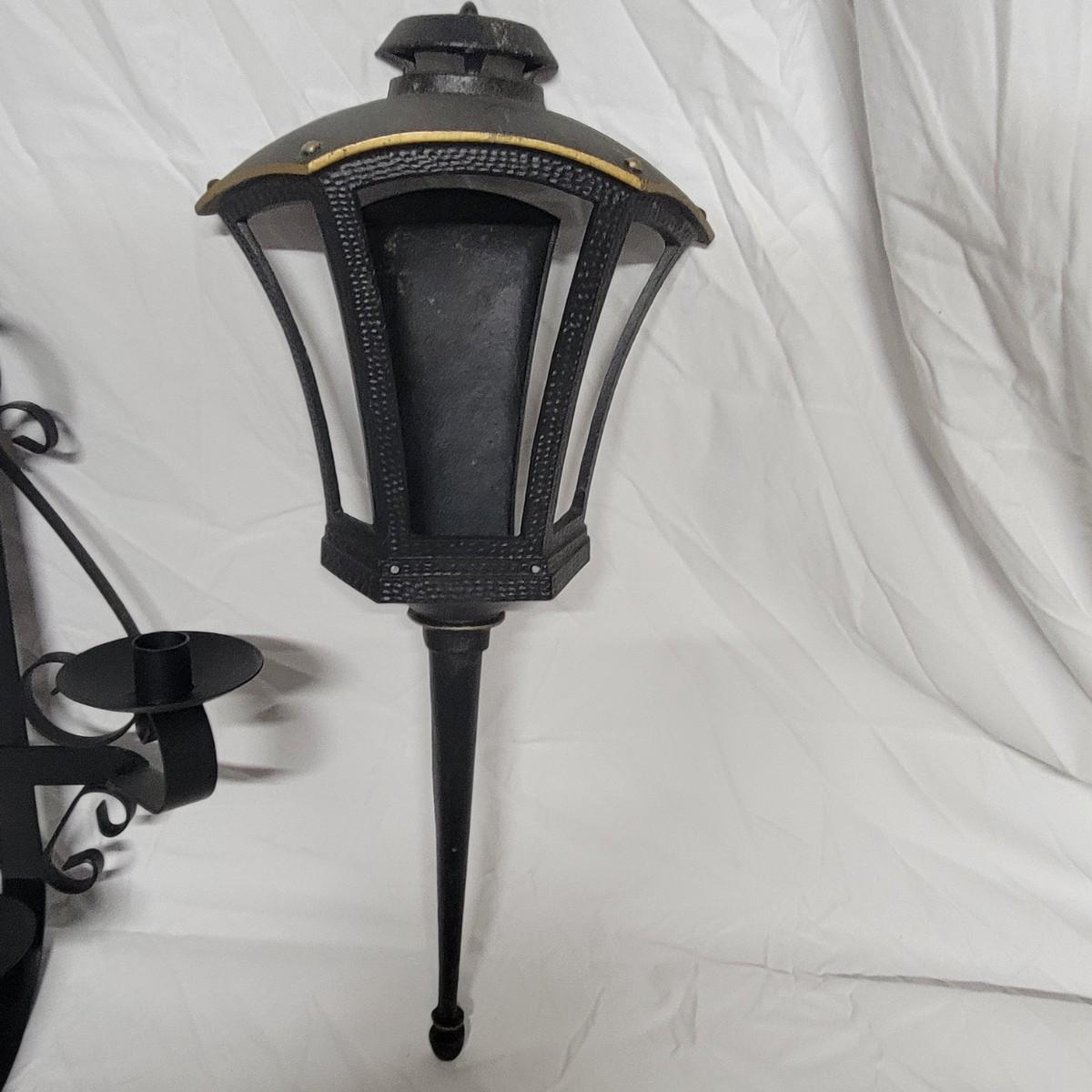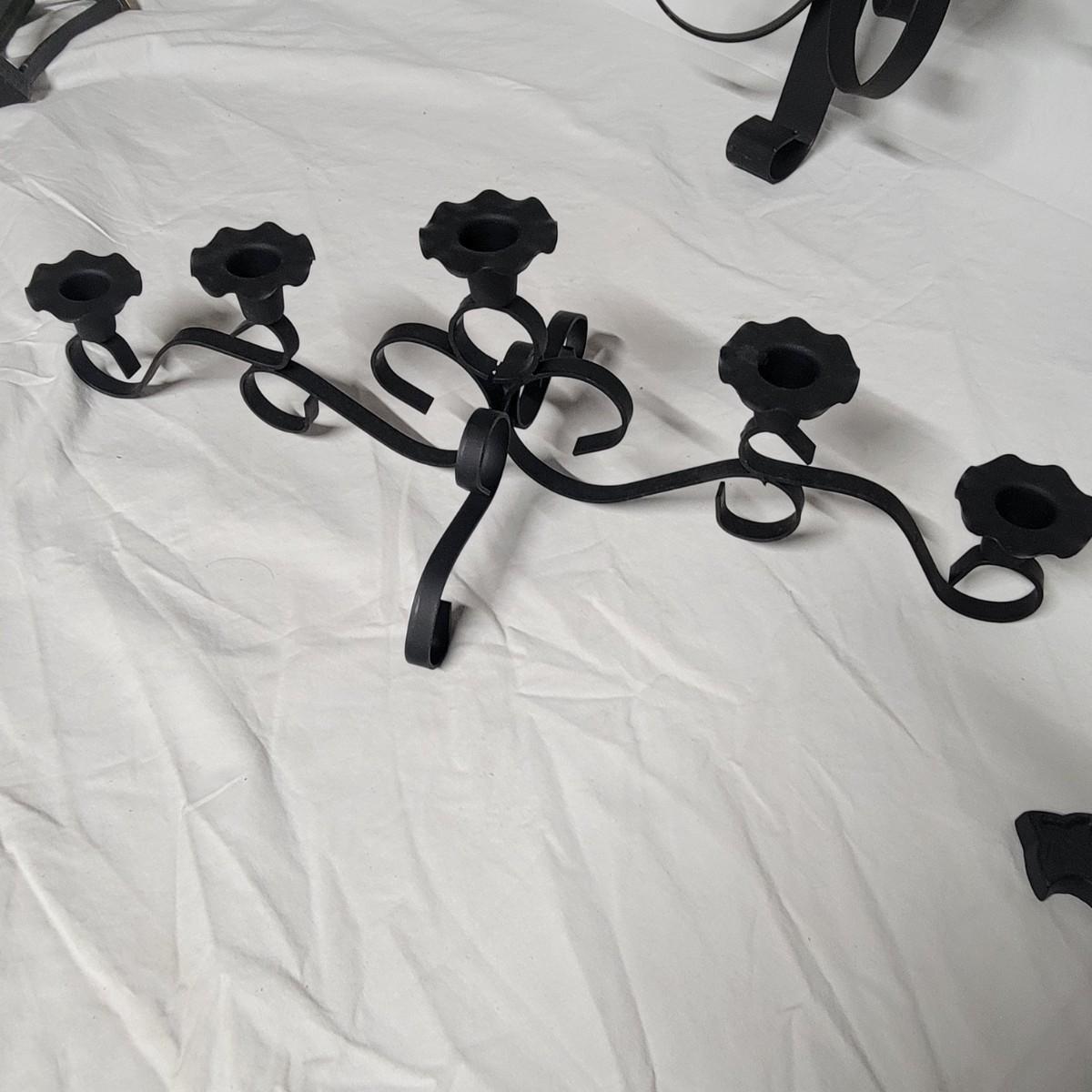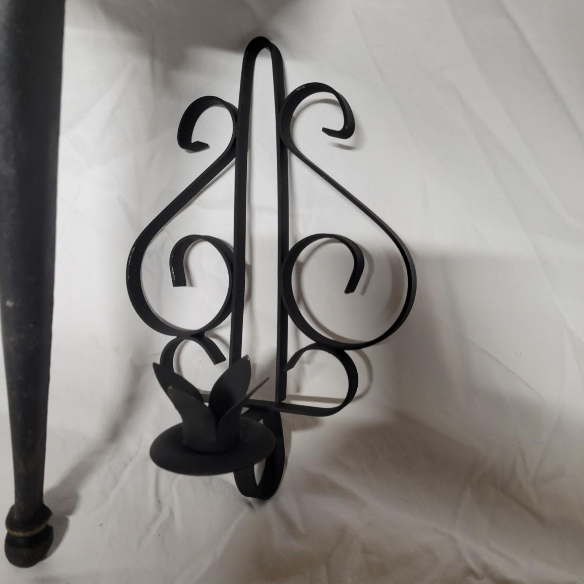 An assortment of eight metal candleholders and a small wall shelf. All items are made of metal and the largest sconce upright measures approximately 10" x 4.5" x 20"H. Local pickup only