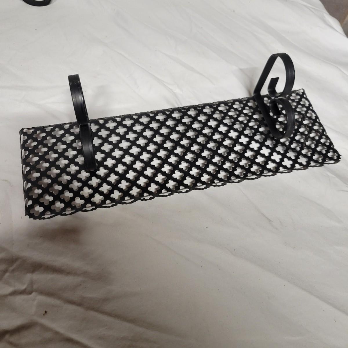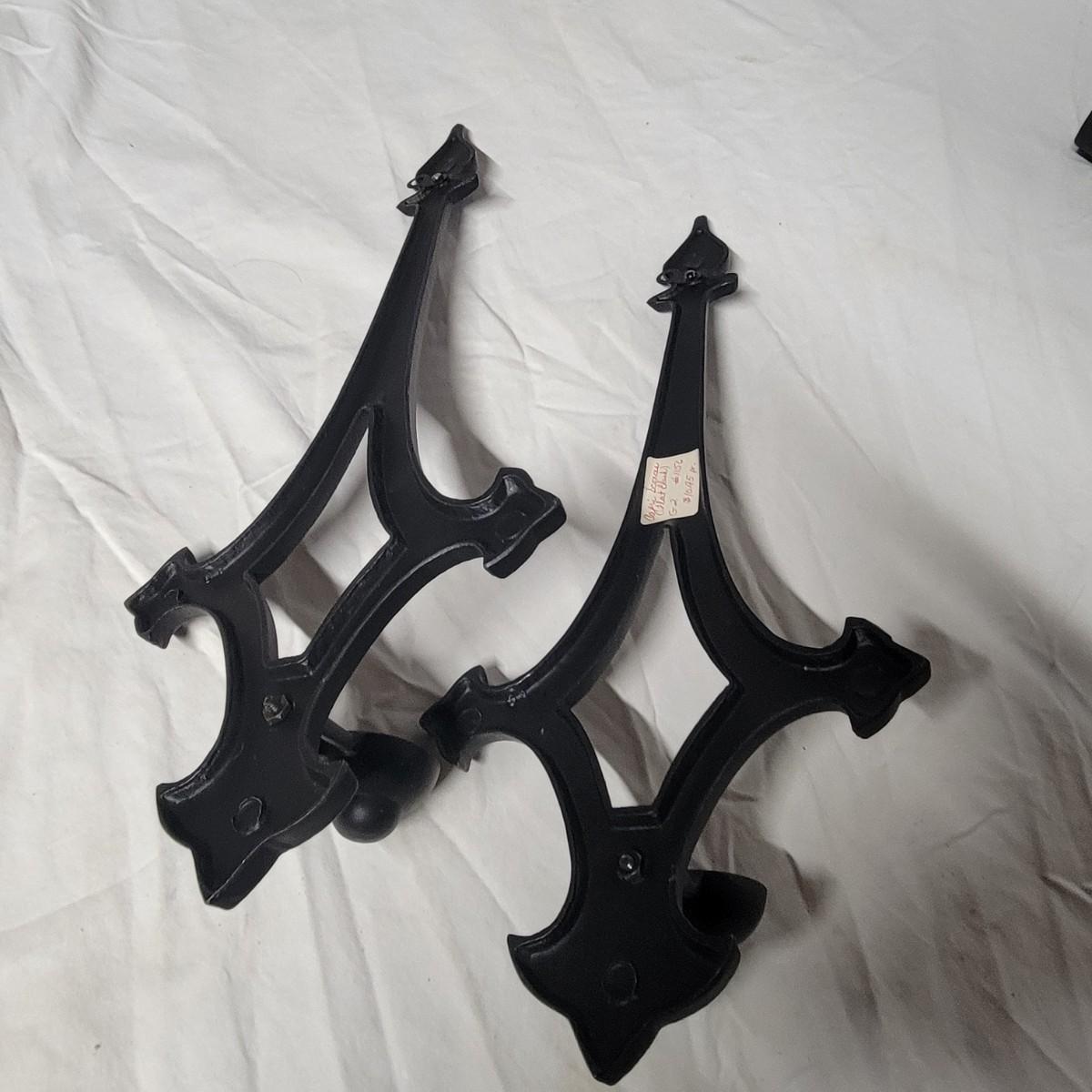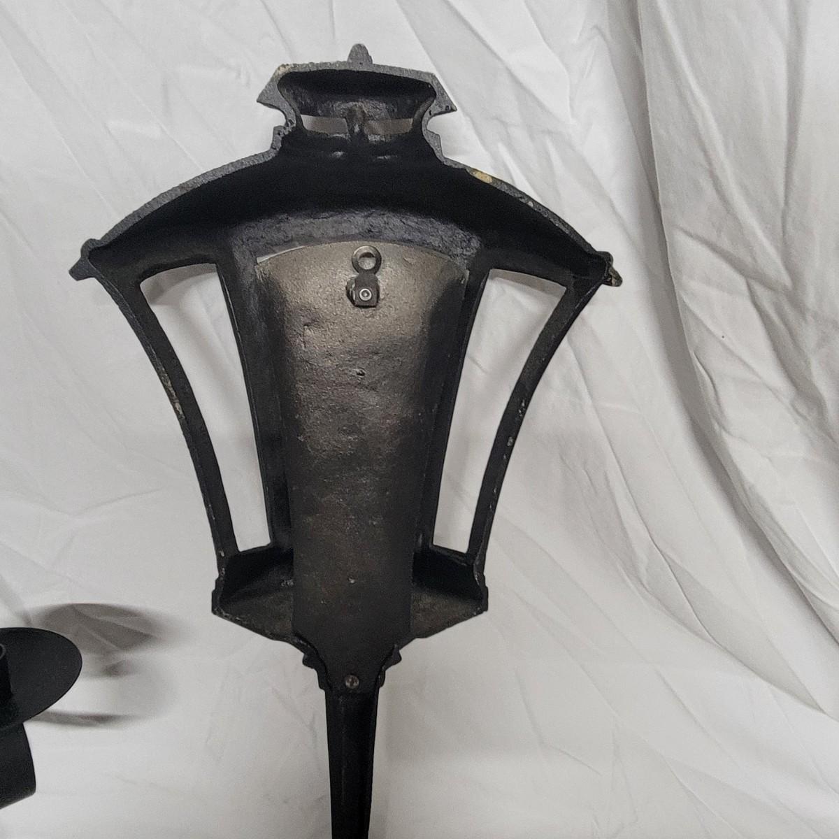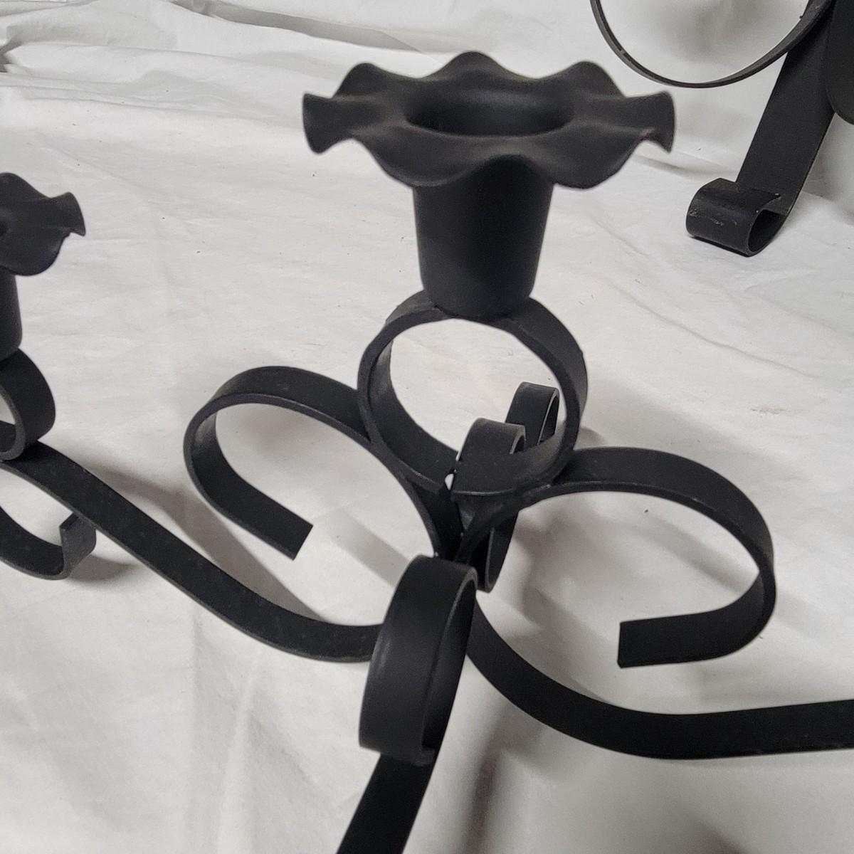 An assortment of eight metal candleholders and a small wall shelf. All items are made of metal and the largest sconce upright measures approximately 10" x 4.5" x 20"H. Local pickup only