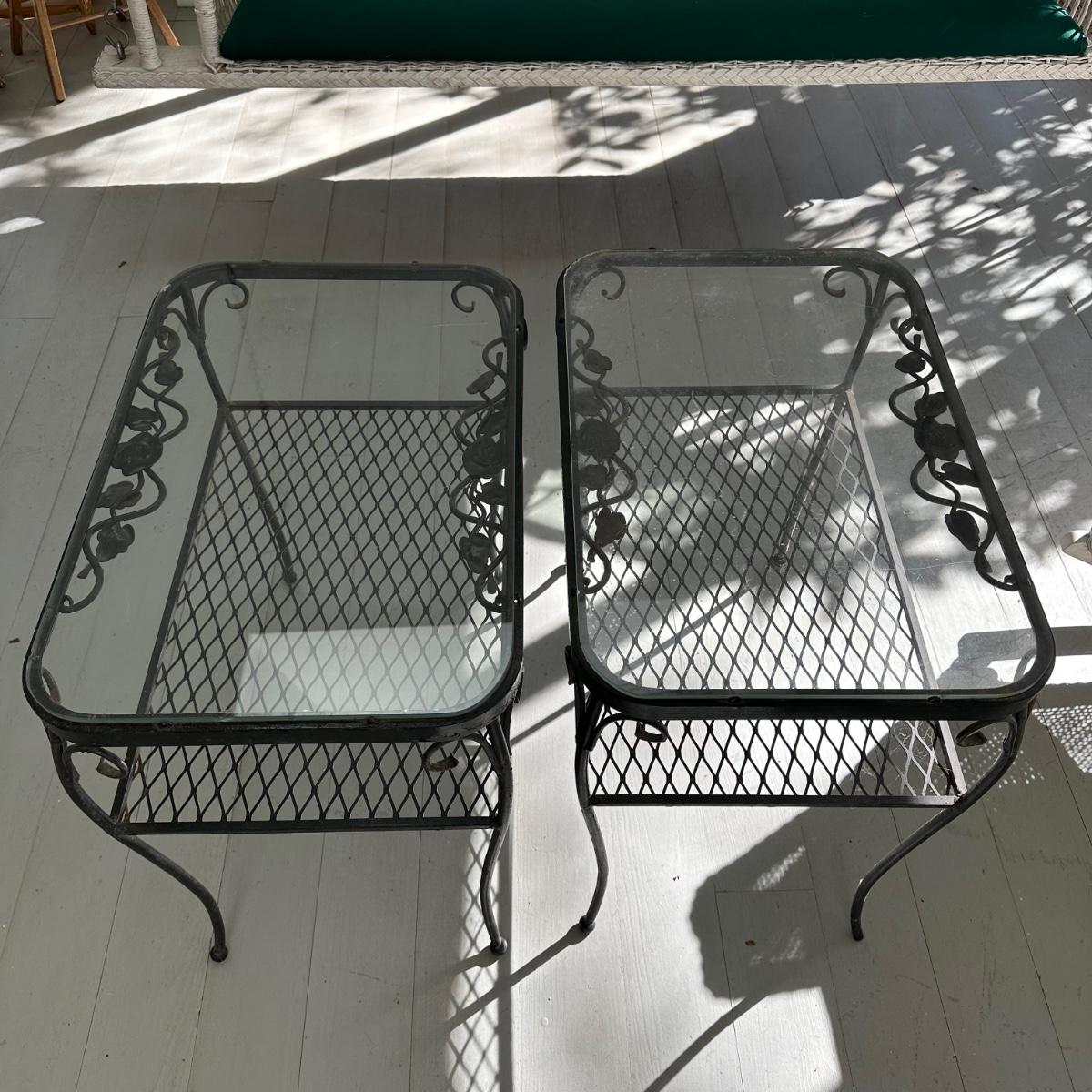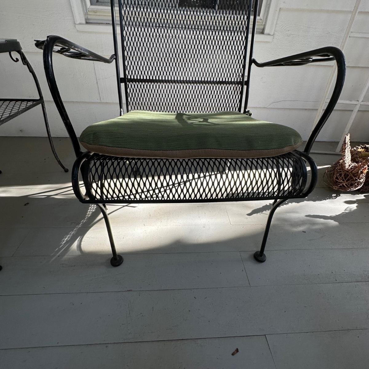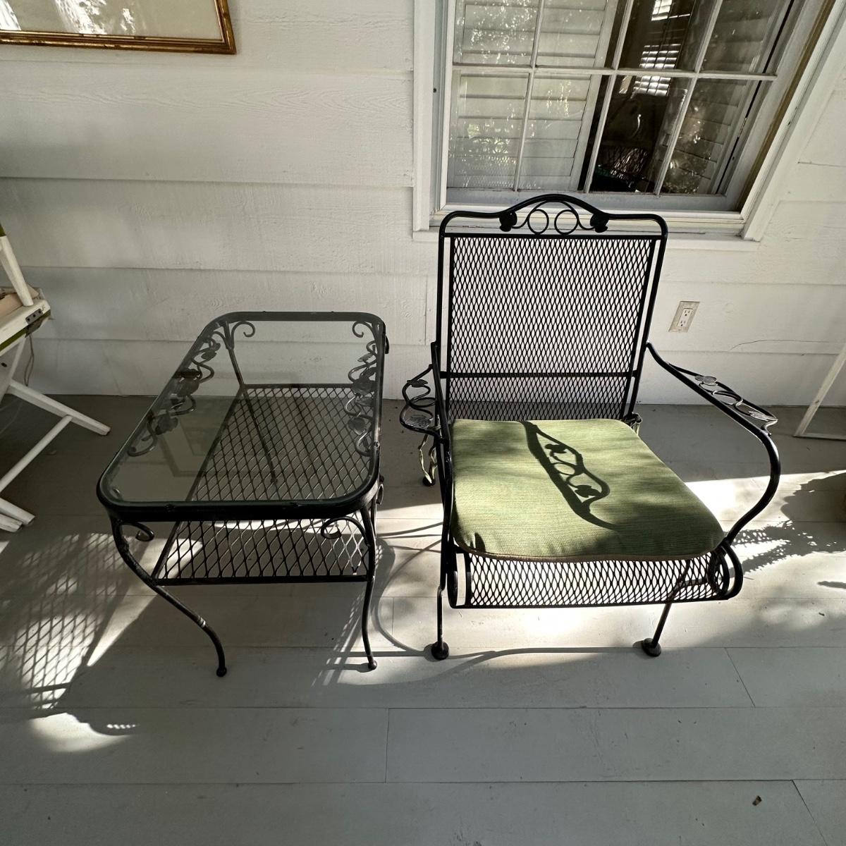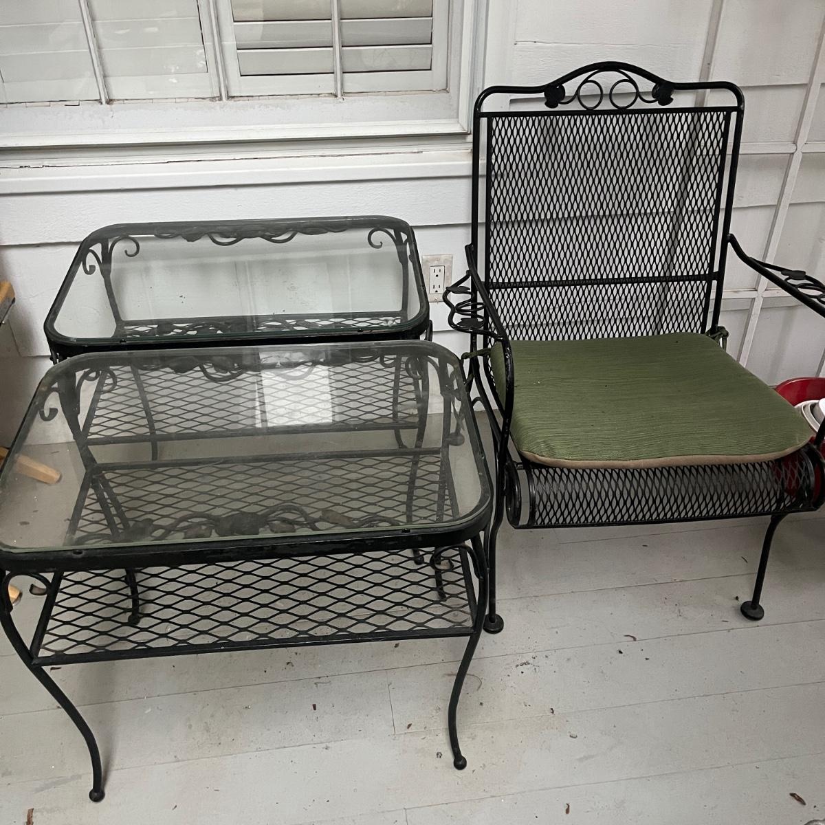 Black decorative metal framed chair with cushion and matching side tables. Chair measures 26.5” x 20” x 35”H with a 18” seat height. Both tables measure 17” x 25” x 24”H. Glass top is chipped on corner of one table. See photo. Local pickup only.