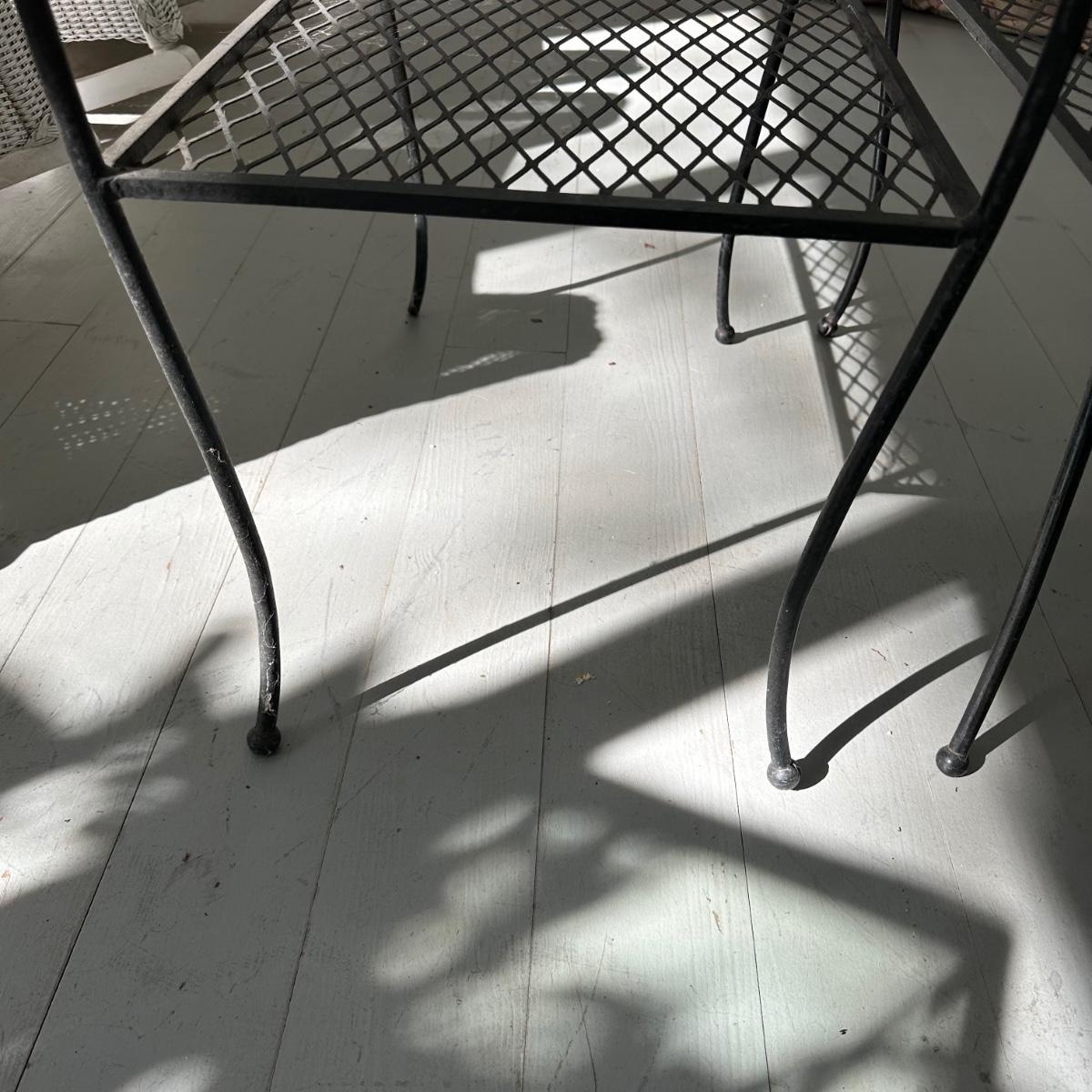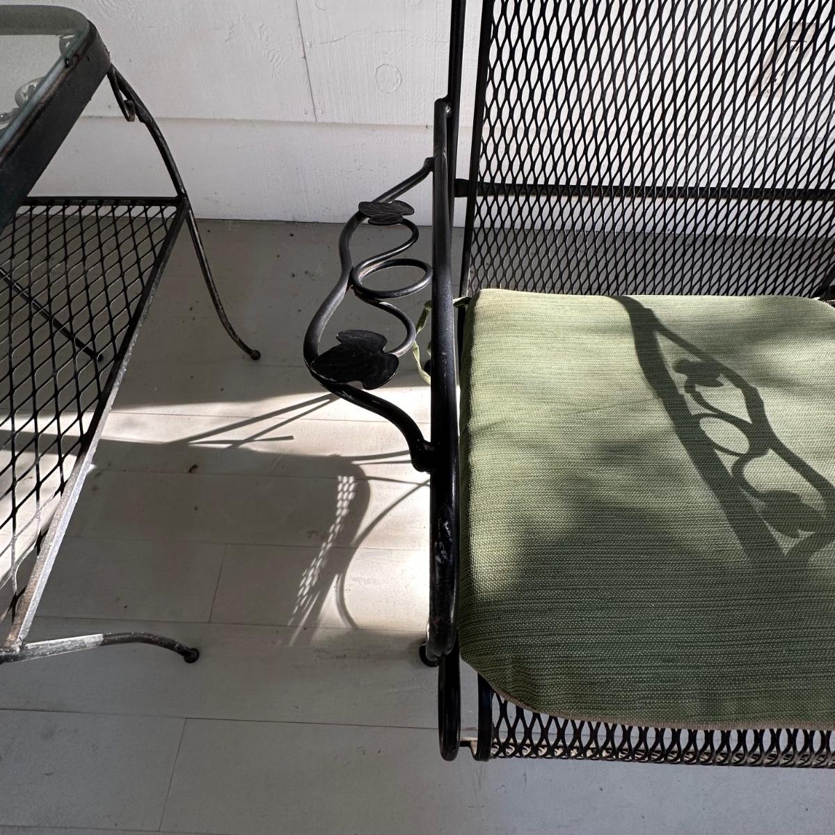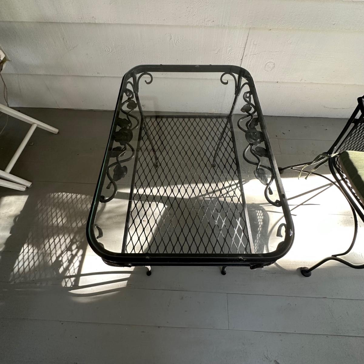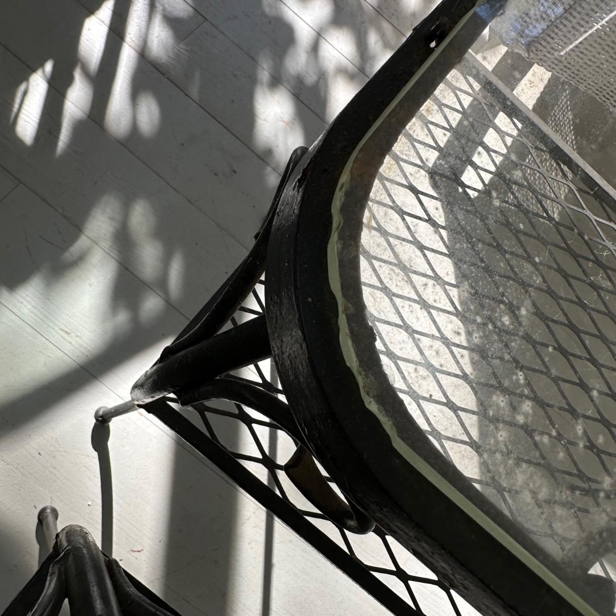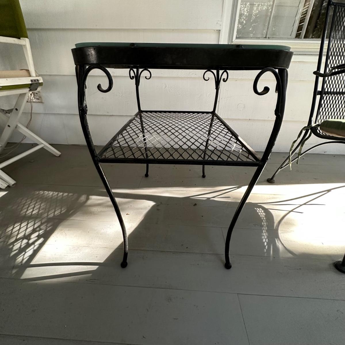 Black decorative metal framed chair with cushion and matching side tables. Chair measures 26.5” x 20” x 35”H with a 18” seat height. Both tables measure 17” x 25” x 24”H. Glass top is chipped on corner of one table. See photo. Local pickup only.