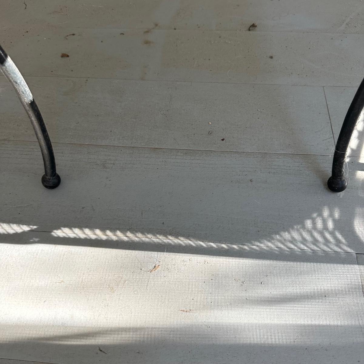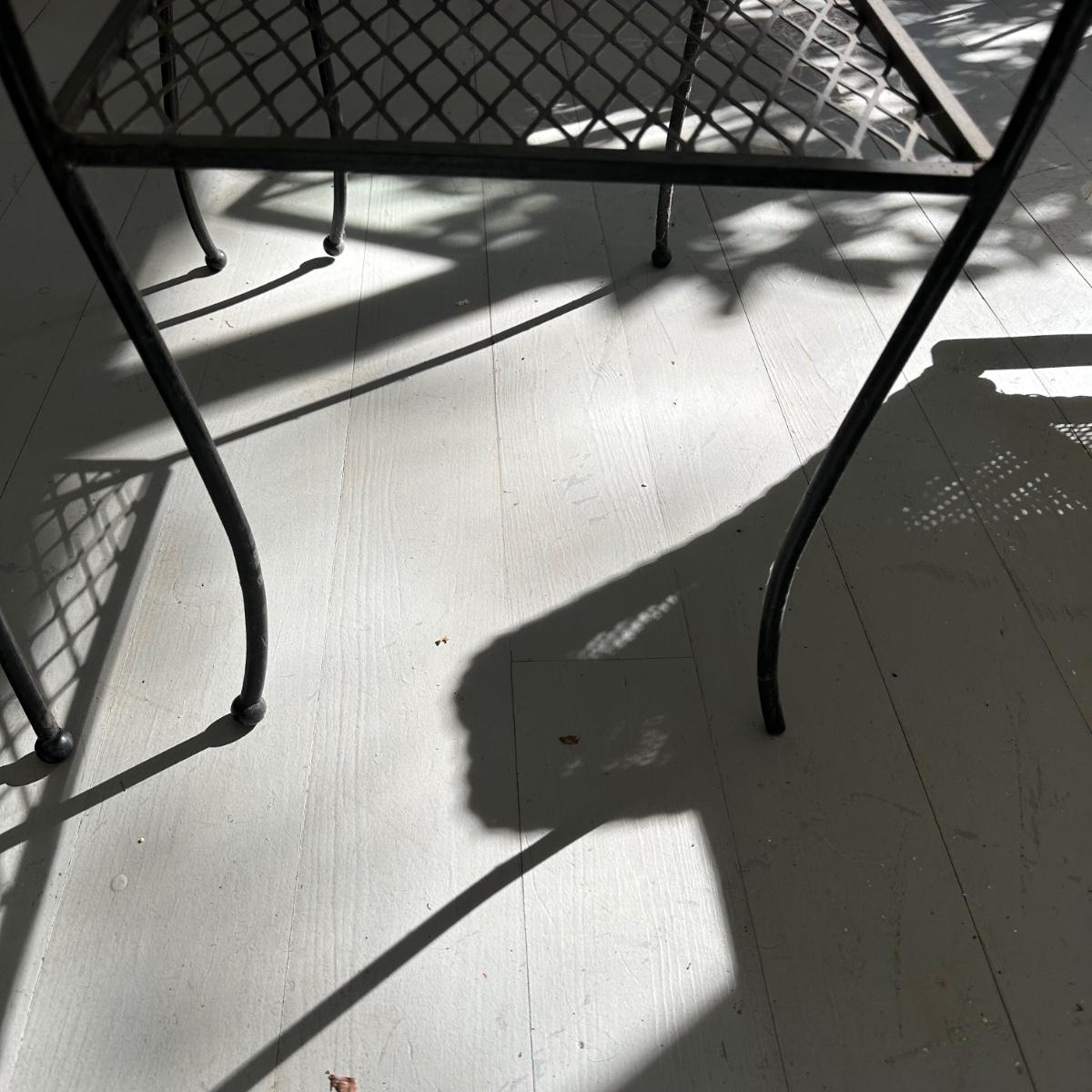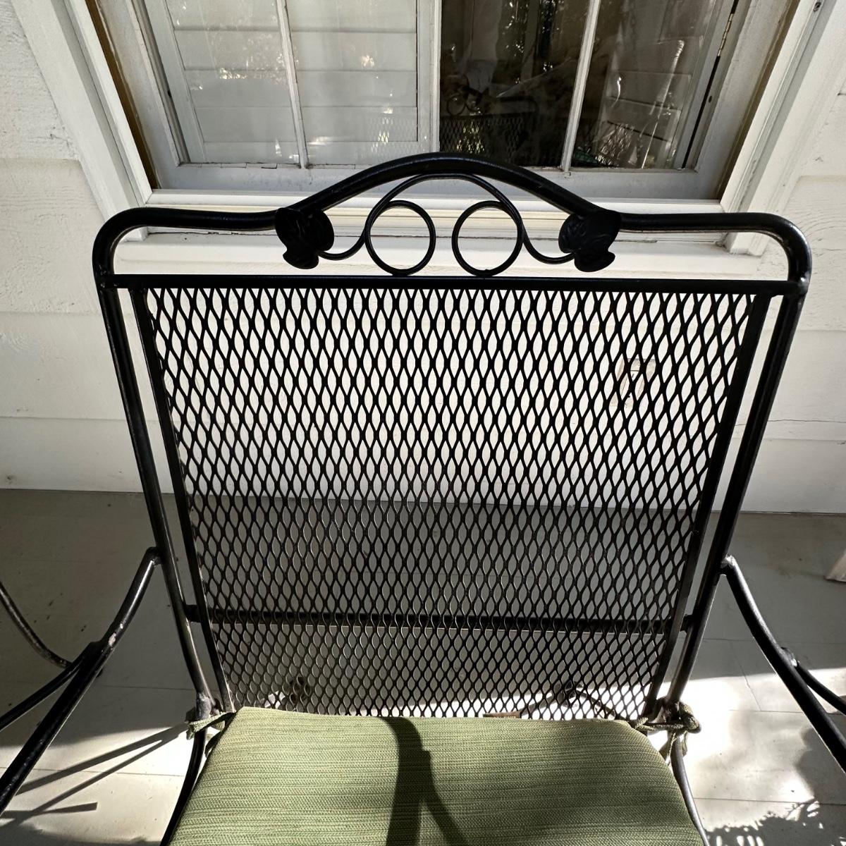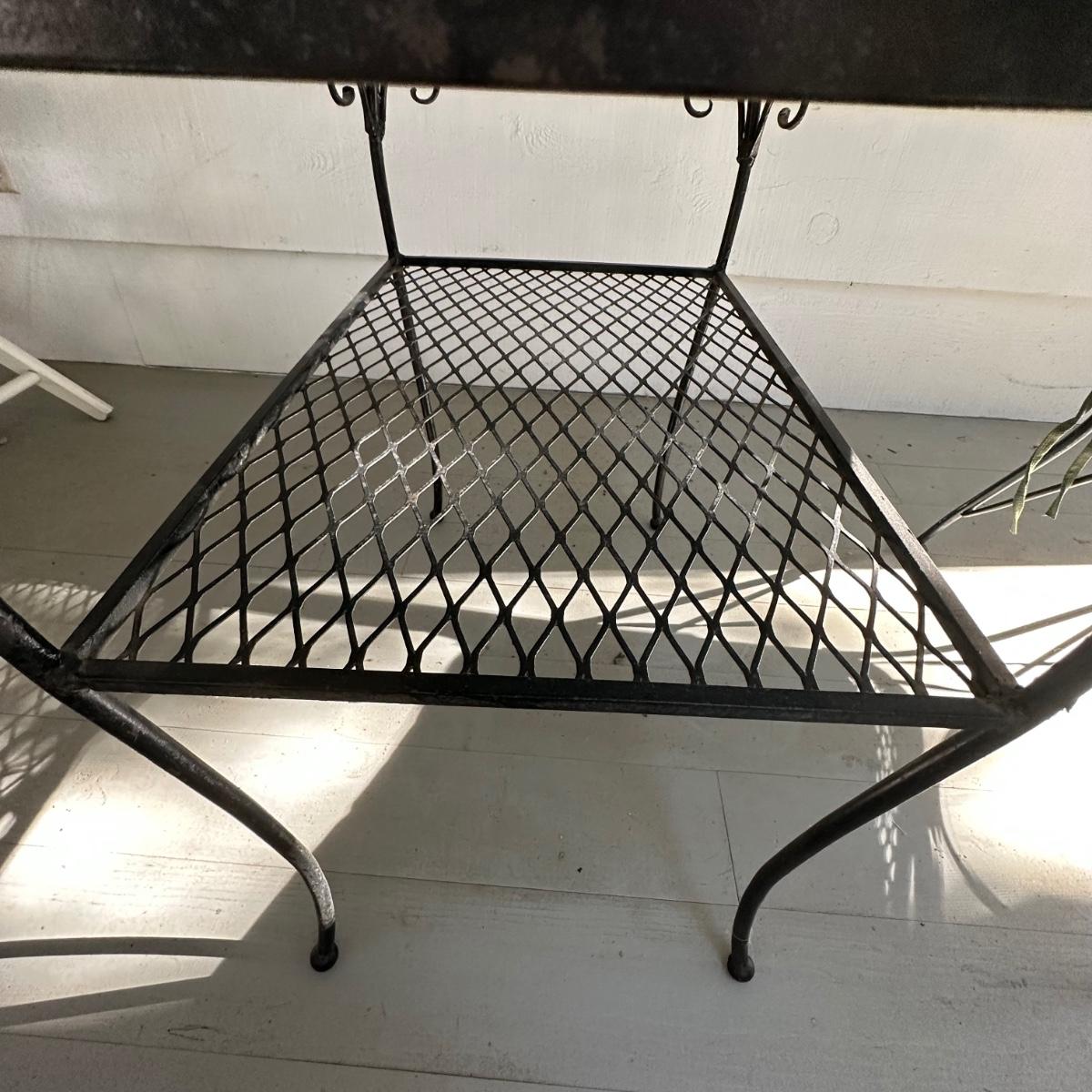 Black decorative metal framed chair with cushion and matching side tables. Chair measures 26.5” x 20” x 35”H with a 18” seat height. Both tables measure 17” x 25” x 24”H. Glass top is chipped on corner of one table. See photo. Local pickup only.