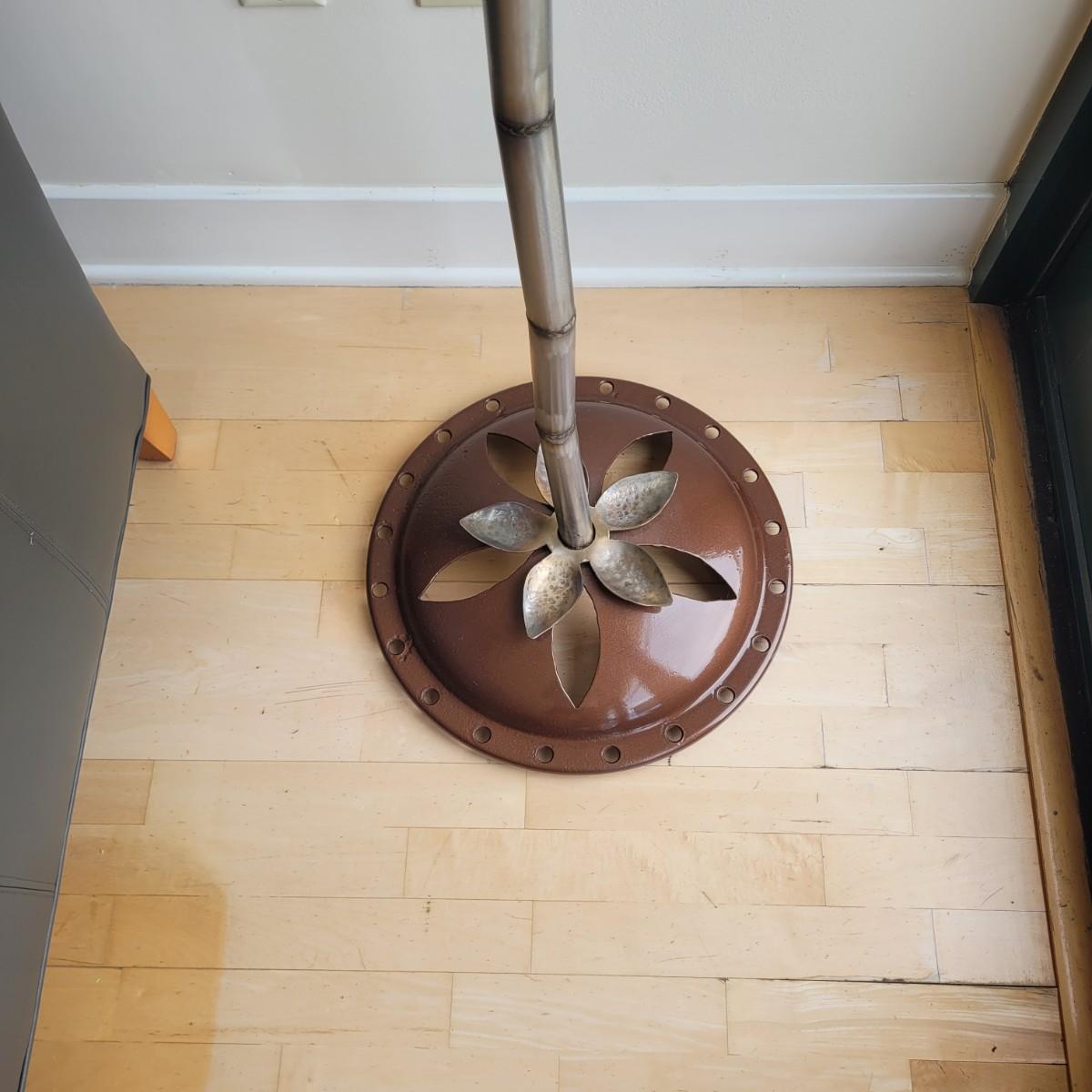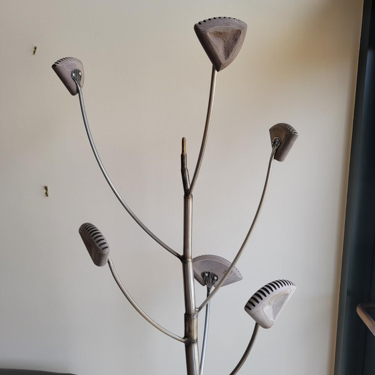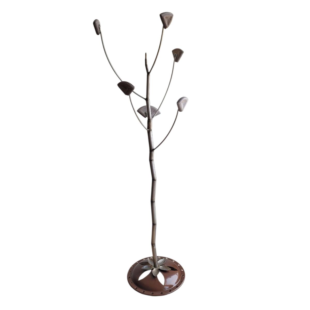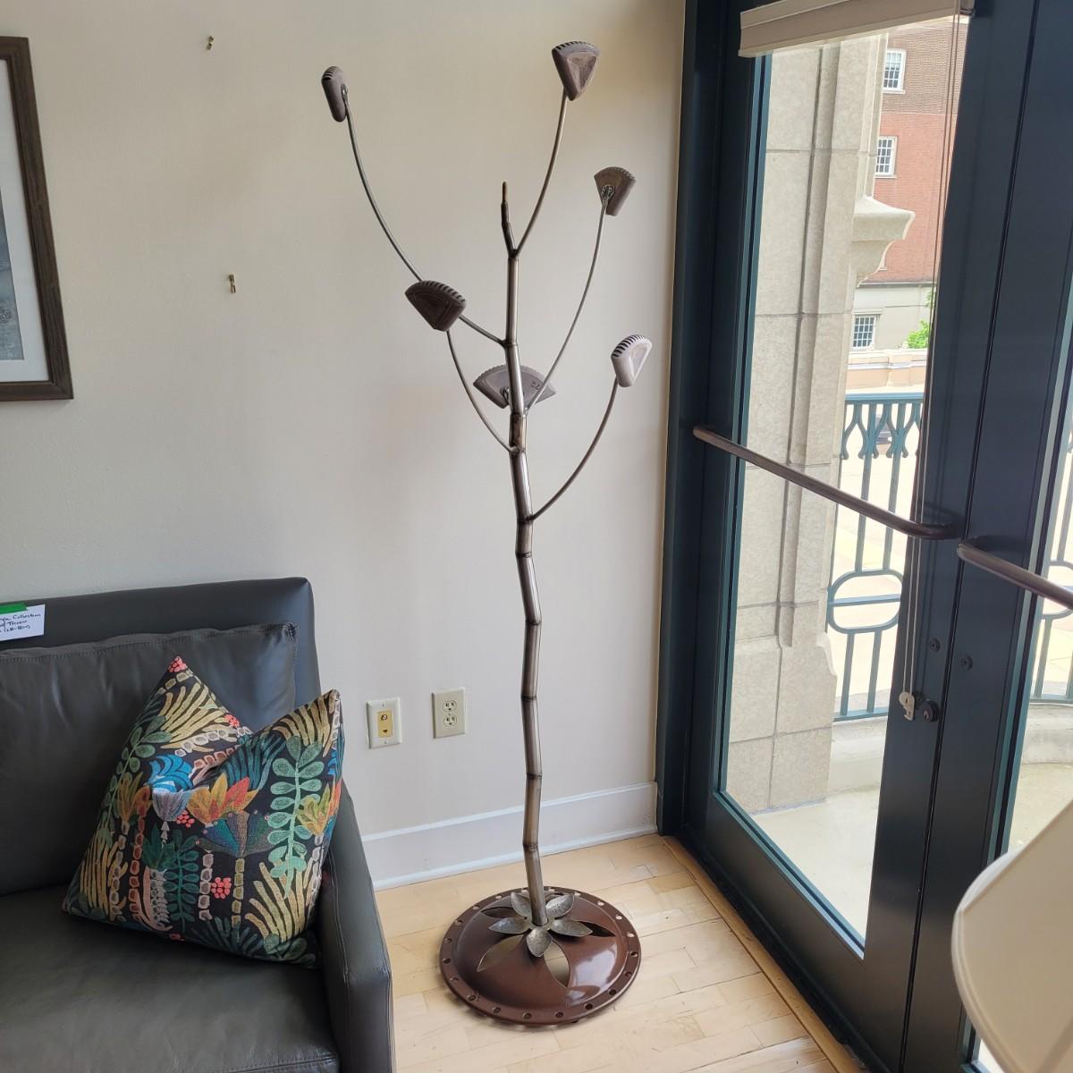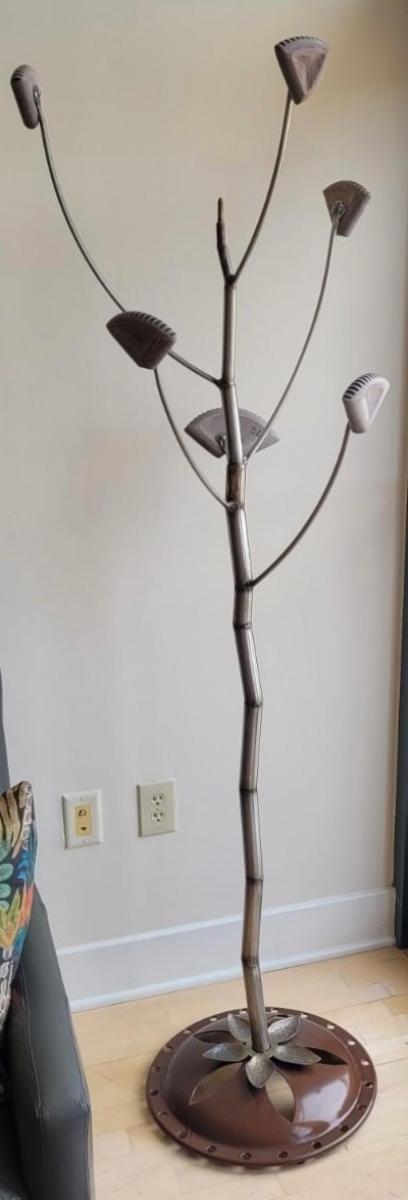 This lot includes one decorative metal coat rack in the shape of a tree. The tree appears to be an art fixture with function. The tree features six branches with carved wooden knobs for hanging coats or hats. The base is also made from metal and features leaf patterns. The tree measures approximately 18" x 18" x 74"H.
