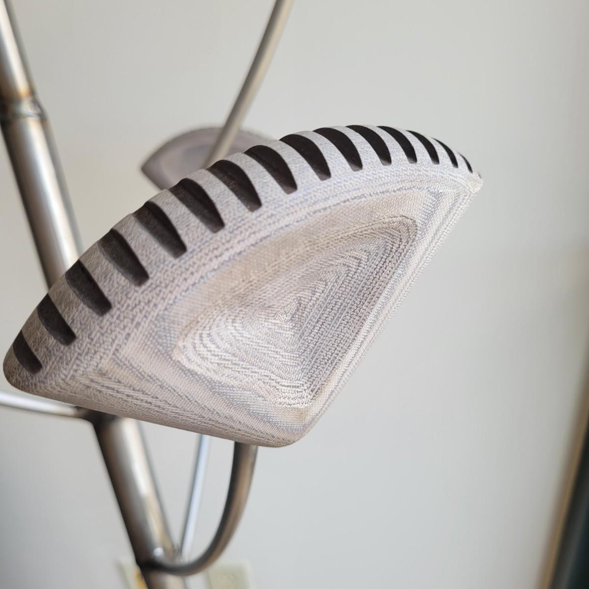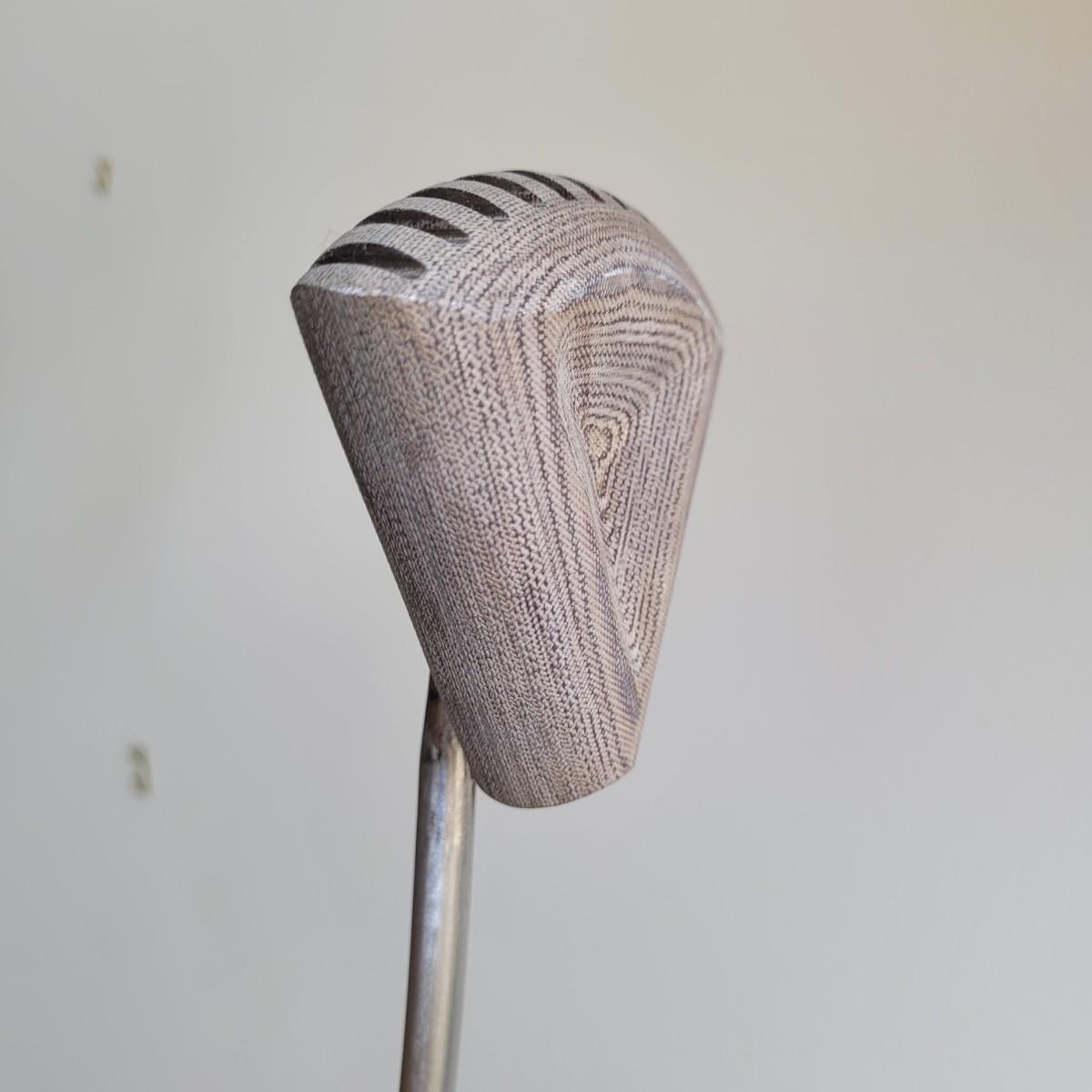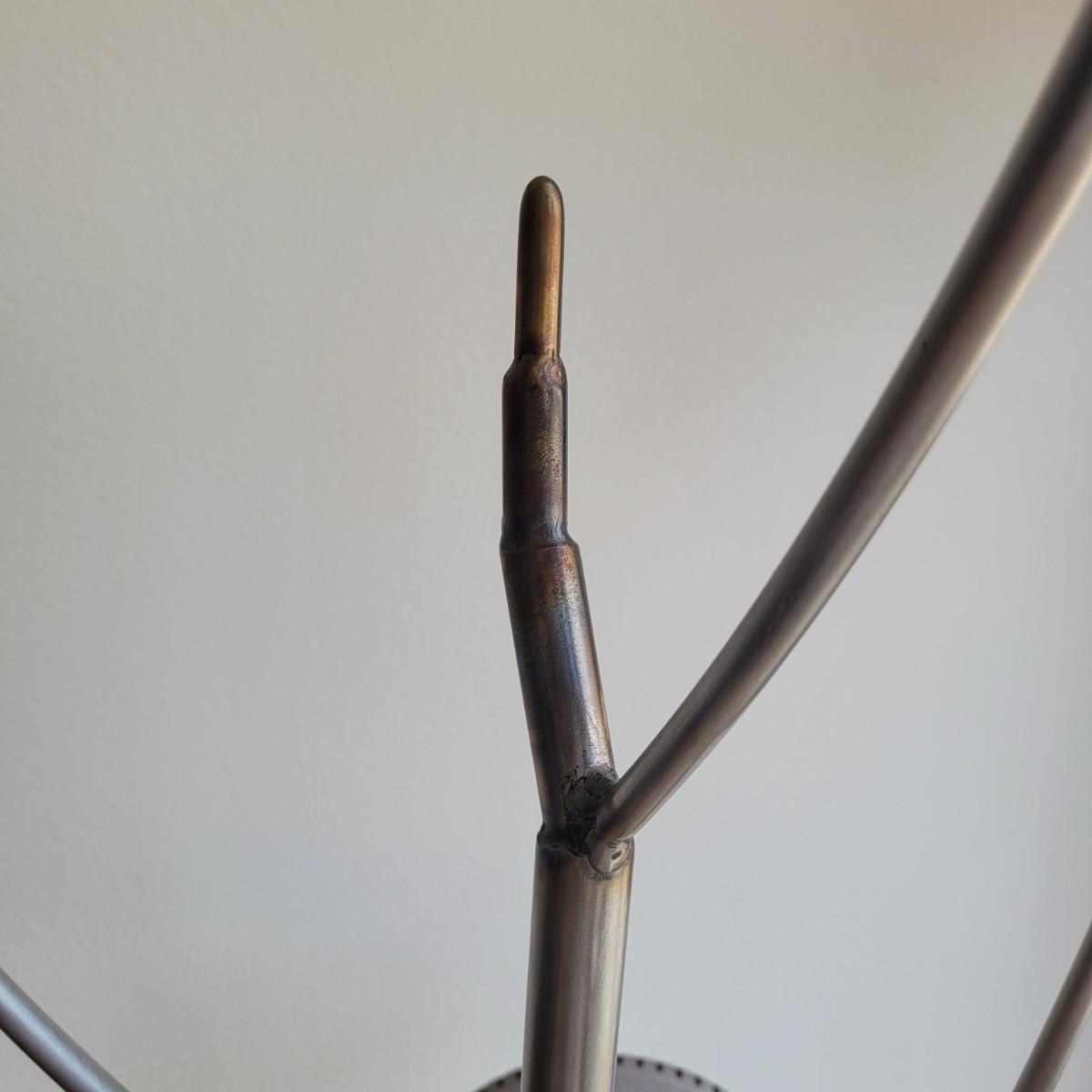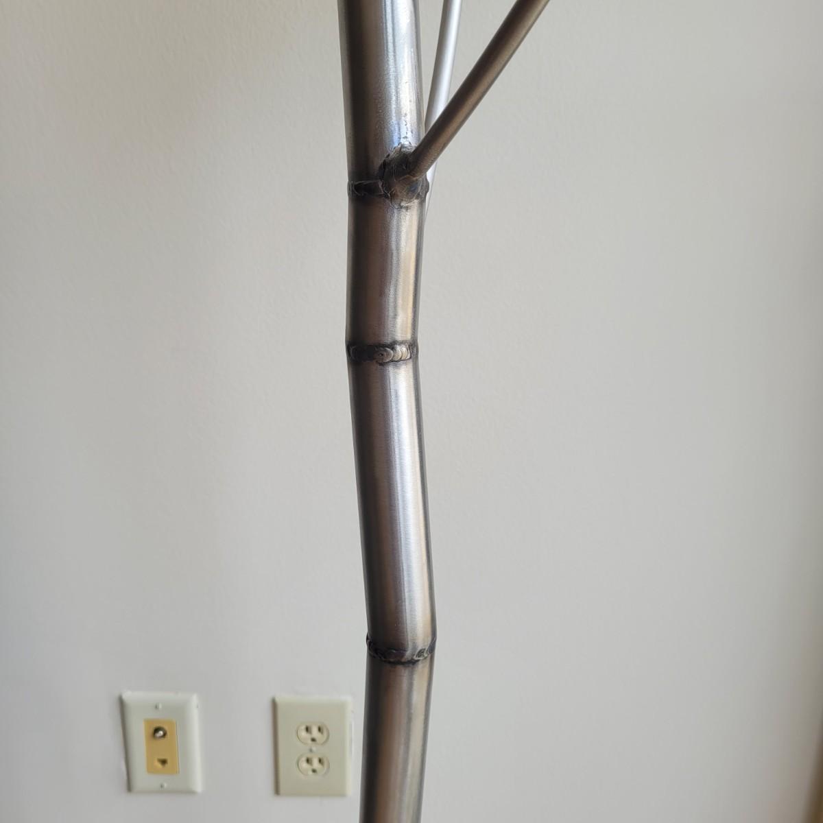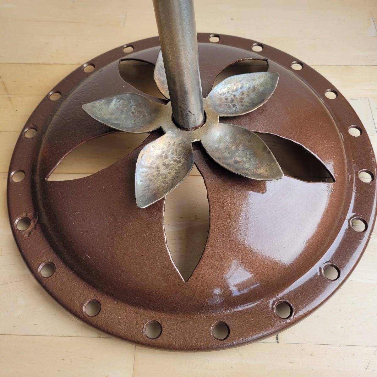 This lot includes one decorative metal coat rack in the shape of a tree. The tree appears to be an art fixture with function. The tree features six branches with carved wooden knobs for hanging coats or hats. The base is also made from metal and features leaf patterns. The tree measures approximately 18" x 18" x 74"H.