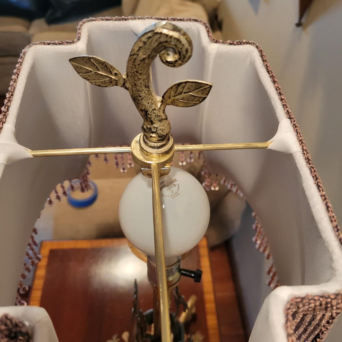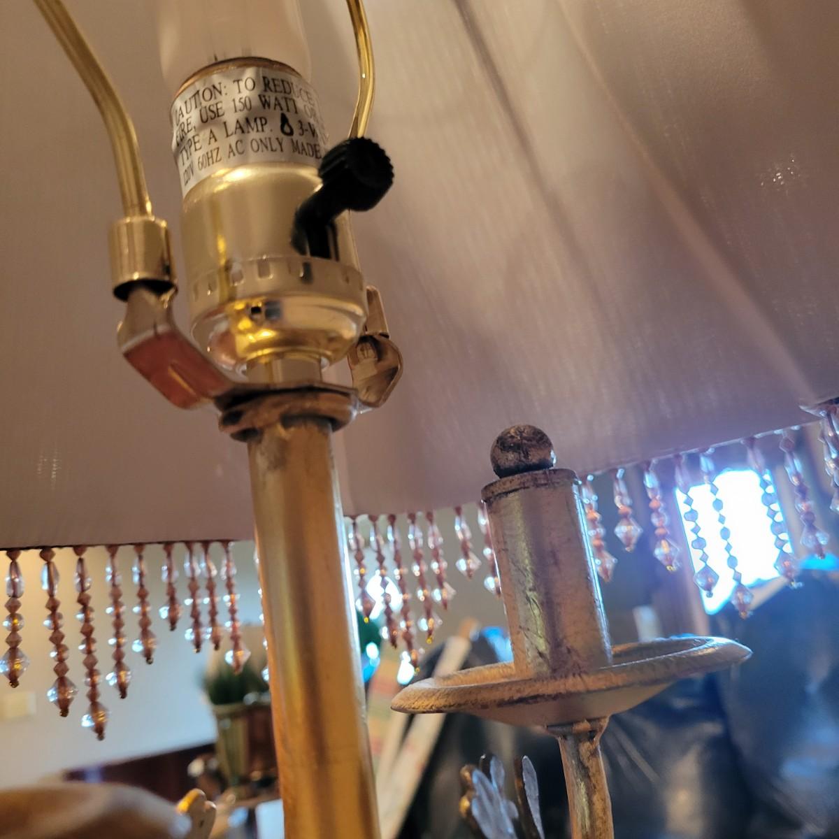 A decorative floral themed metal lamp that powered on when plugged in. It features a three way switch and a corduroy like fabric shade with a beaded fringe. Local pickup only
