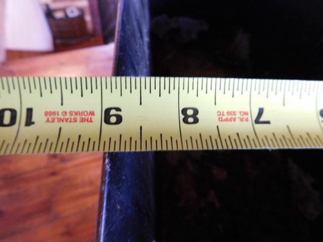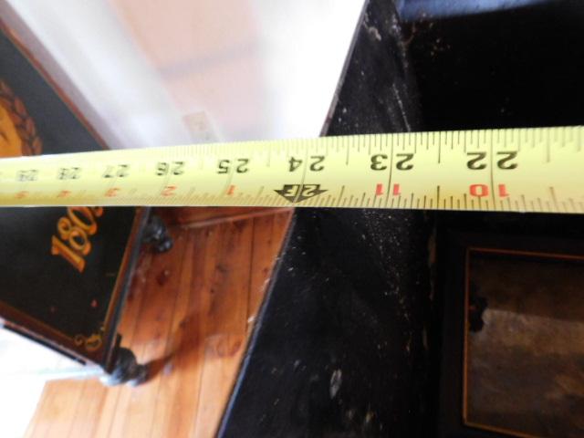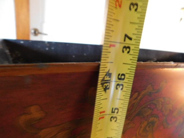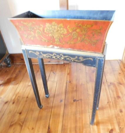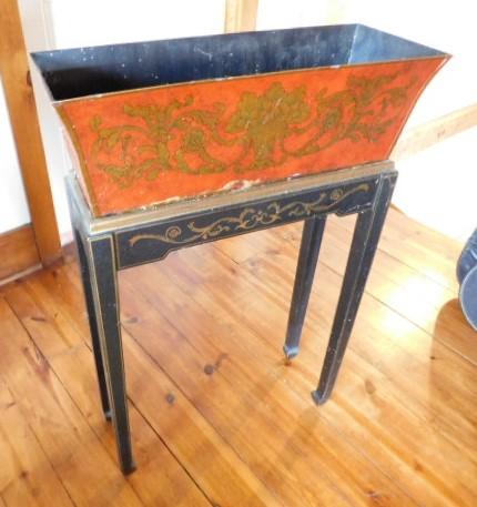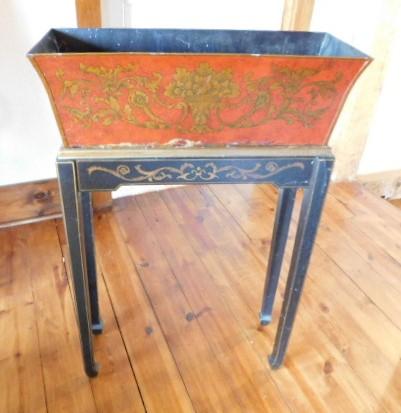 Decorative Metal Plant Box with Lacquer Finish Wood Stand measurements in pictures. Upstairs item