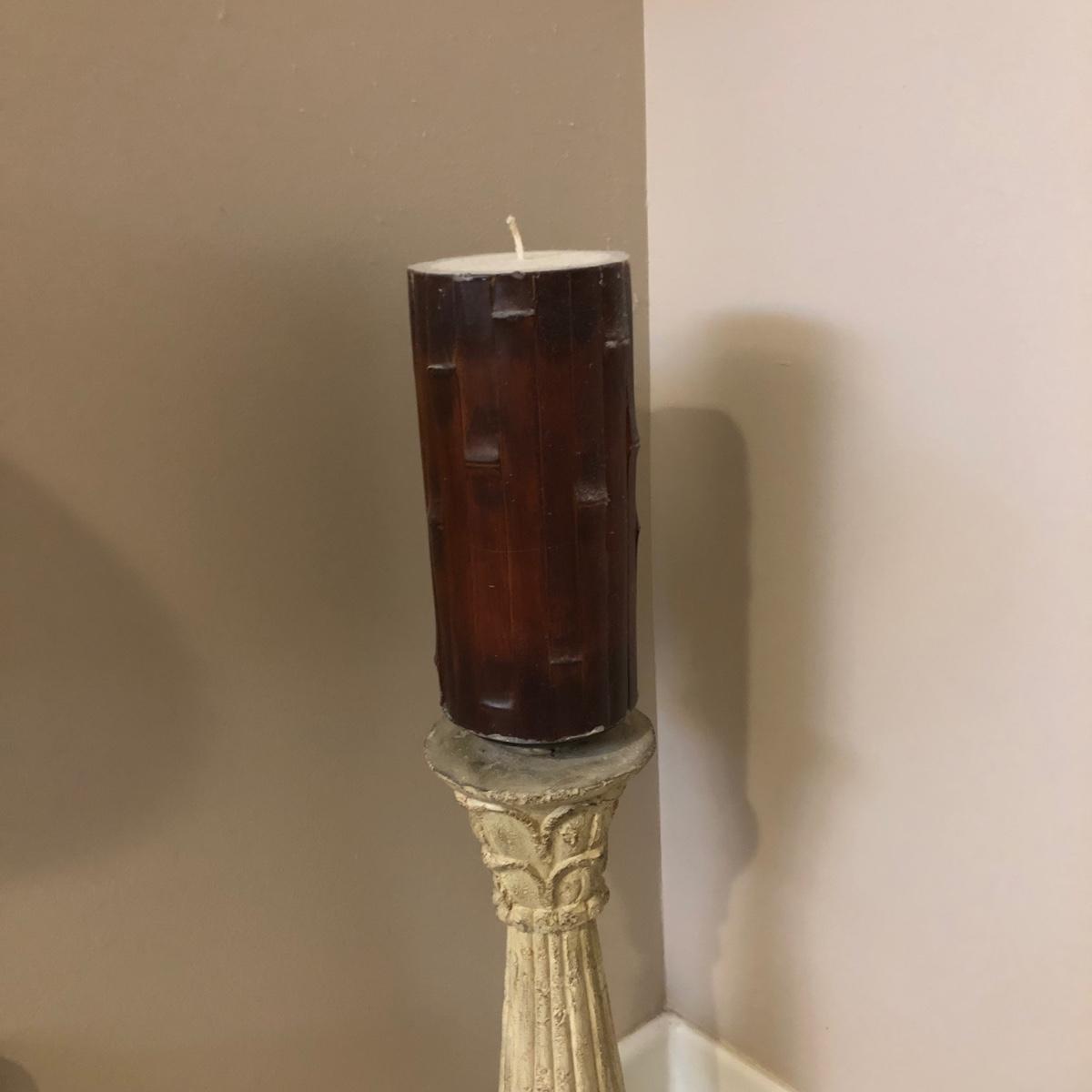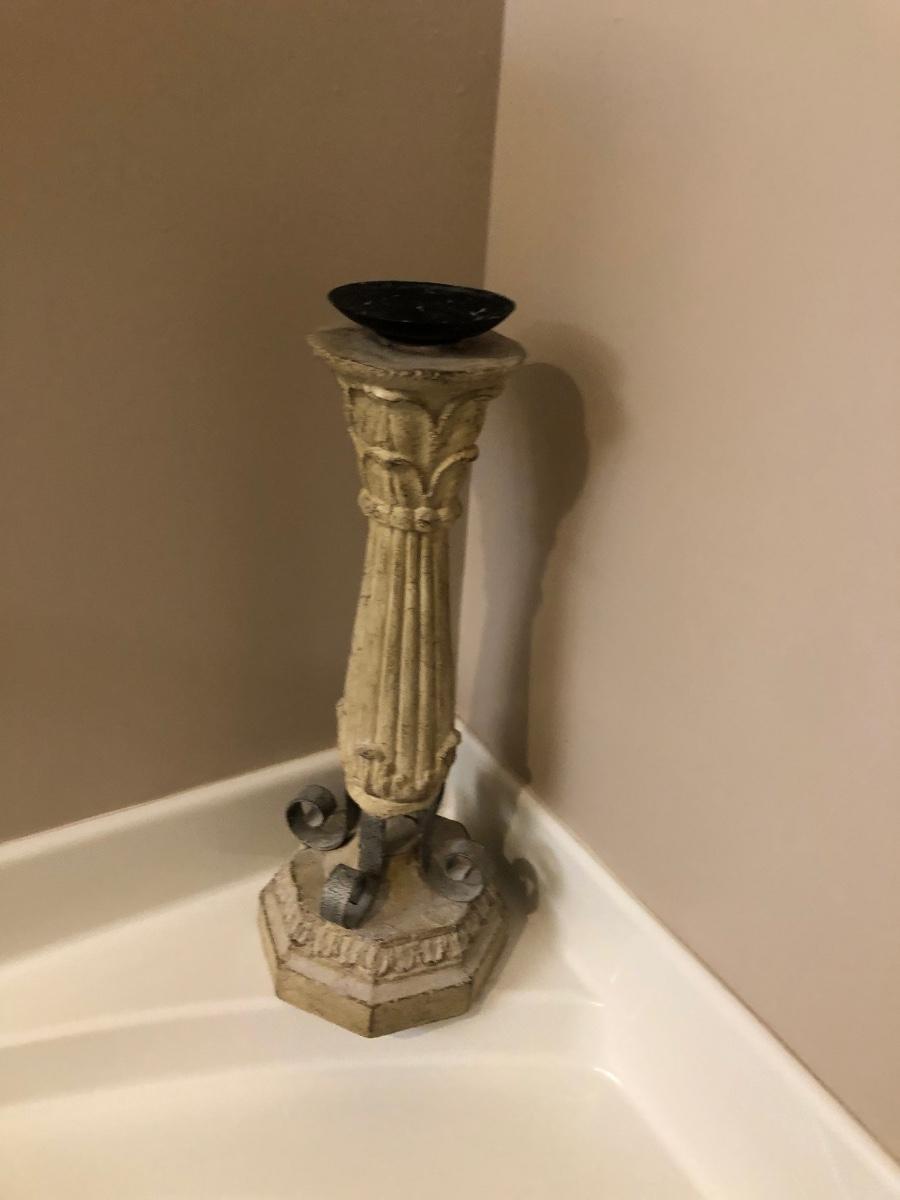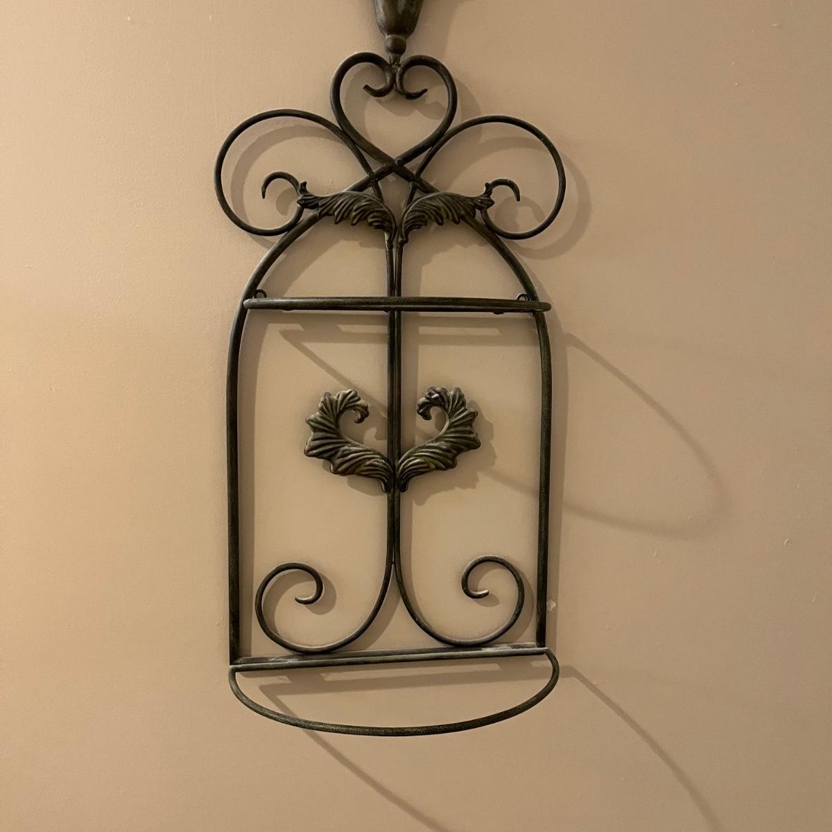 The whole hanging metal planter is metal. The candle holder is made from heavy resin. The candle is unscented. The bottom prongs of the pedestal is metal.