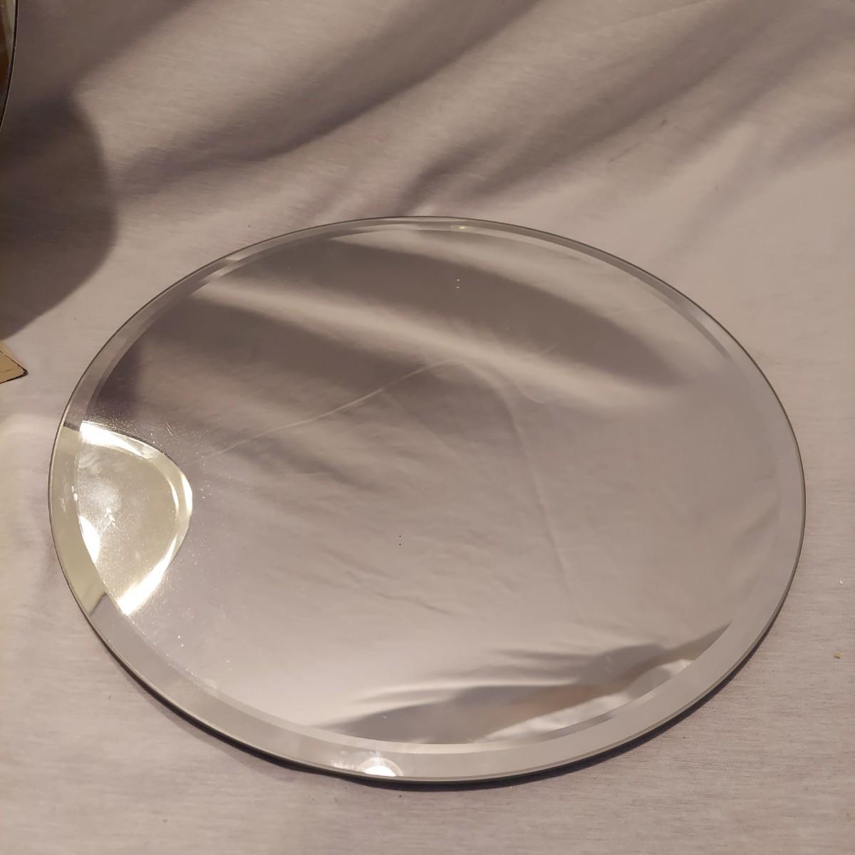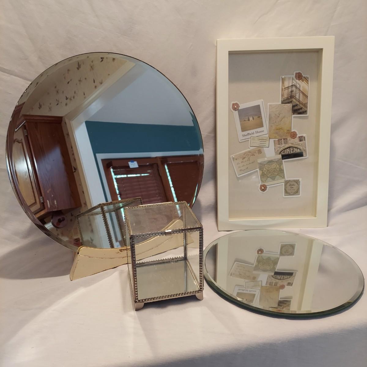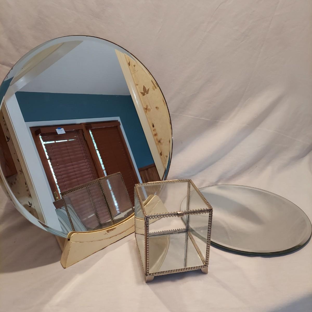 Two large round decorative mirrors, a small glass and mirror display box and a wooden shadow box. The shadow box is 11" x 2" x 18.5"H. The glass and metal box with mirror bottom is 5" x 5" x 6"H. The flat mirror has 13" diameter. The large mirror on a wood stand is 18" x 7" x 18"H. This mirror has some issues around the edge due to age. Please see photos. Local Pickup Only