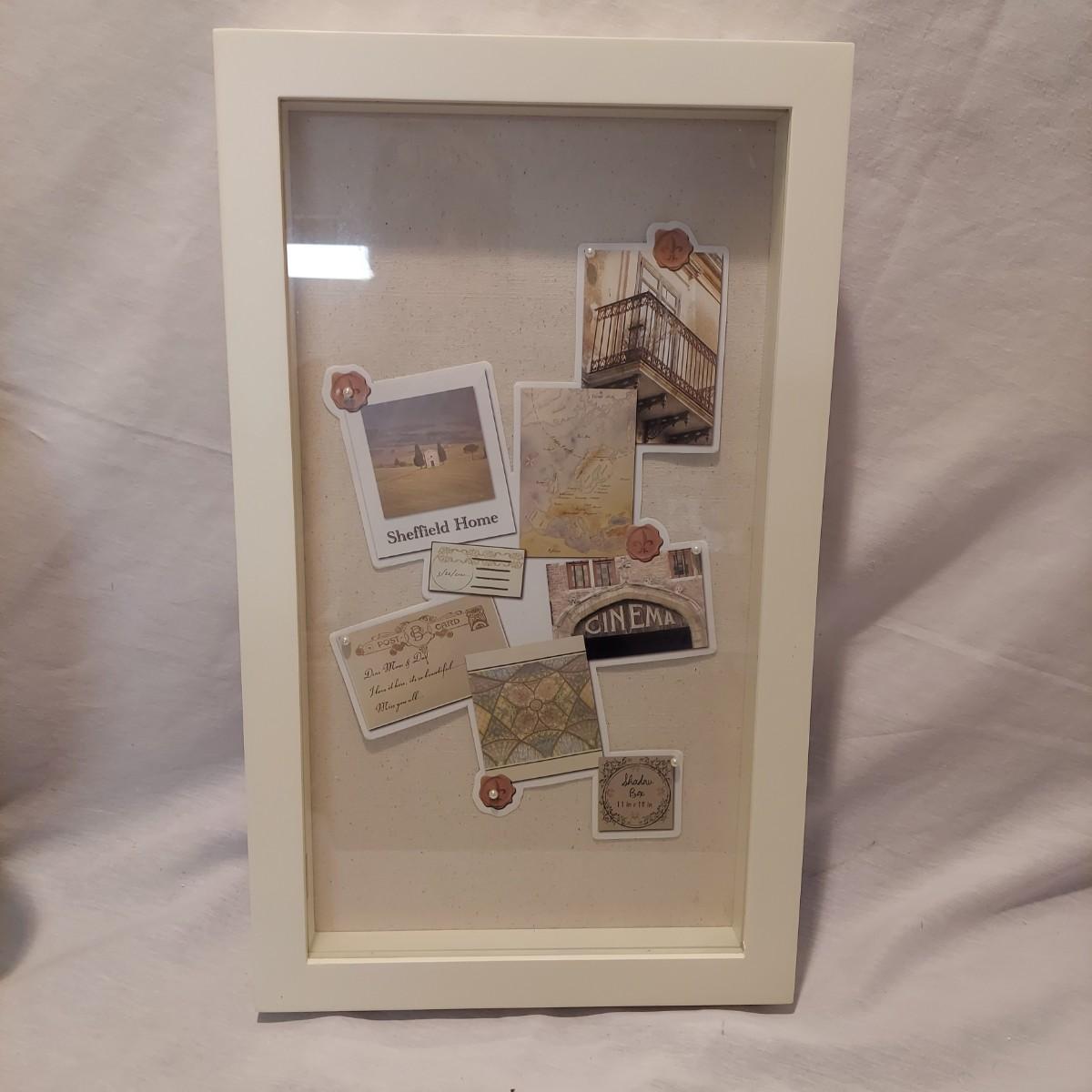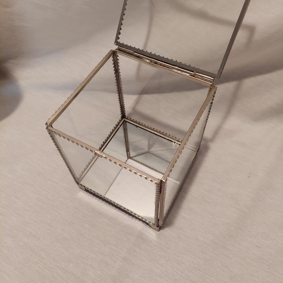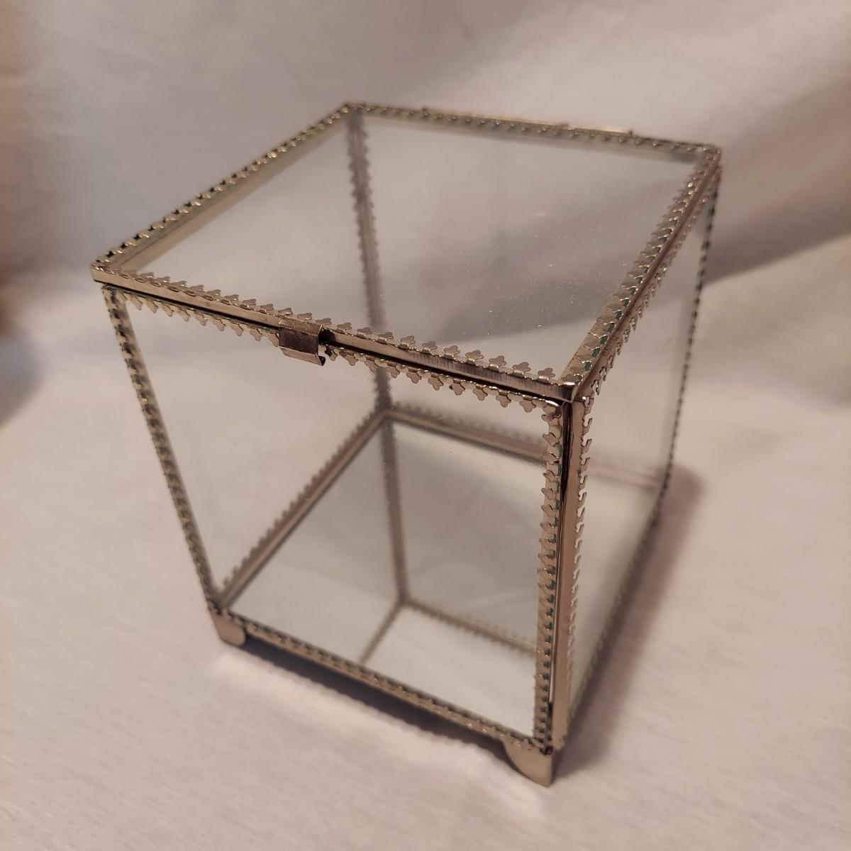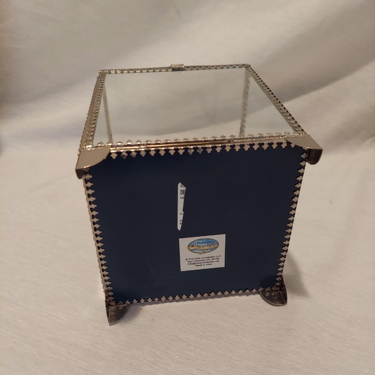 Two large round decorative mirrors, a small glass and mirror display box and a wooden shadow box. The shadow box is 11" x 2" x 18.5"H. The glass and metal box with mirror bottom is 5" x 5" x 6"H. The flat mirror has 13" diameter. The large mirror on a wood stand is 18" x 7" x 18"H. This mirror has some issues around the edge due to age. Please see photos. Local Pickup Only